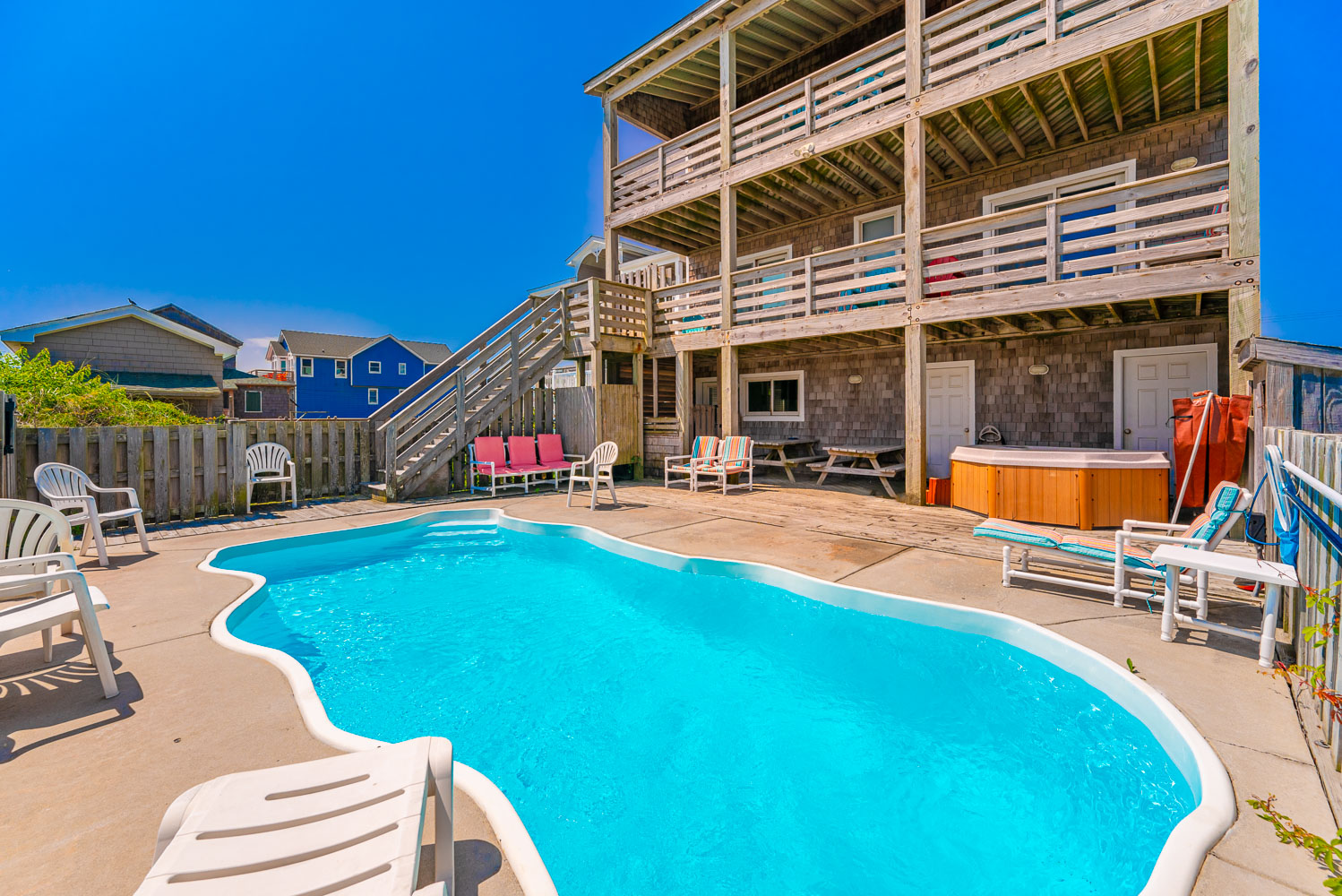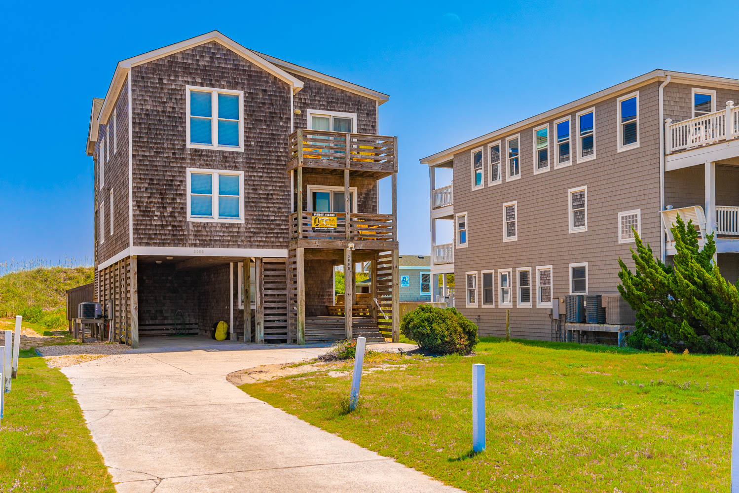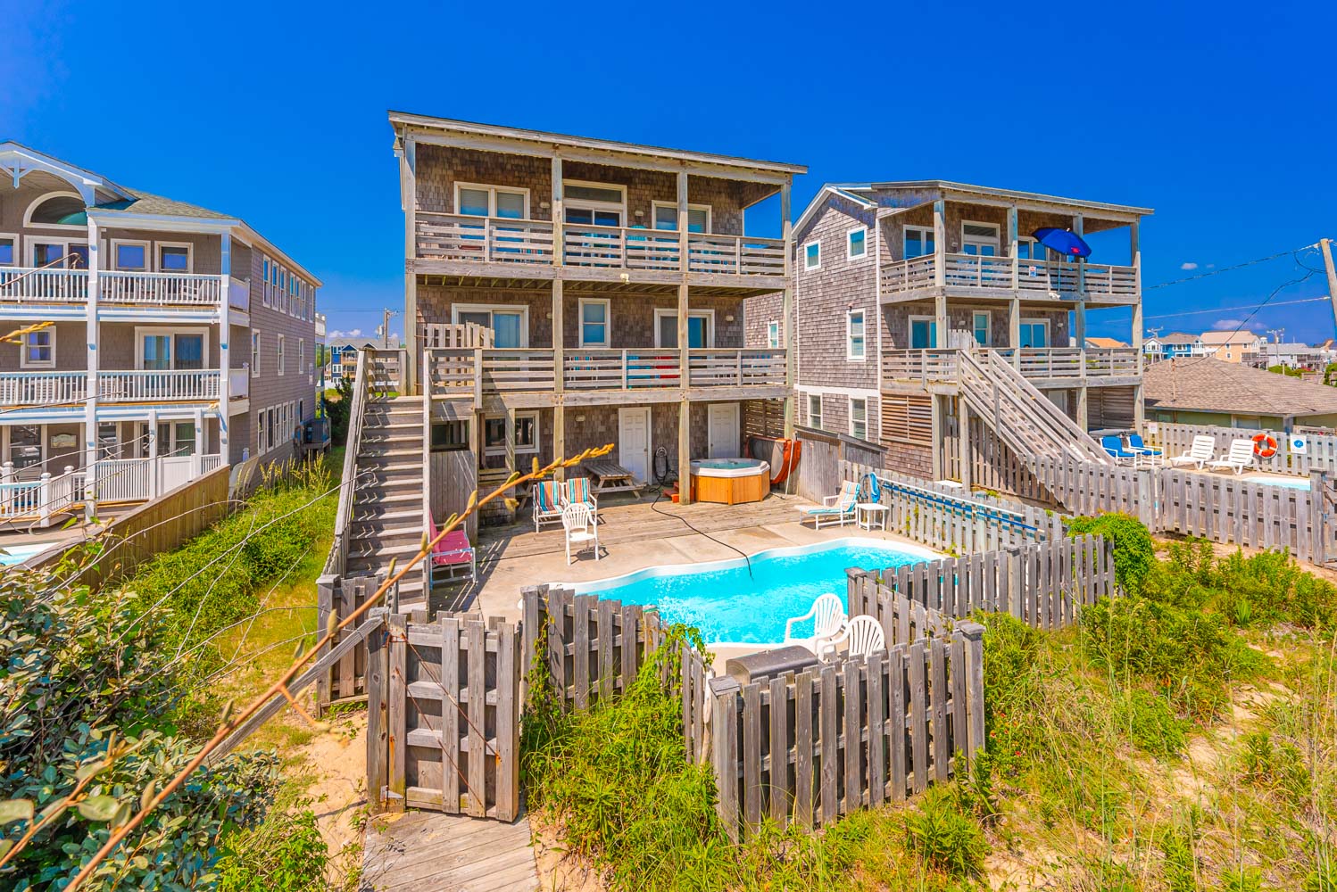 Ground Level: Parking for 4 Cars, Covered Entry, Rec. Room w/Pool Table, Half Bath, Wet Bar, Full Size Refrigerator, Microwave, Large Screen TV, 2 Covered Decks (1 Opens to Patio and Hot Tub Area), Private Swimming Pool - Open Seasonally, Hot Tub, Enclosed Outside Shower, Gas Grill, Charcoal Grill, and Walkway to Beach w/Dune Top Deck.