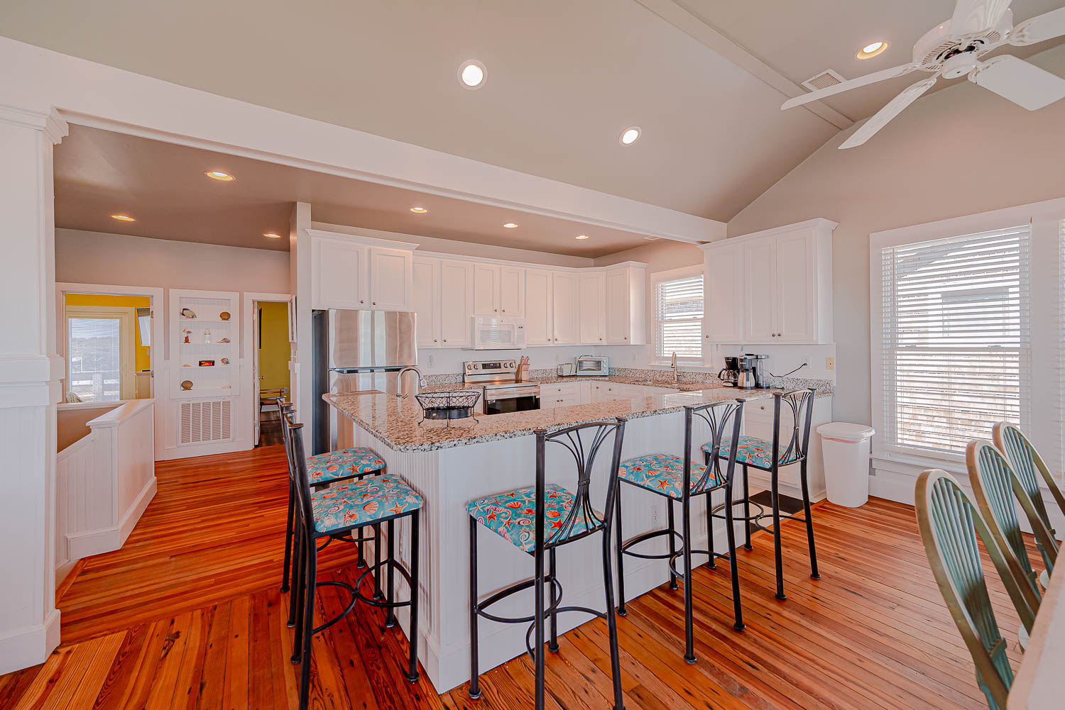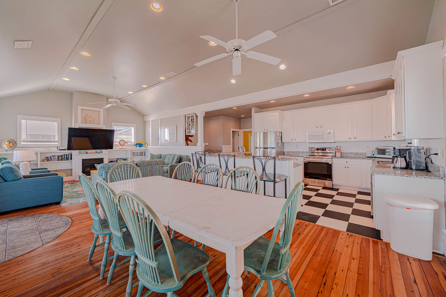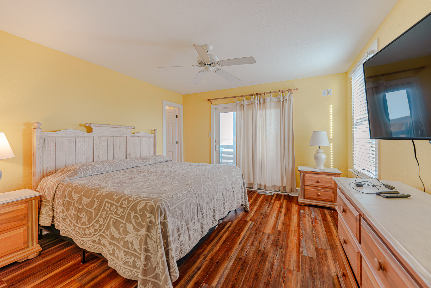 Top Floor: Living/Dining/Kitchen Area, Great Ocean Views, TV, 2 Bedrooms (Private Suite w/King, TV, Full Bath w/Tub/Shower; 1 w/Queen), Full Hall Bath w/Tub/Shower, Sun Deck, and Covered Deck w/Great Ocean Views.