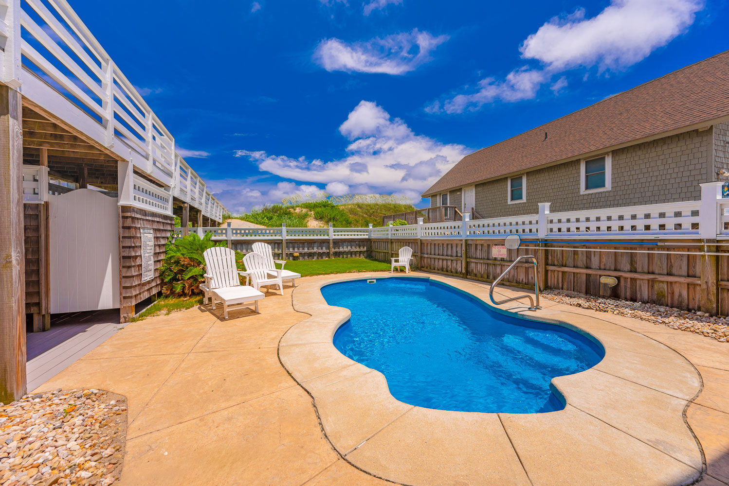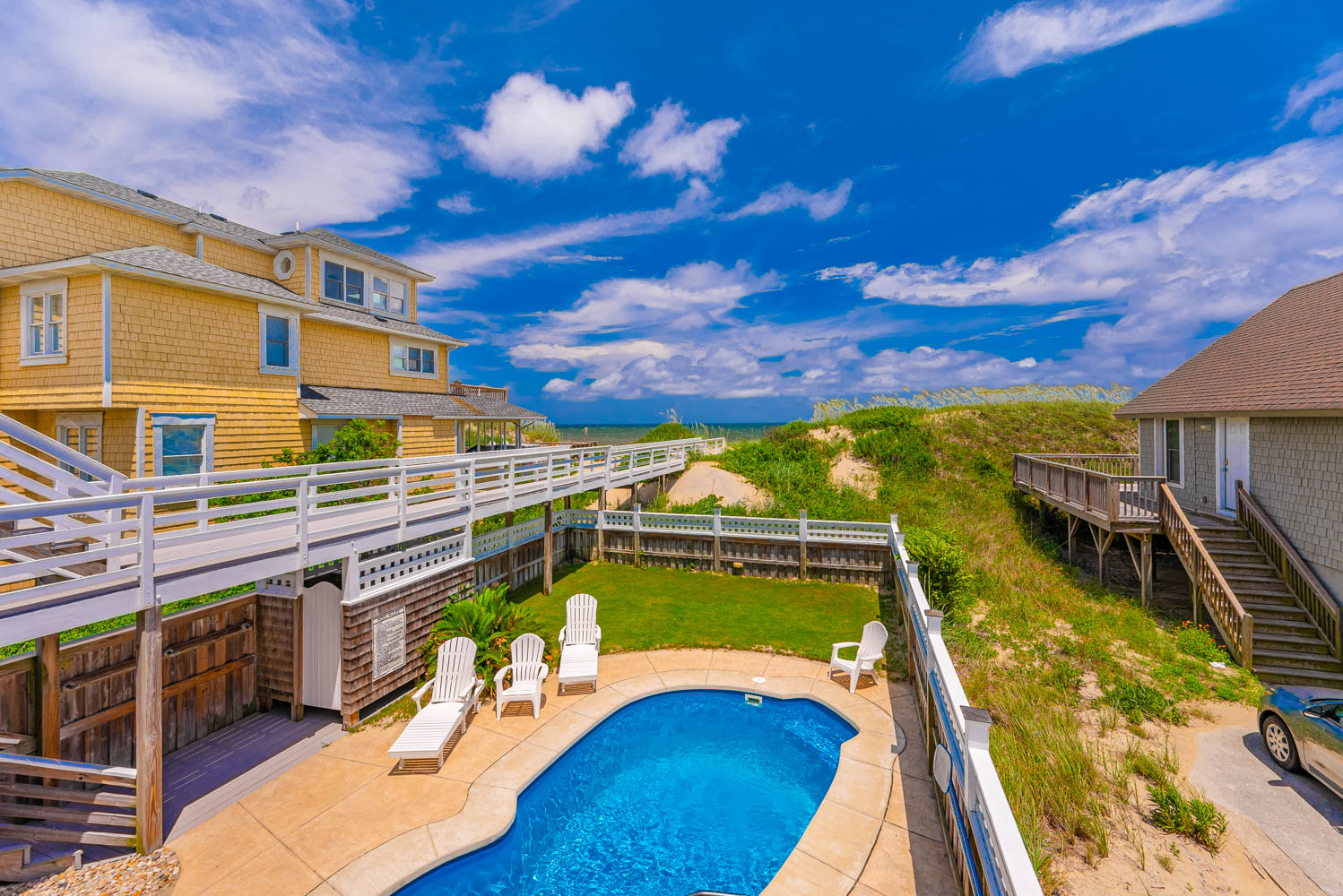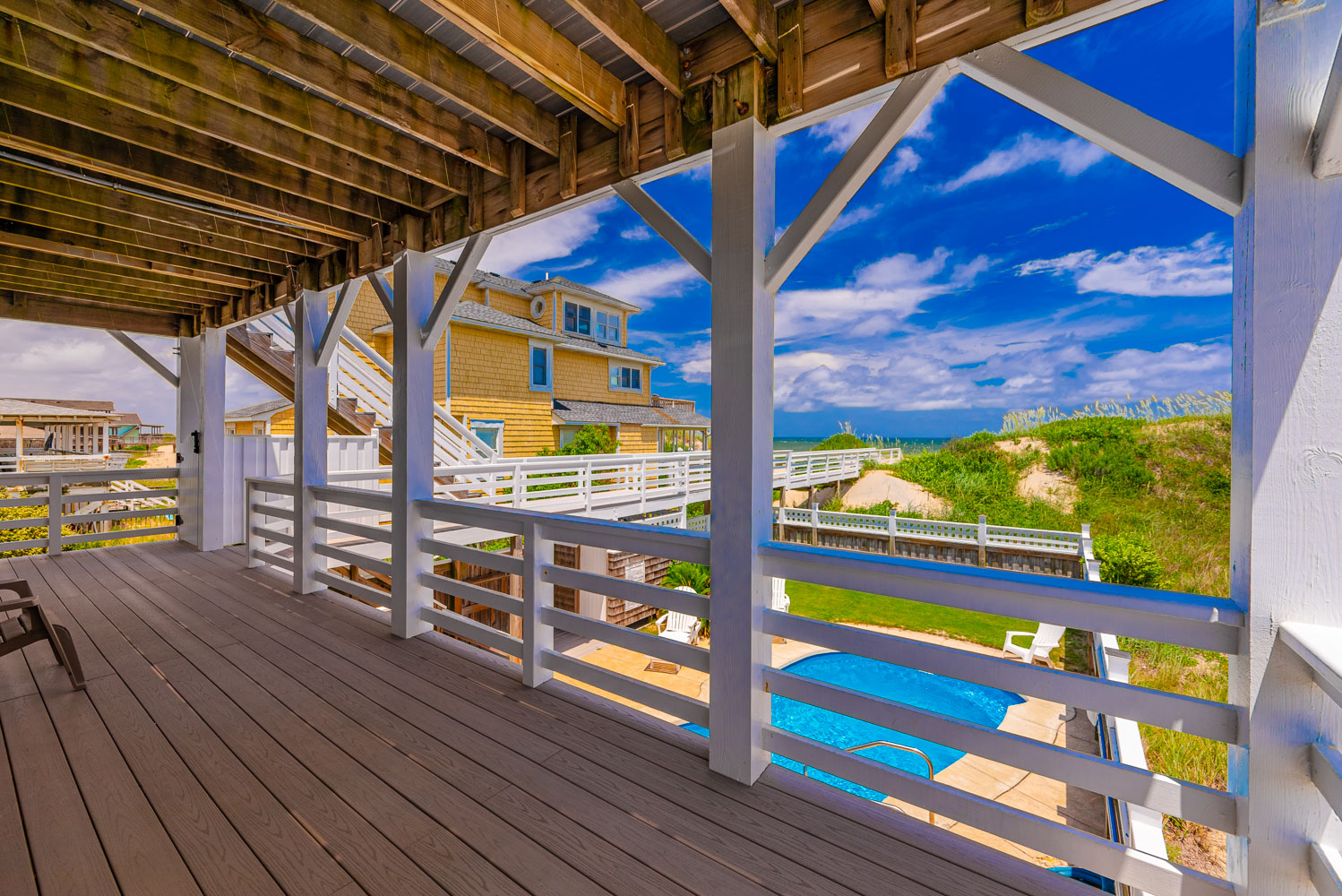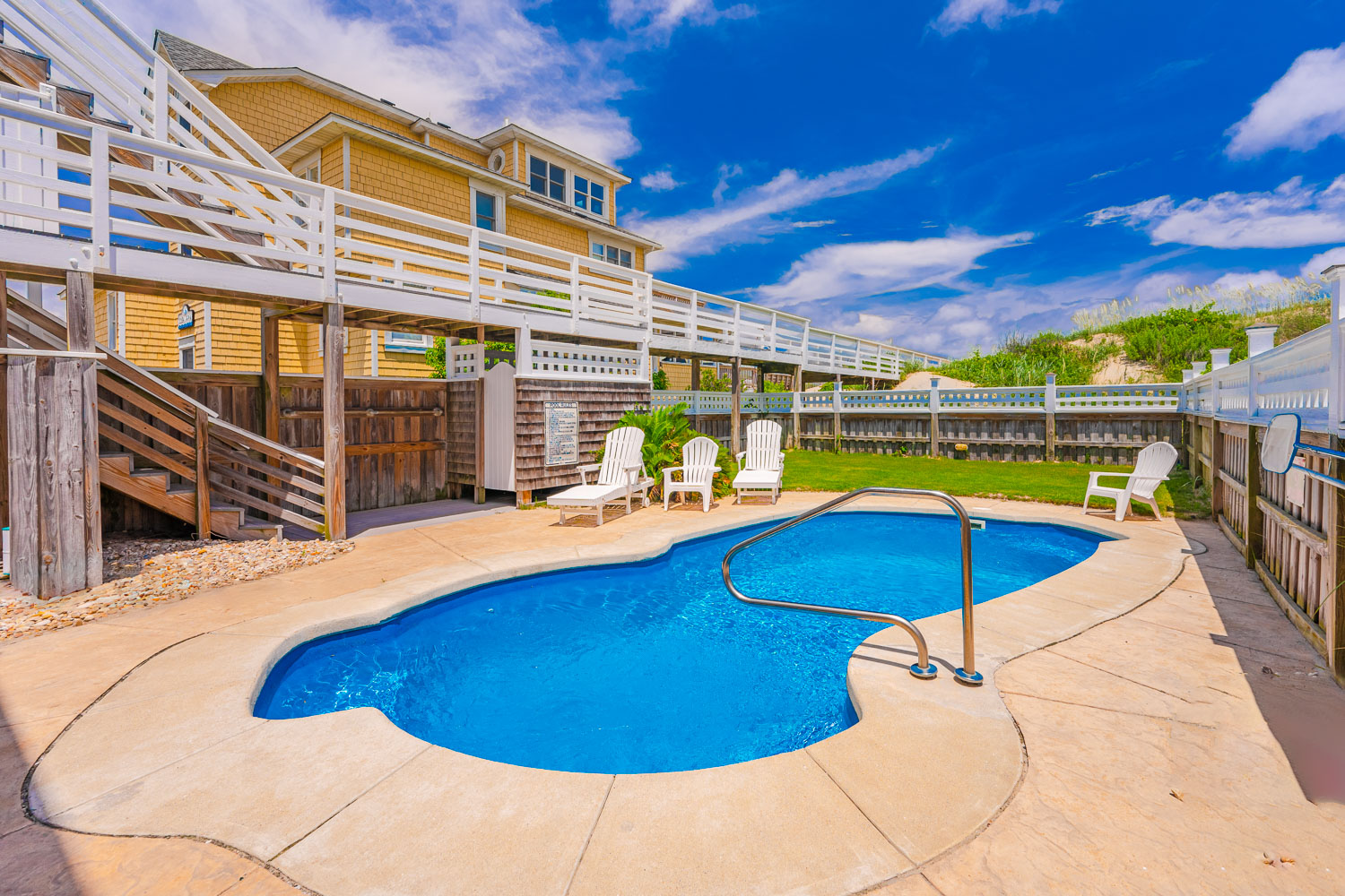 Ground Level: Parking for 5 Cars, Covered Entry, Steps to Mid Level Entry, Den w/TV, 3 Bedrooms (Private Suite w/King, TV, Full Bath w/Shower; 1 w/Duo Bunk, Bunk Set, TV; 1 w/King), Shared Full Bath w/Shower, Laundry Area, Access to Patio Area, Gas Grill, Enclosed Outside Shower, Private 10 x 22 Heated Salt Water Swimming Pool - Open Seasonally, (Can be Heated for $300.00 Per Week, Plus Tax, (Please Bear in Mind That Pool Temperature is Subject to Outside Temperatures and Conditions), Hot Tub, Pool Furniture, and Steps to Mid Level Boarded Walkway to Beach w/Steps to Beach.