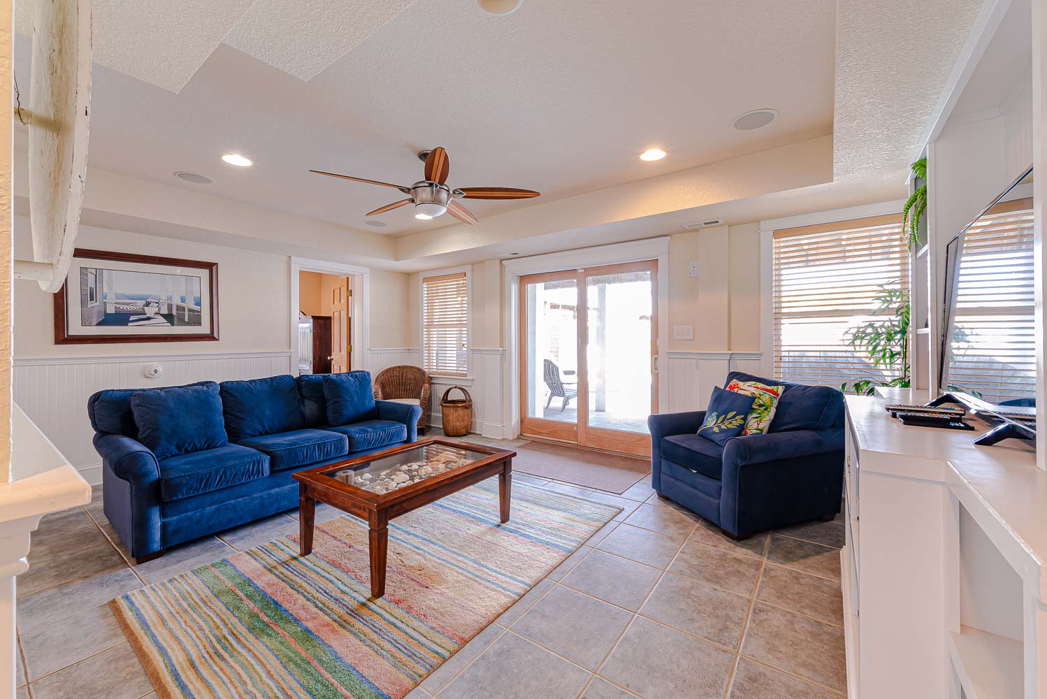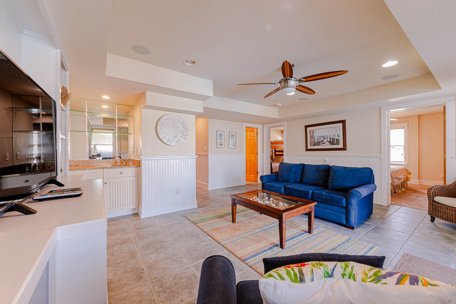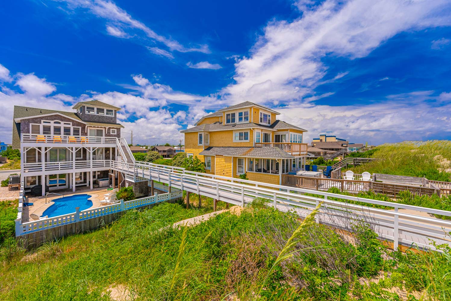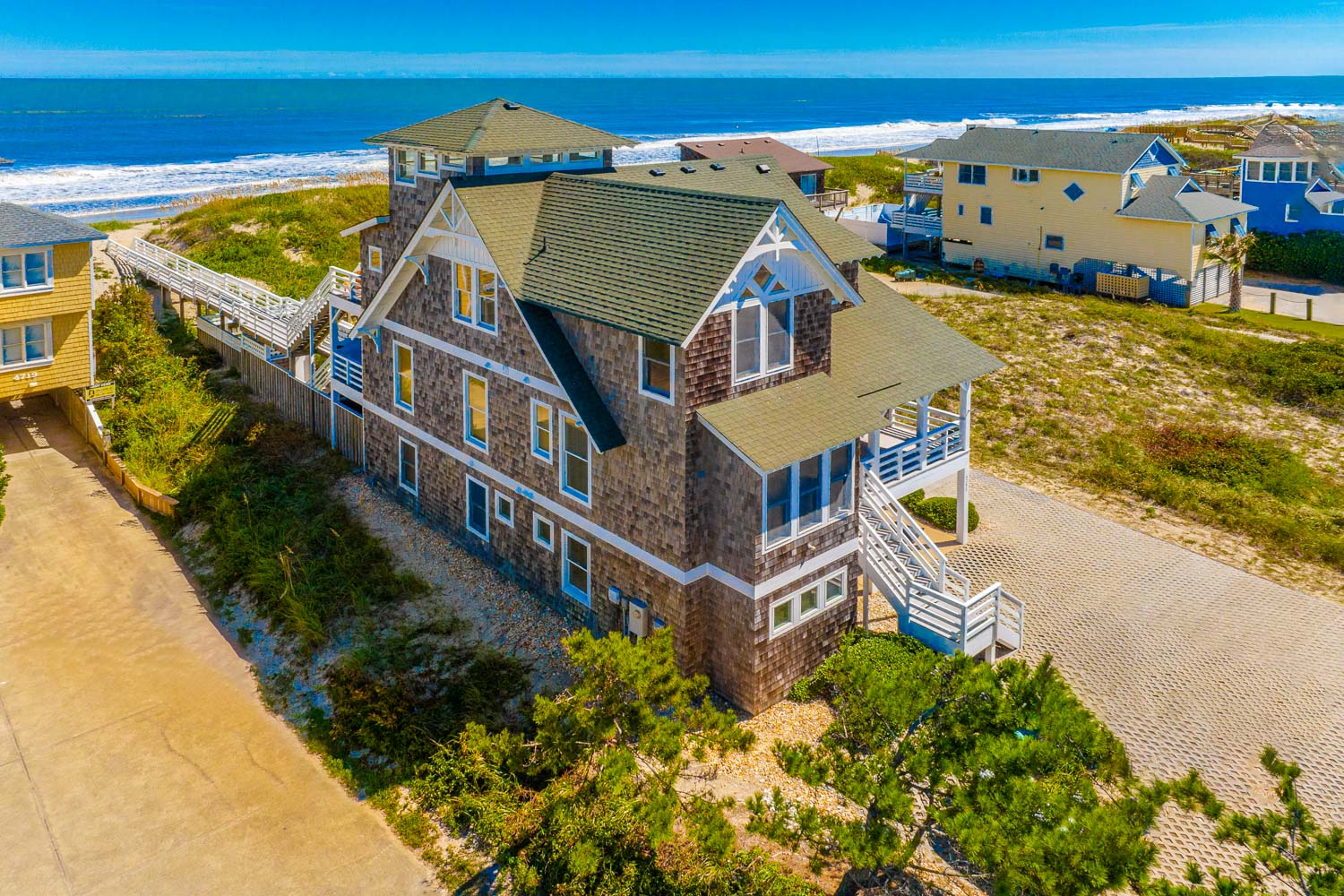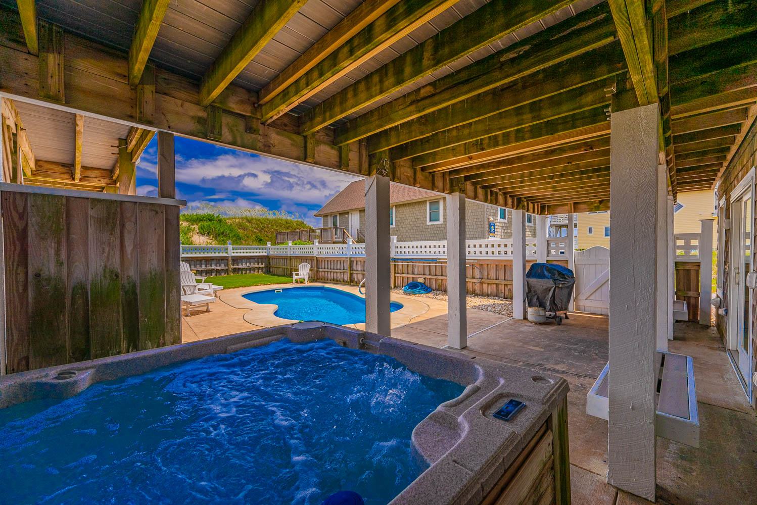 Ground Level: Parking for 5 Cars, Covered Entry, Steps to Mid Level Entry, Den w/TV, 3 Bedrooms (Private Suite w/King, TV, Full Bath w/Shower; 1 w/Duo Bunk, Bunk Set, TV; 1 w/King), Shared Full Bath w/Shower, Laundry Area, Access to Patio Area, Gas Grill, Enclosed Outside Shower, Private 10 x 22 Heated Salt Water Swimming Pool - Open Seasonally, (Can be Heated for $300.00 Per Week, Plus Tax, (Please Bear in Mind That Pool Temperature is Subject to Outside Temperatures and Conditions), Hot Tub, Pool Furniture, and Steps to Mid Level Boarded Walkway to Beach w/Steps to Beach.