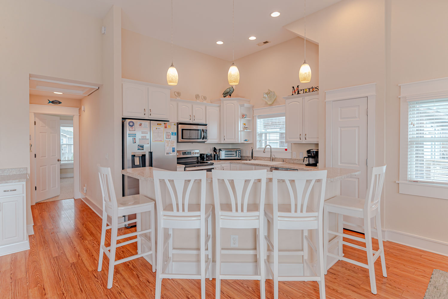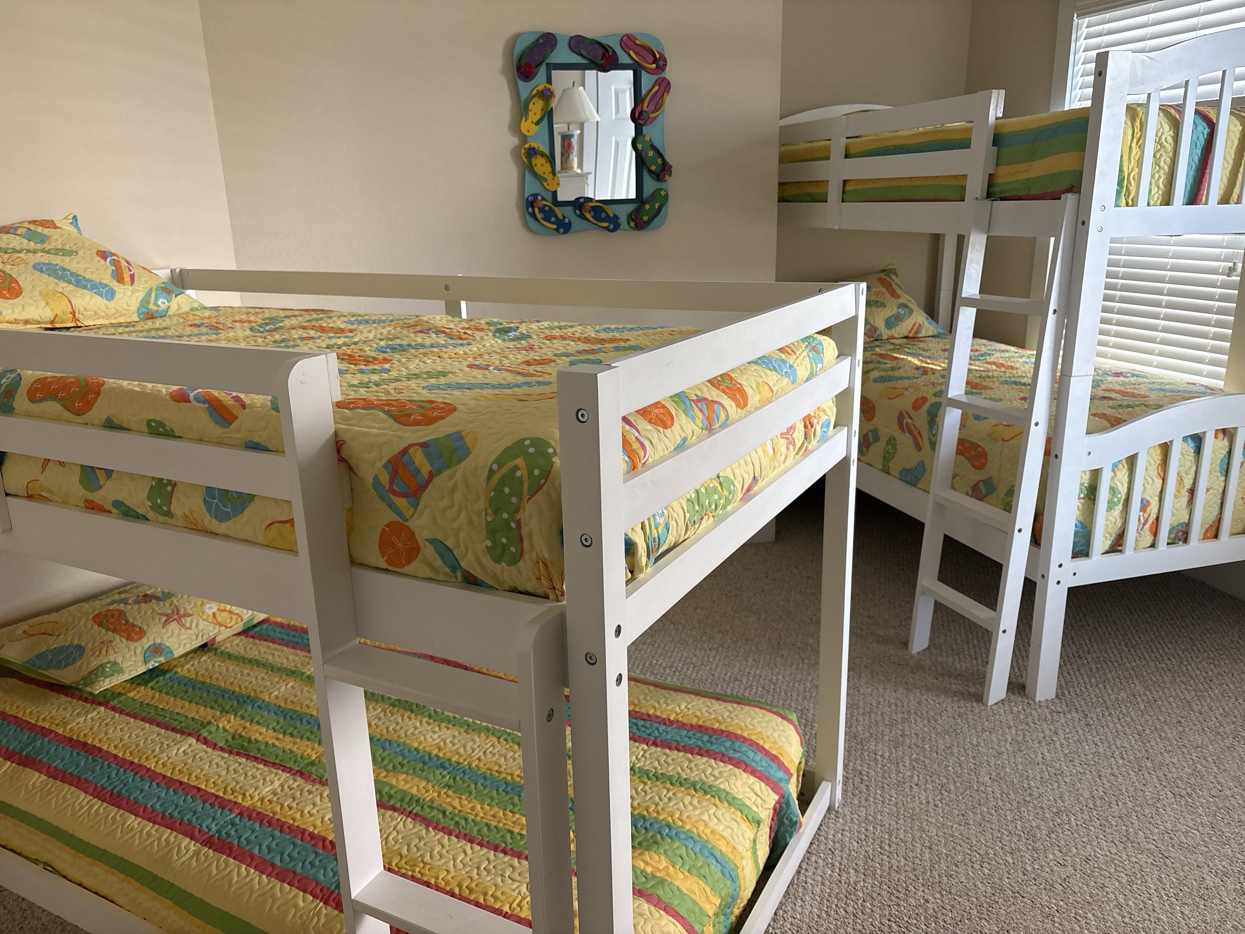 Mid Level: 4 Bedrooms (2 Private Suites w/King, LCD TV w/DVD, Full Baths, 1 w/King, LCD TV w/DVD, &1 w/2 Bunk Sets, LCD TV w/DVD), Shared Full Bath, Laundry Area, and Covered Deck.