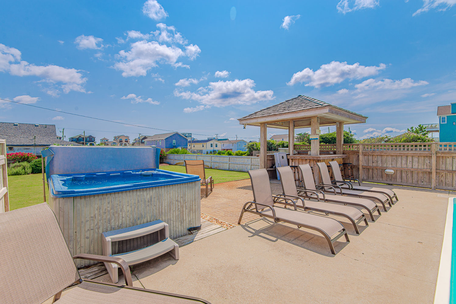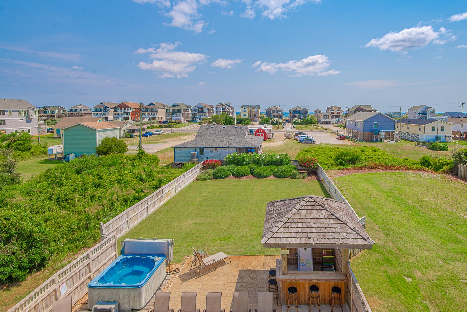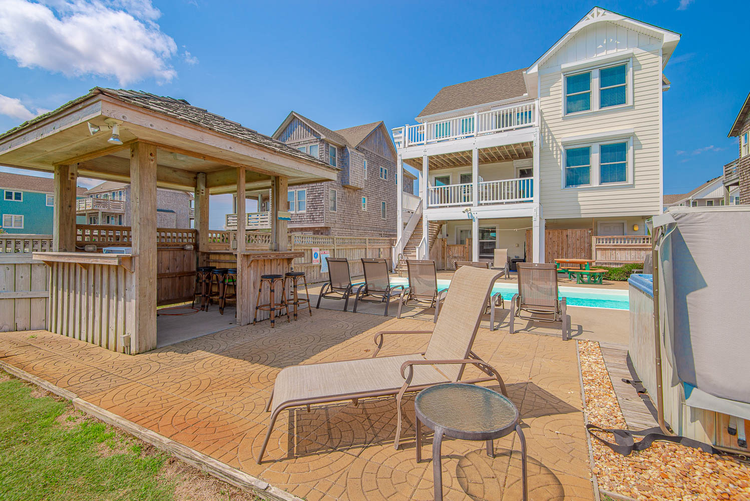 Ground Level: Parking for 5 Cars, Carport, Entry to Home, Large Rec. Room w/Pool Table, 32 Inch HDTV, Stereo w/Built-In Ceiling Speakers, Den Area w/Queen Sleep Sofa, 42 Inch HDTV, Full Bath (Accessible from Rec. Room and Pool Area), Small Bar w/Bar Stools, Wet Bar, Full Size Refrigerator, Free Standing Ice Maker, Access to Pool Patio Area, Private Swimming Pool - Open Seasonally, Hot Tub, Poolside Tiki Bar, Outdoor Stereo Speakers, Gas Grill, Enclosed Outside Shower, and Huge Grassy Fenced-in Backyard.