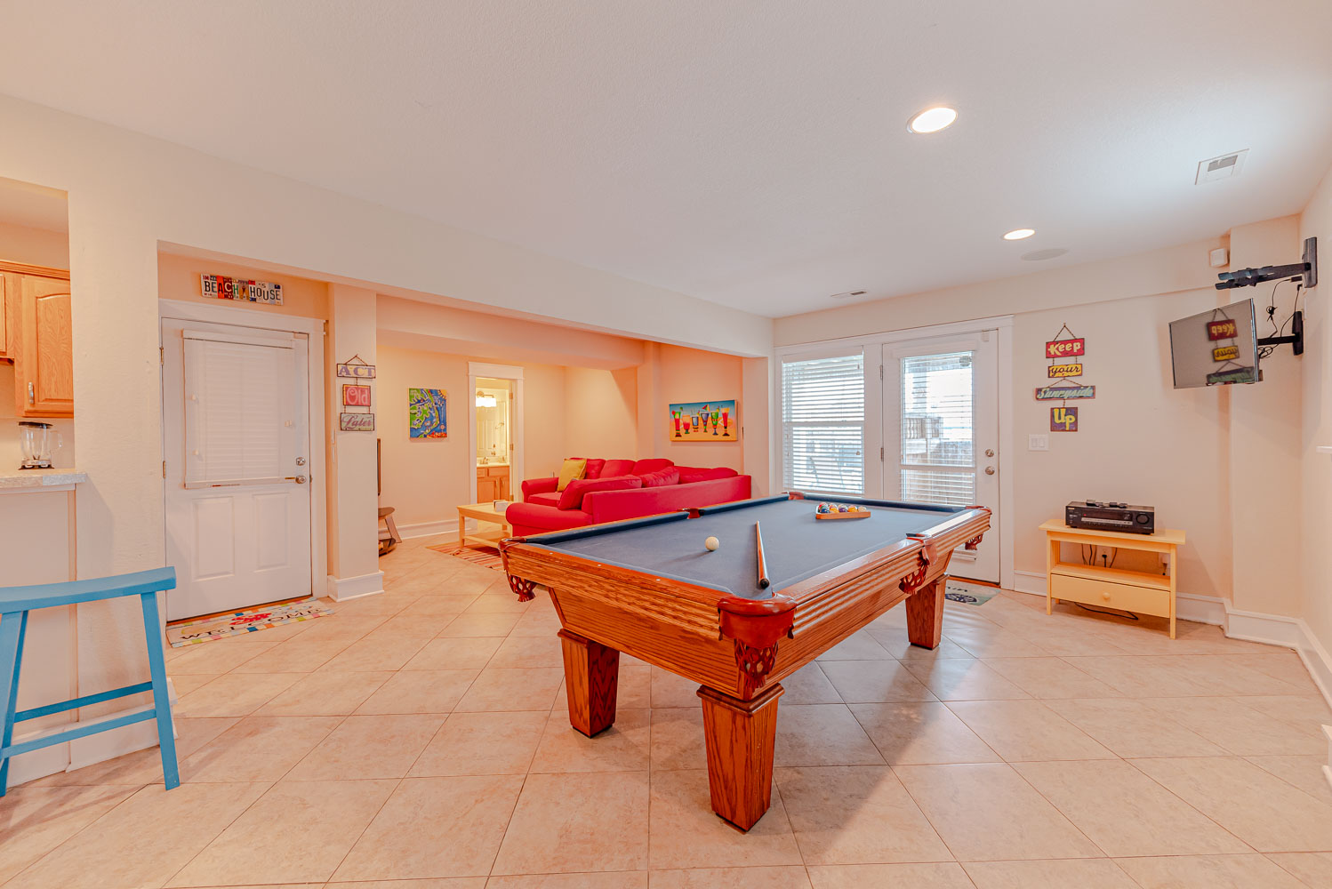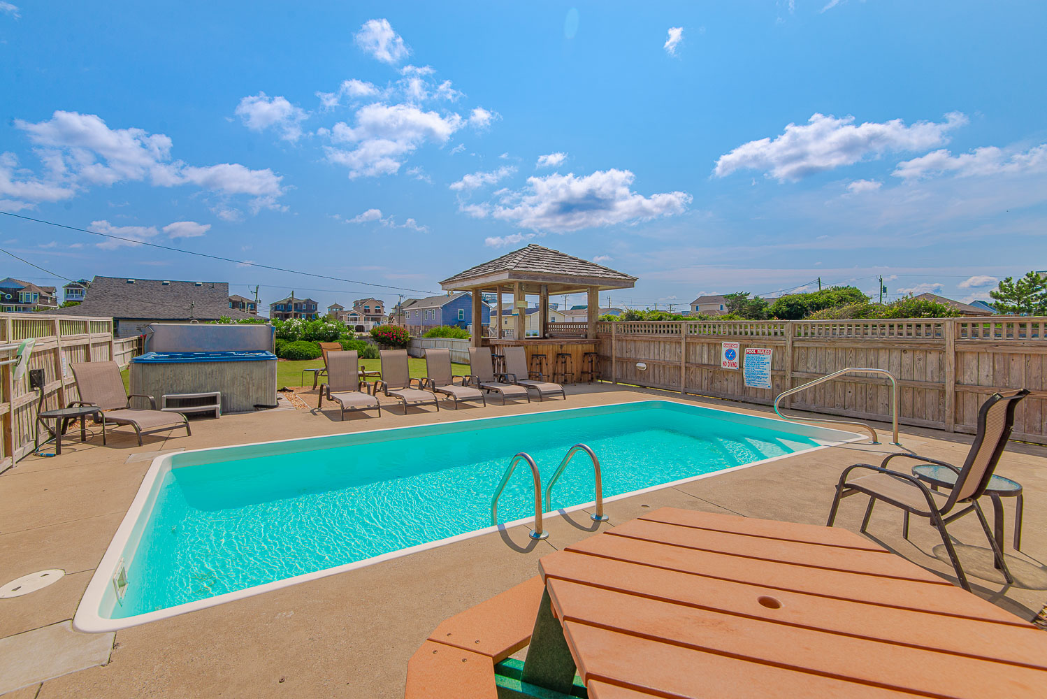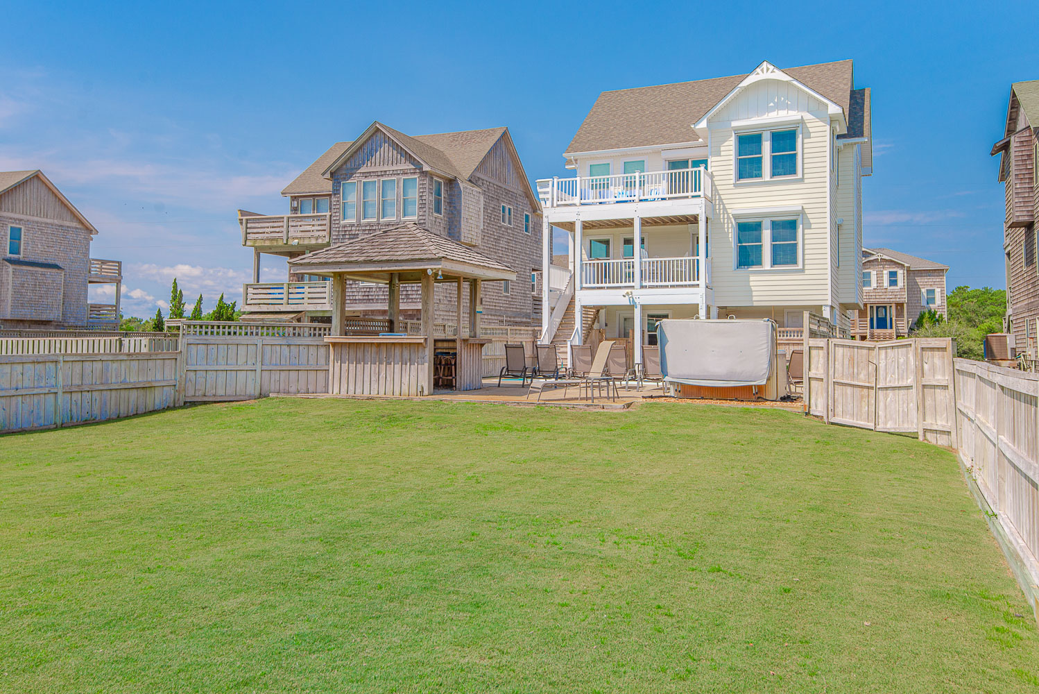 Ground Level: Parking for 5 Cars, Carport, Entry to Home, Large Rec. Room w/Pool Table, 32 Inch HDTV, Stereo w/Built-In Ceiling Speakers, Den Area w/Queen Sleep Sofa, 42 Inch HDTV, Full Bath (Accessible from Rec. Room and Pool Area), Small Bar w/Bar Stools, Wet Bar, Full Size Refrigerator, Free Standing Ice Maker, Access to Pool Patio Area, Private Swimming Pool - Open Seasonally, Hot Tub, Poolside Tiki Bar, Outdoor Stereo Speakers, Gas Grill, Enclosed Outside Shower, and Huge Grassy Fenced-in Backyard.
