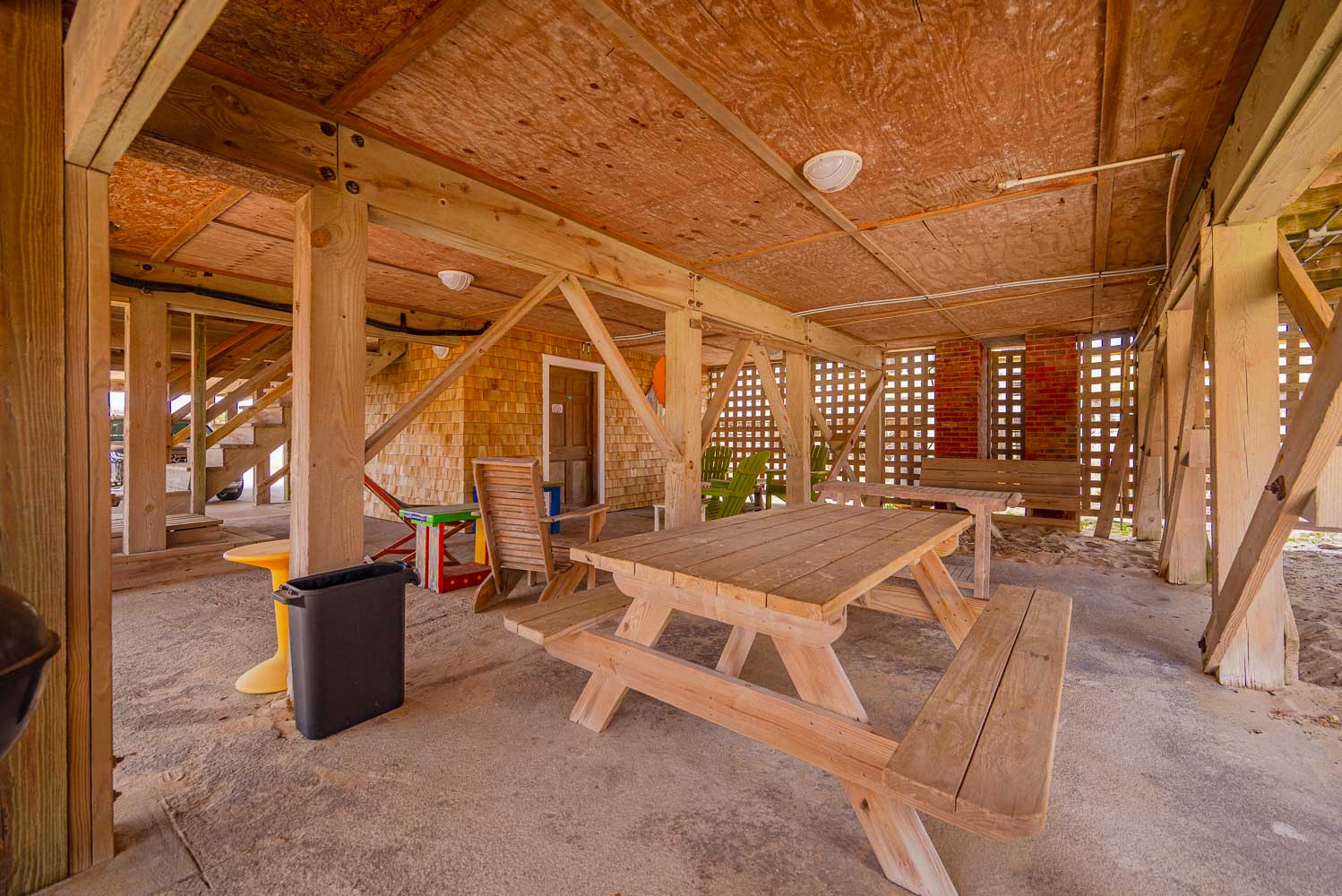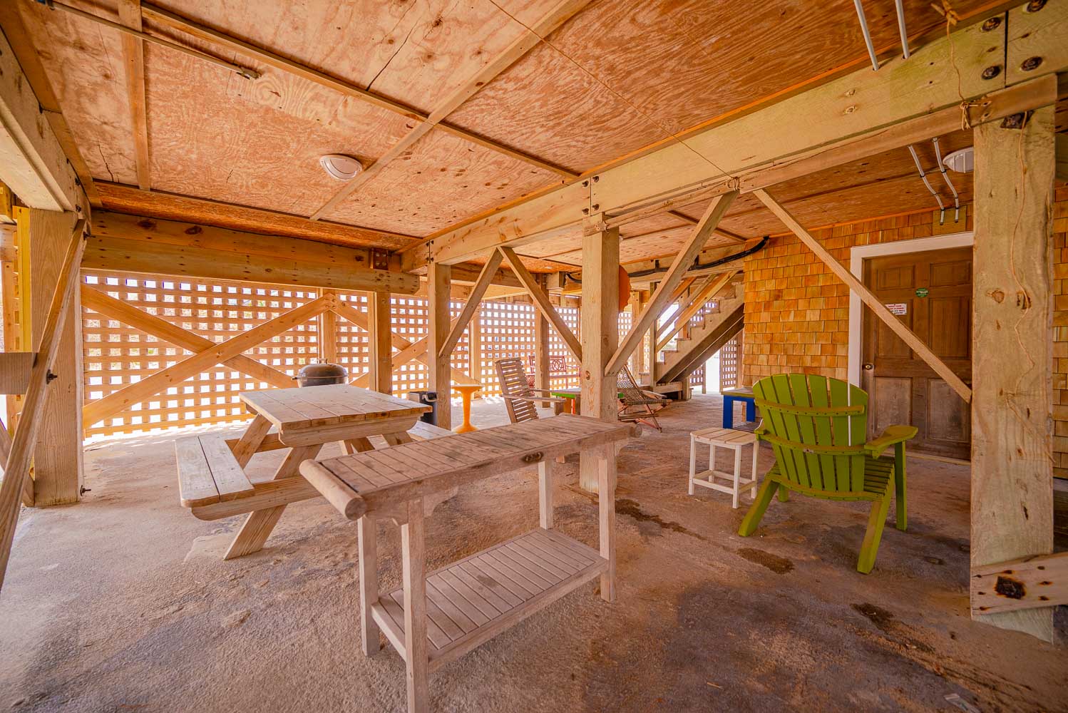 Ground Level: Ample Parking, Steps to Entry, Utility Room w/Refrigerator, Gas Grill, Picnic Table, Sitting Area, and Fish Cleaning Station.