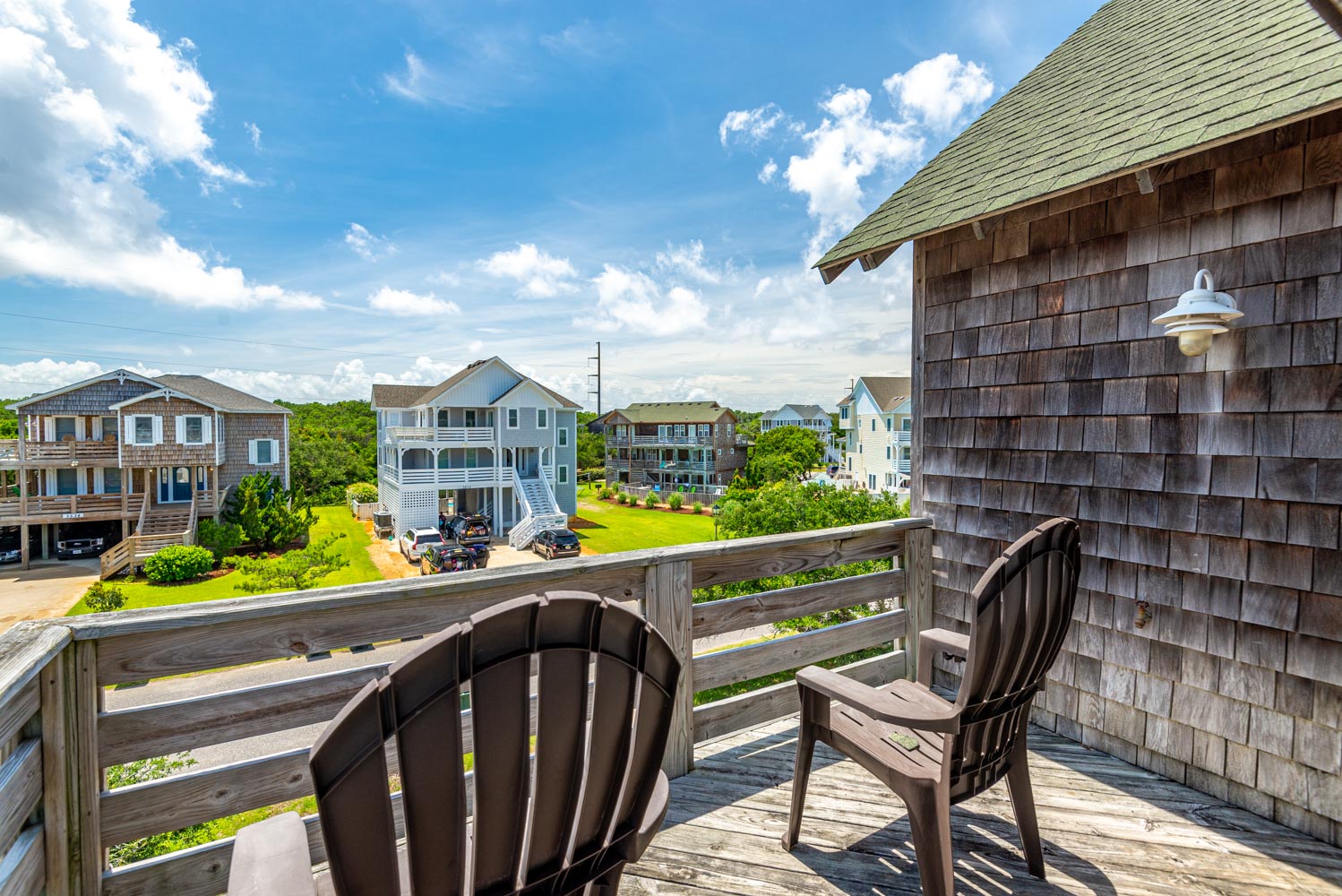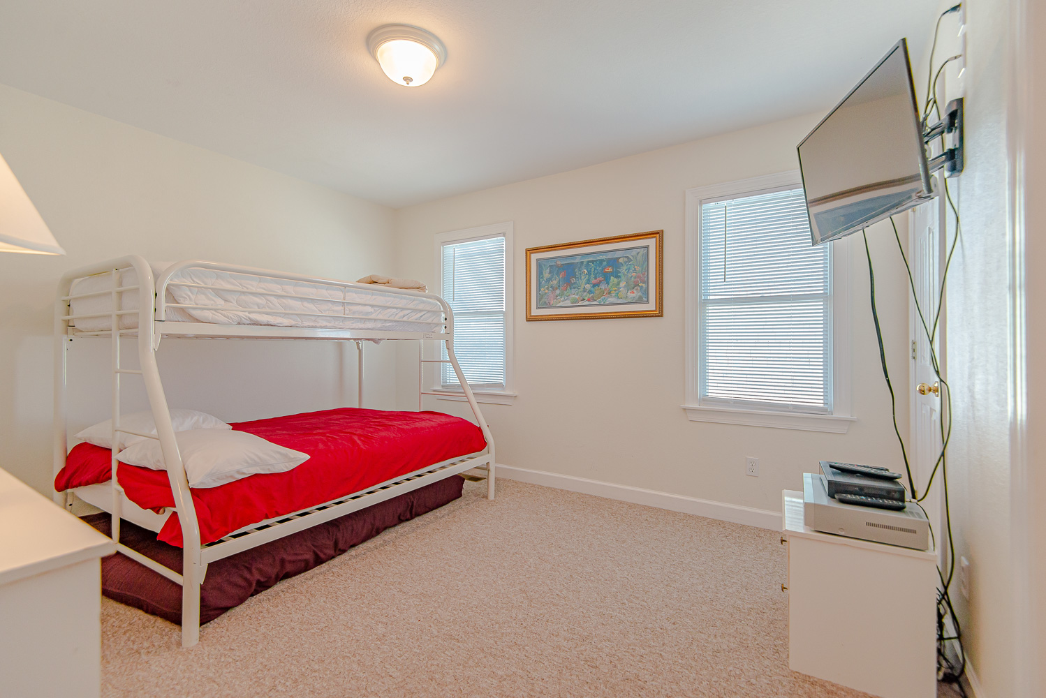 Mid Level: 4 Bedrooms (Private Suite w/King, Flat Screen Smart TV, & Full Bath, Private Suite w/Queen, Flat Screen Smart TV, & Full Bath w/Shower, 1 w/Queen & Flat Screen Smart TV, 1 w/Duo Bunk & Flat Screen Smart TV), Full Hall Bath w/Shower & Tub, Laundry Area, & Covered Deck w/Deck Furniture.
