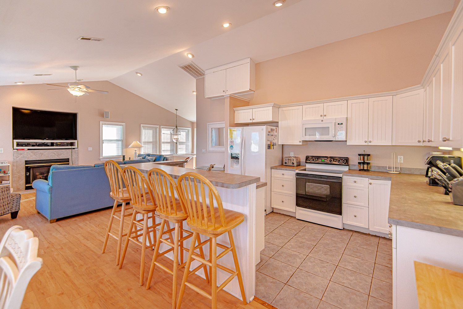 Top Level: Living/Dining/Kitchen Area, Ocean Views, Flat Screen Smart TV, DVD, Stereo, Gas Fireplace, Private Suite w/King, Flat Screen Smart TV, & Full Bath w/Jacuzzi Tub/Shower, & Sun Deck w/Deck Furniture.