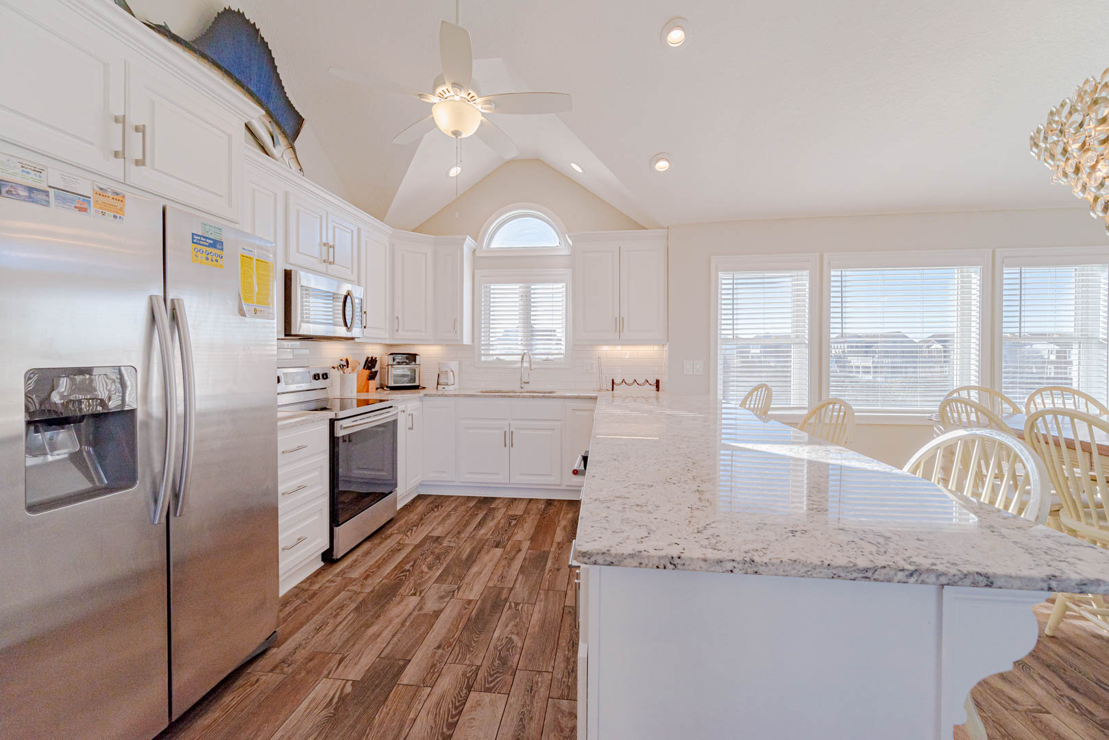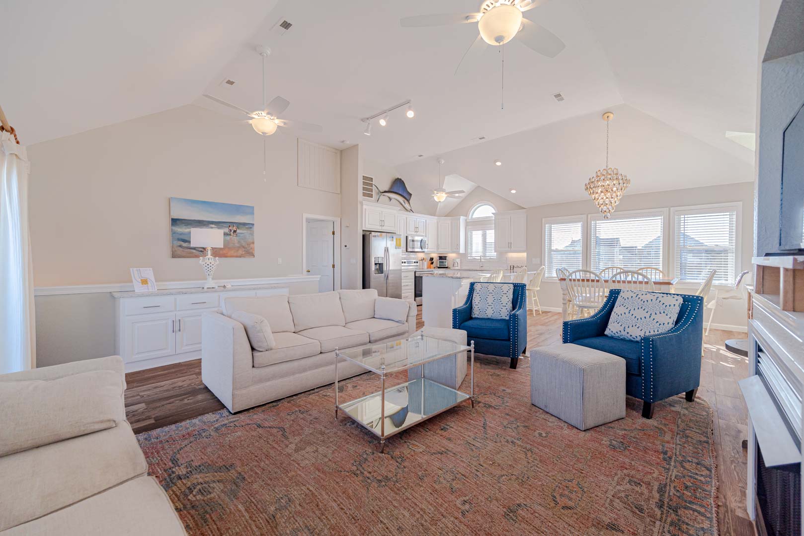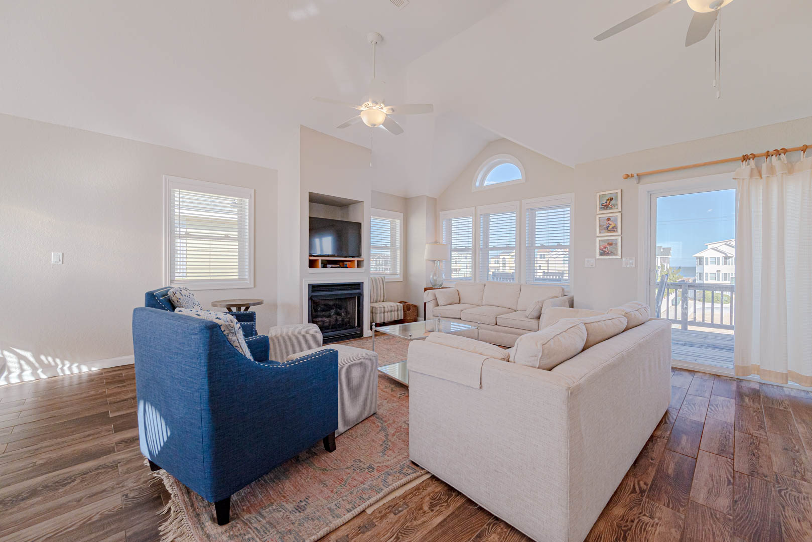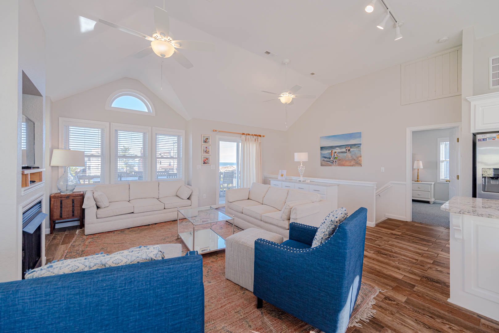 Top Level: Open and Bright w/Living Area, TV, Gas Fireplace (Fireplace will not be available in 2026), Dining Area, Fully Equipped Kitchen w/Granite Counters, Microwave, Ice Maker, Air Fryer, Lovely Ocean Views, Private Suite w/King, 55 Inch Smart TV, Full Bath w/Washer/Dryer, and Large Sun Deck.
