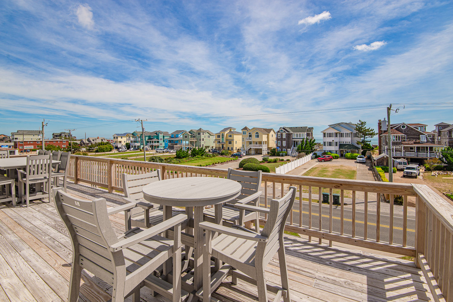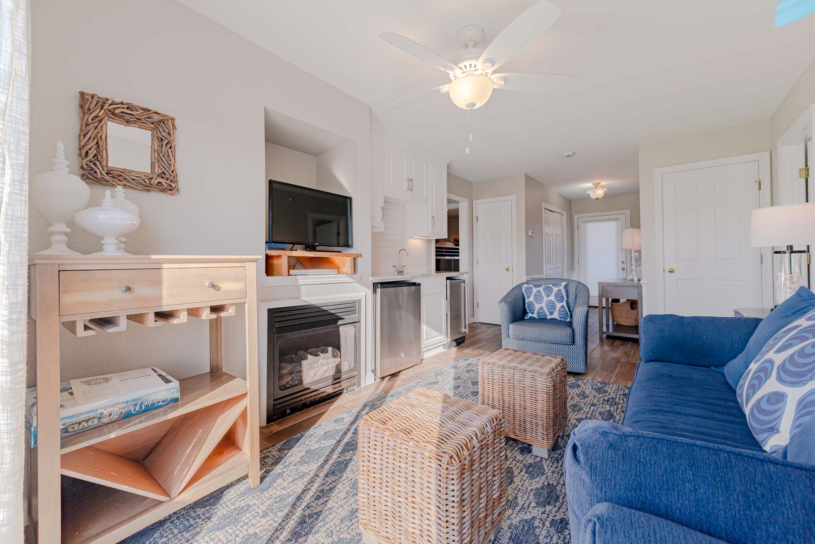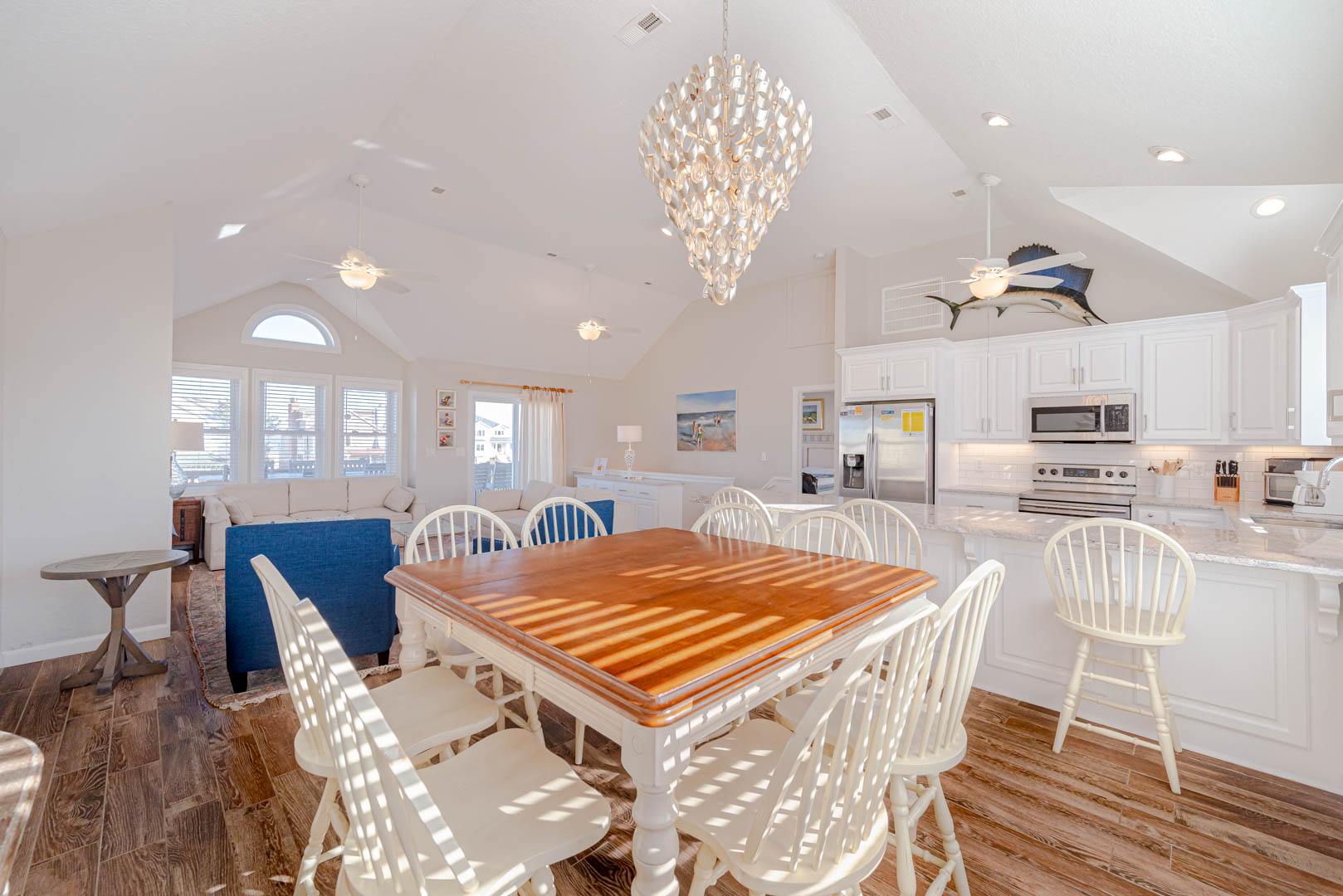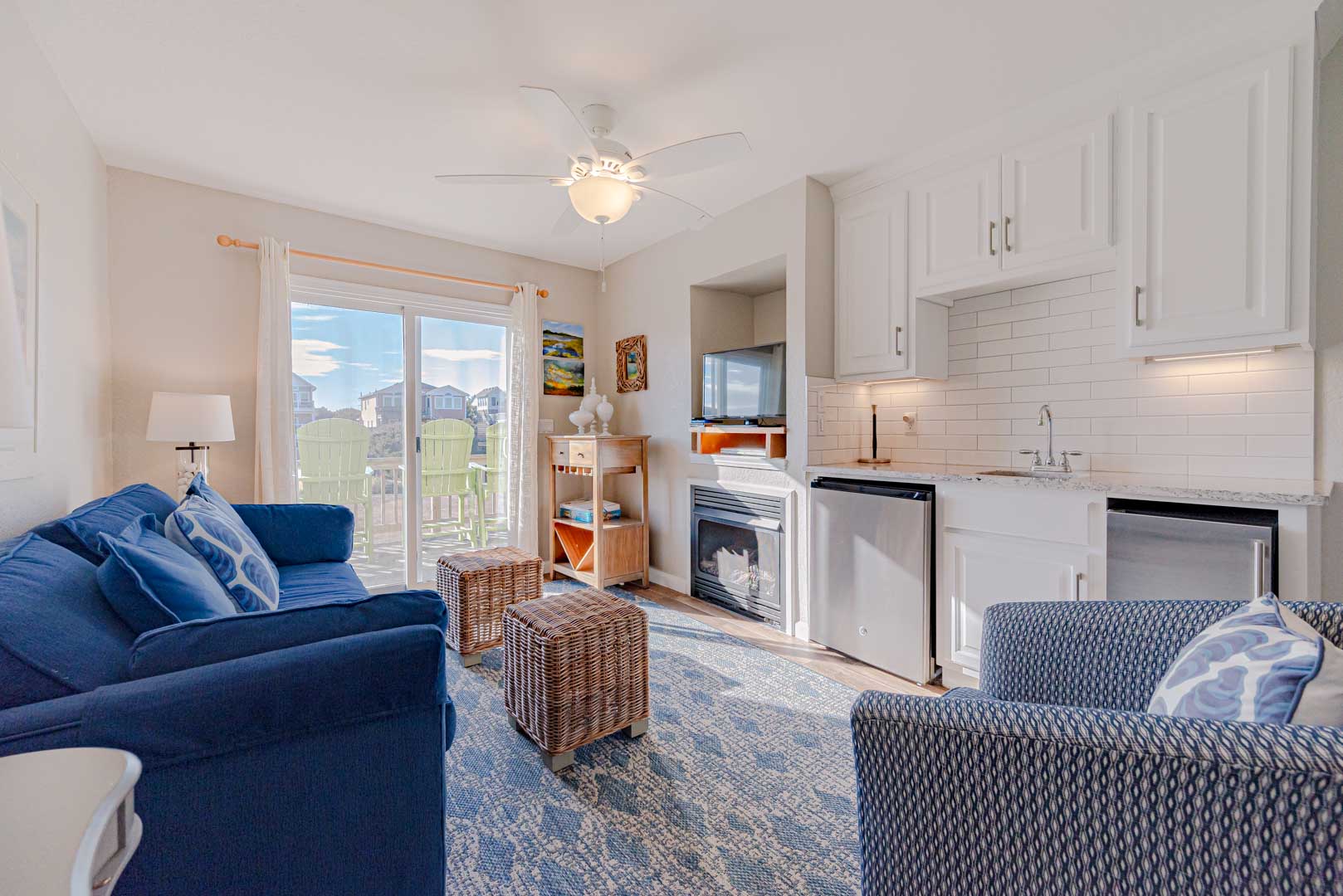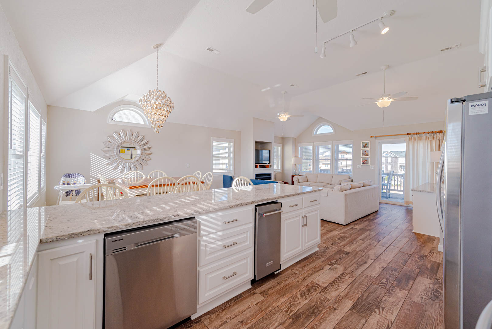 Top Level: Open and Bright w/Living Area, TV, Gas Fireplace (Fireplace will not be available in 2026), Dining Area, Fully Equipped Kitchen w/Granite Counters, Microwave, Ice Maker, Air Fryer, Lovely Ocean Views, Private Suite w/King, 55 Inch Smart TV, Full Bath w/Washer/Dryer, and Large Sun Deck.