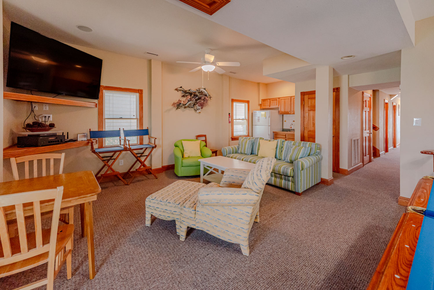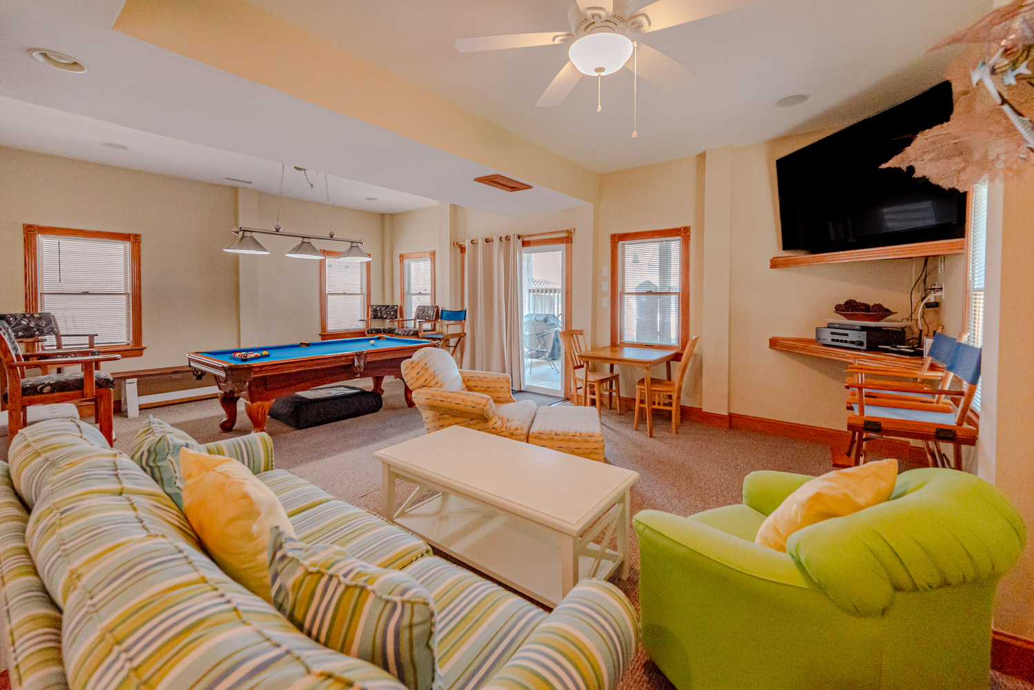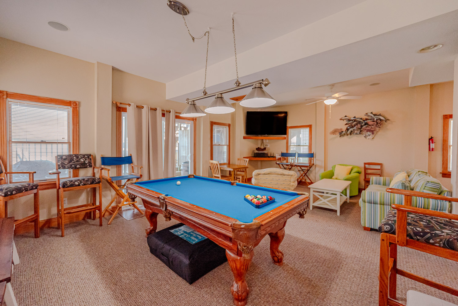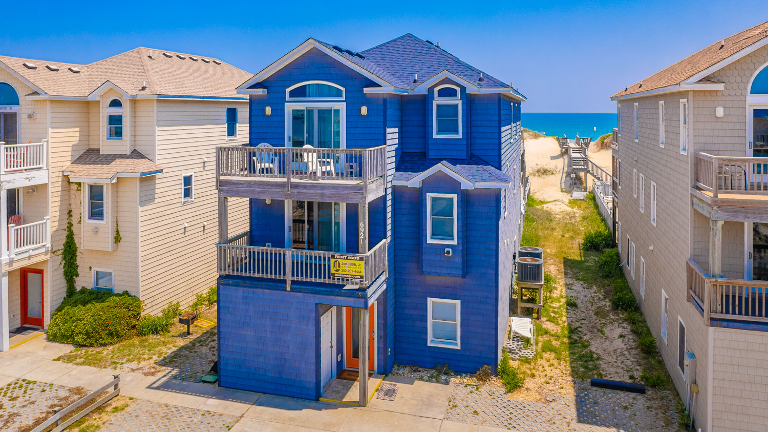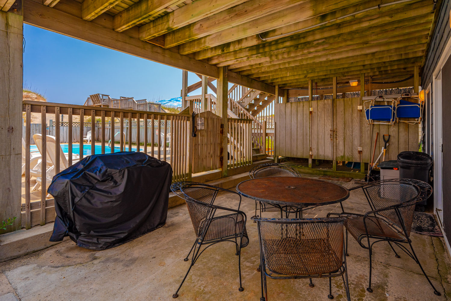 Ground Level: Parking for 6 Cars, Entry, Cargo Lift, Rec. Room w/Pool Table, Wet Bar, Full Size Refrigerator, 65 Inch Roku TV, 3 Bedrooms (1 w/2 Singles; Full Hall Bath; 2 w/Queens, Roku TVs; Shared Full Bath), Access to Pool Area, Private Swimming Pool - Open Seasonally , 2 Enclosed Outside Showers, and Access to Walkway to Beach.
