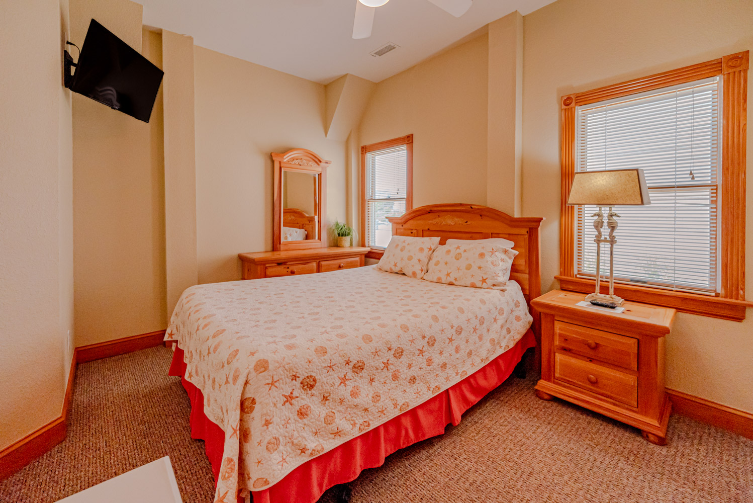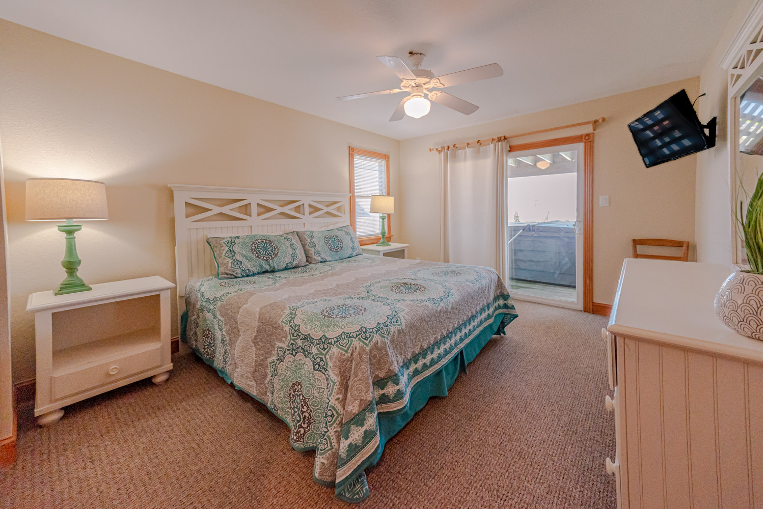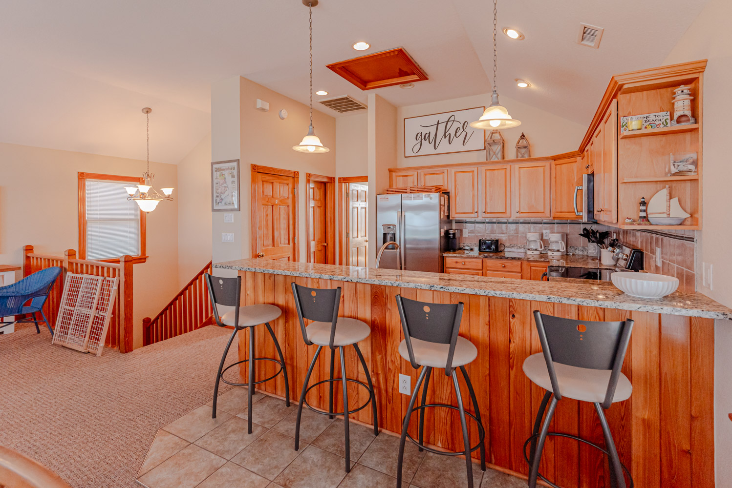 Mid Level: 4 Bedrooms (2 Private Suites w/Kings, 32 Inch Roku TVs, Full Baths, Access to Covered Deck w/Hot Tub, Ocean Views; Private Suite w/Queen, 32 inch Roku TV, Full Bath, Covered Deck; 1 w/2 Singles, Roku TV), Full Hall Bath, and Laundry Room.