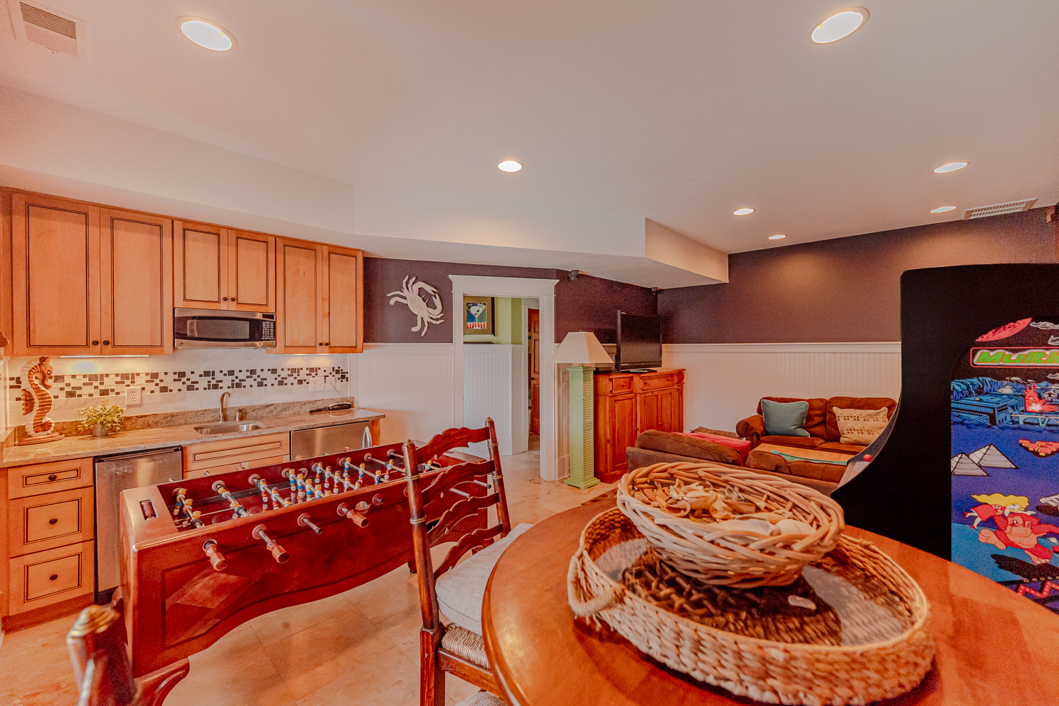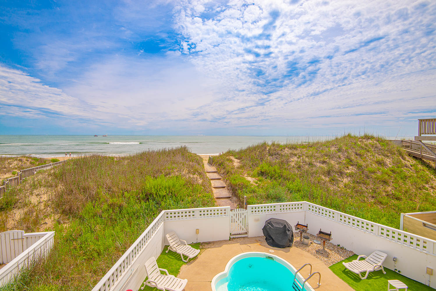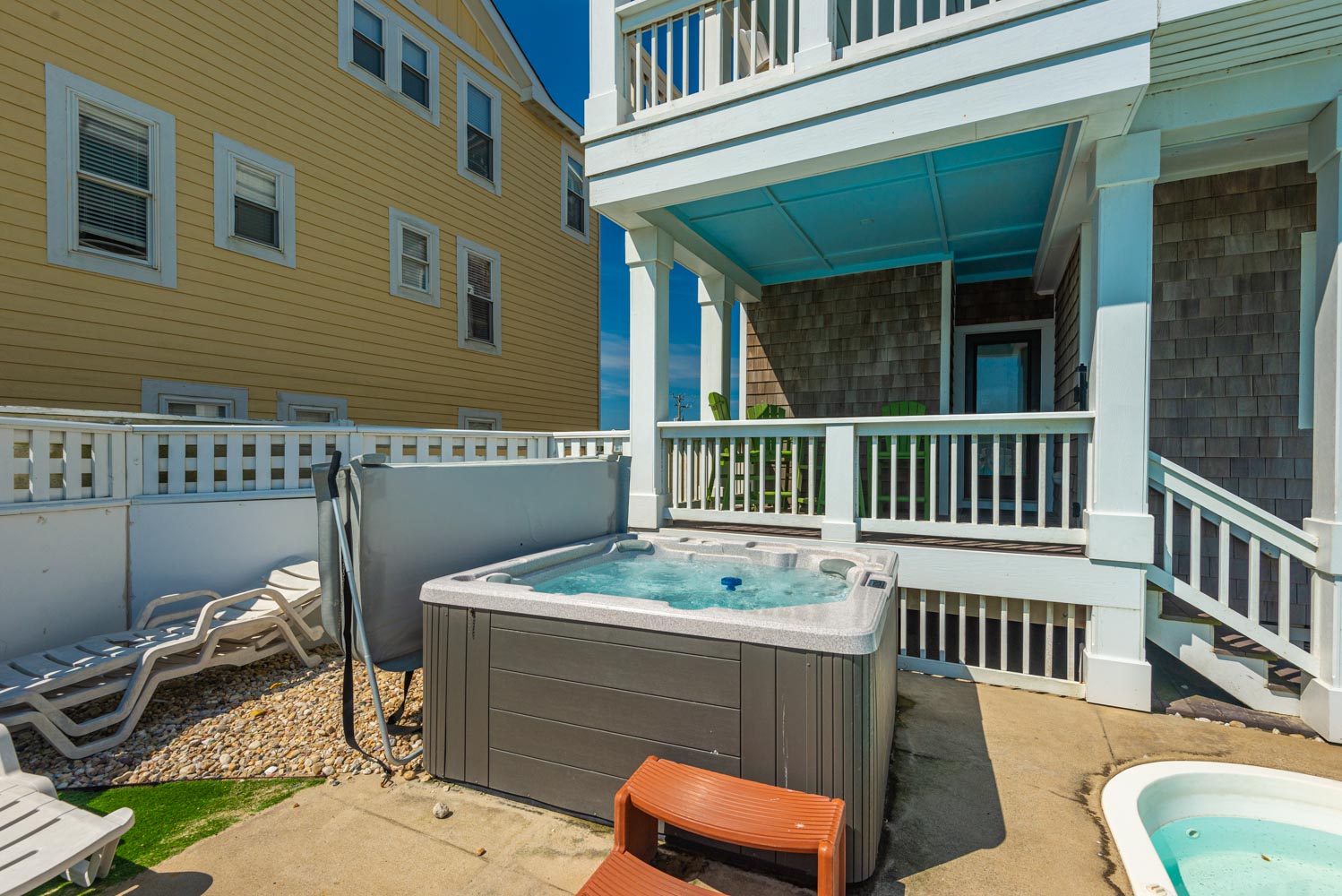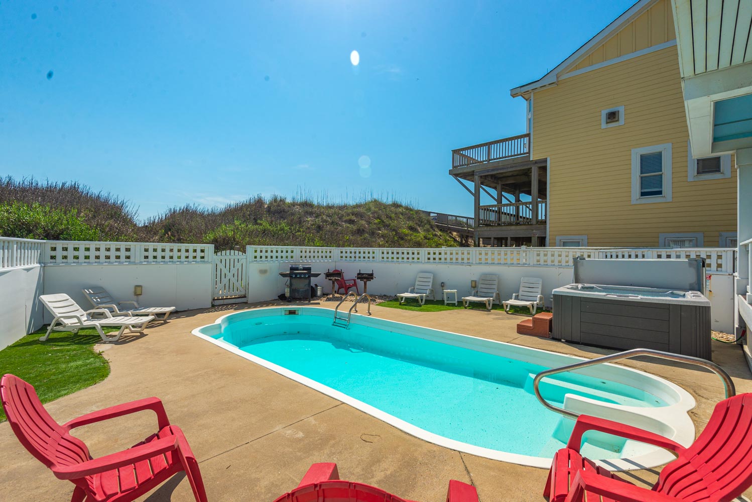 Ground Level: Parking for 5 Cars, Steps to Covered Entry, Foyer/Sitting Area, Elevator, Laundry Area, 3 Bedrooms (Private Suite w/Queen, TV, Access to Front Balcony w/Deck Furniture, & Full Bath, Private Suite w/2 Singles, TV, & Full Bath, Bedroom w/Bunk Set w/Trundle & TV), Shared Full Bath Bath, Rec. Room w/Foosball, Media Area, TV, Wet Bar w/Mini-Refrigerator, Microwave, & Access to Covered Area w/Steps to Enclosed Outside Shower, Private Heated Swimming Pool - Open Seasonally. (Can Be Heated for $300.00 Per Week, Plus Tax. Please Bear in Mind That Pool Temperature is Subject to Outside Temperatures & amp; Conditions), Hot Tub, and Walkway to Beach w/Dune Top Deck w/Foot Shower.