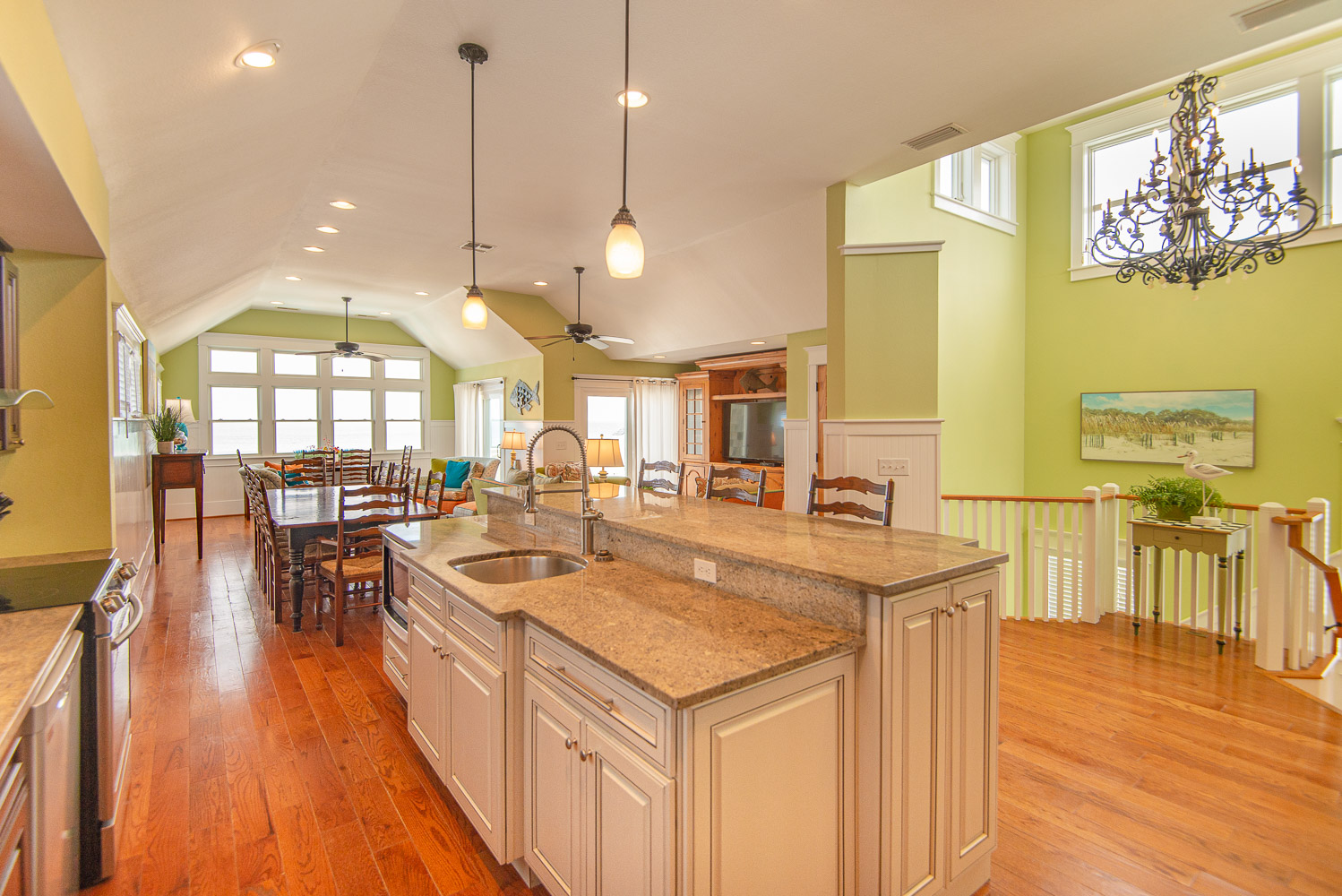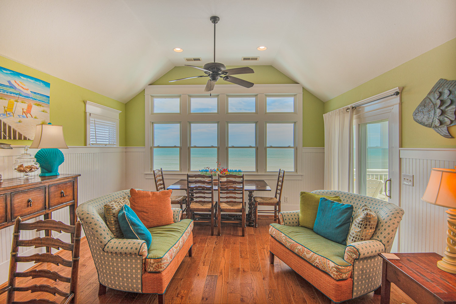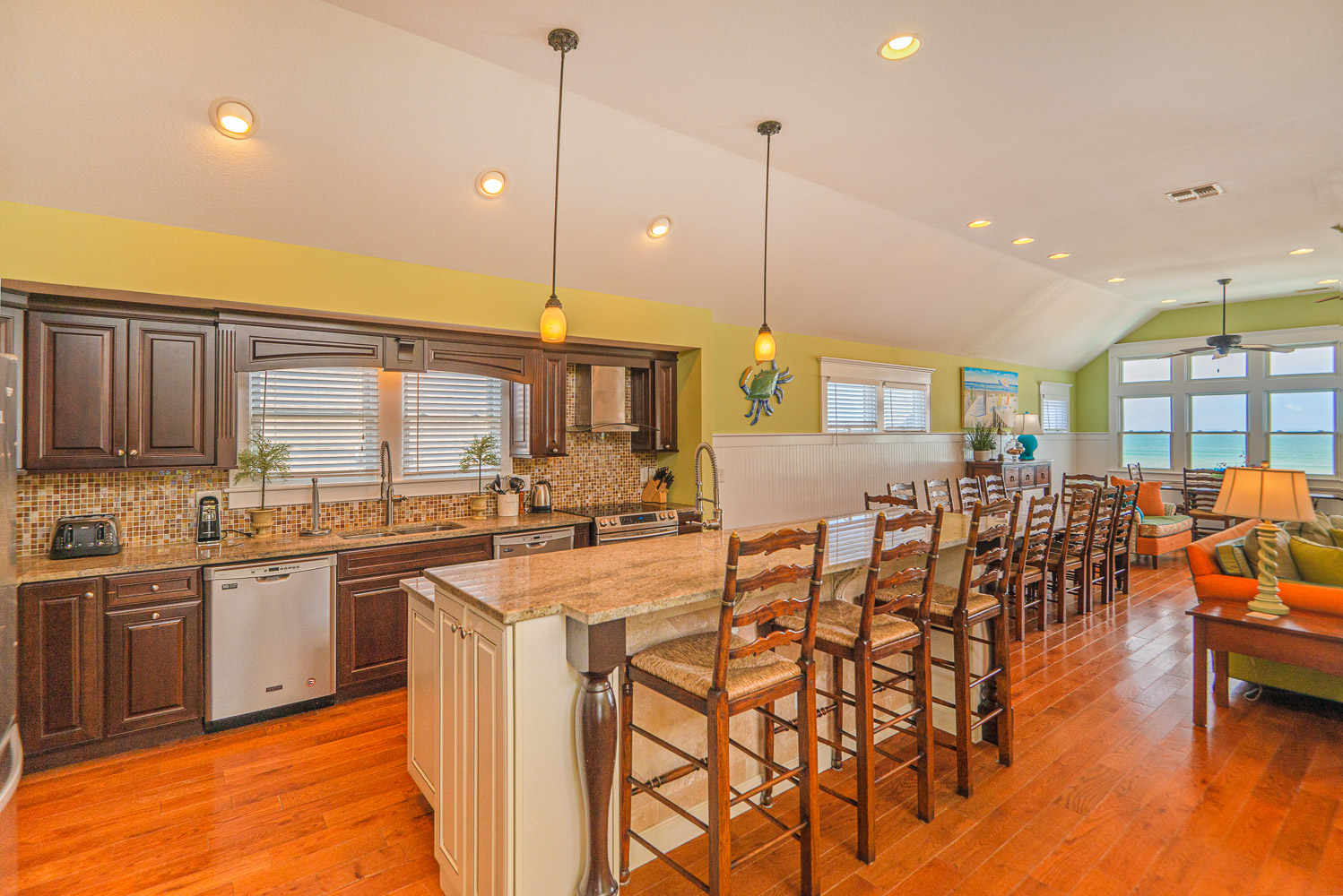Top Level: Living Area w/TV, Ocean Views, Kitchen Area w/Bar Seating for Three (3), 2 Dishwashers, Double Refrigerator, Dining Area w/Seating for Twelve (12), Half Bath, Sitting Area w/Access to Sun Deck w/Deck Furniture and Ocean Views, Private Suite w/King, TV, Full Bath, and Access to Private Front Covered Deck w/Furniture.