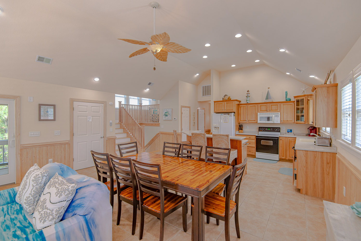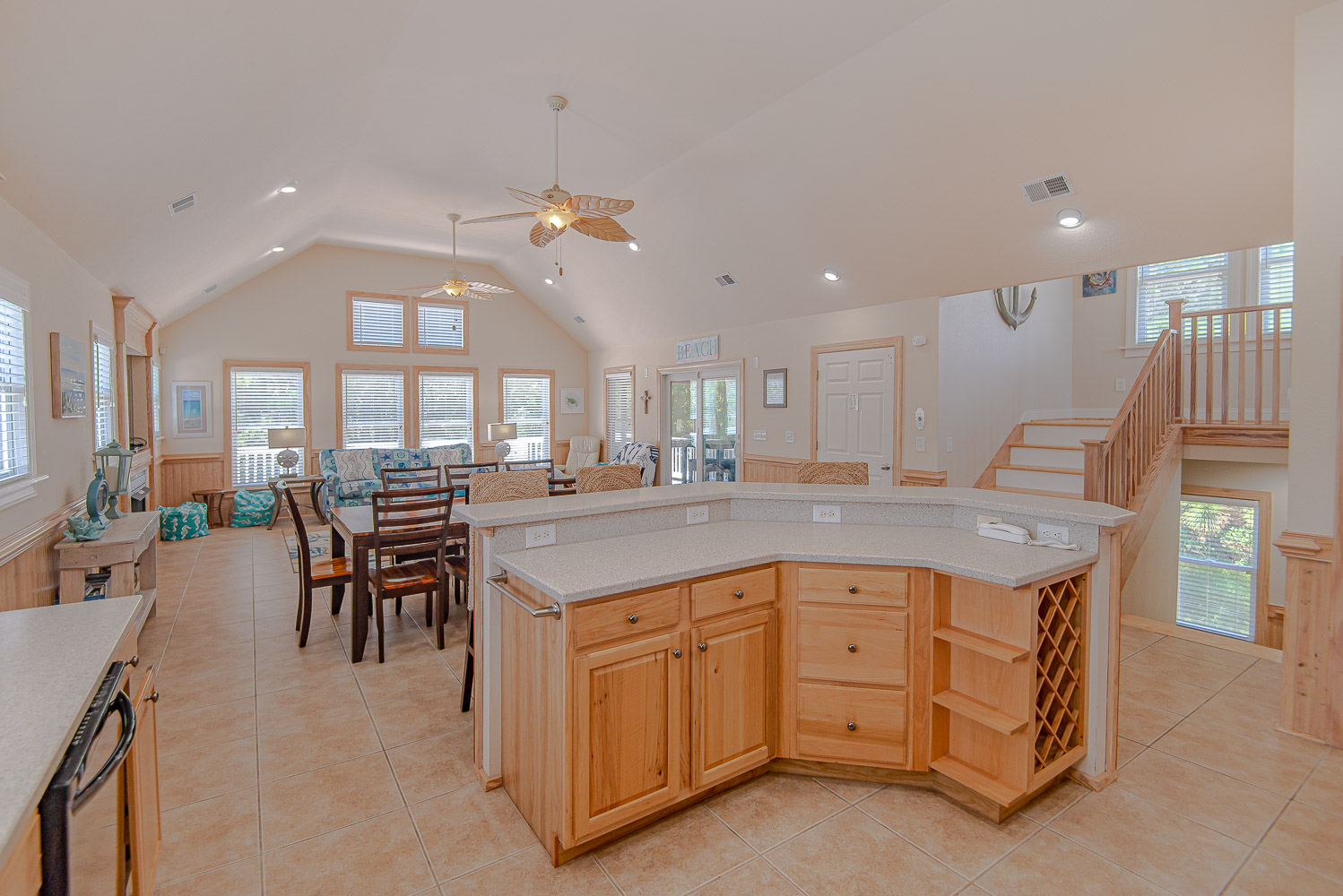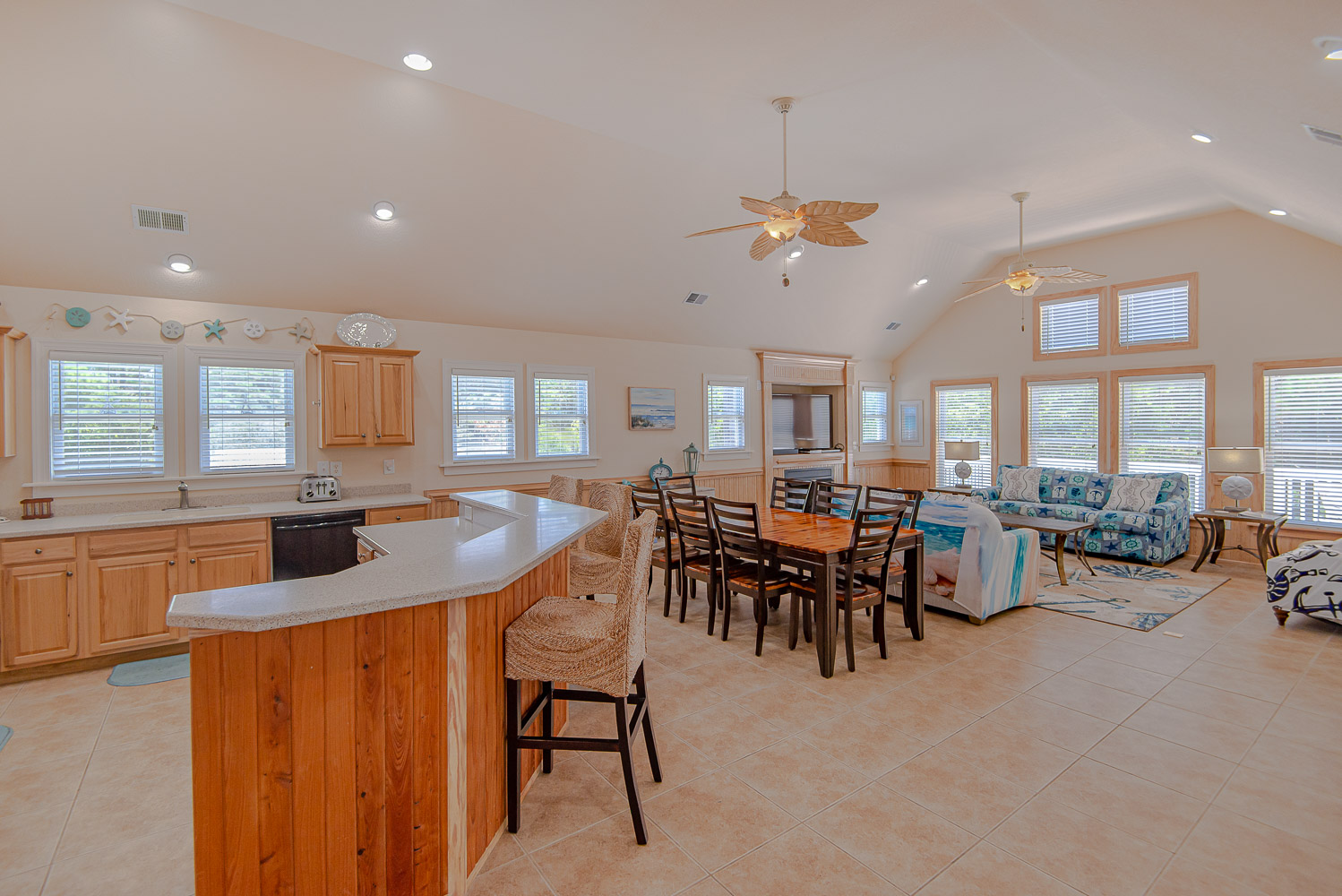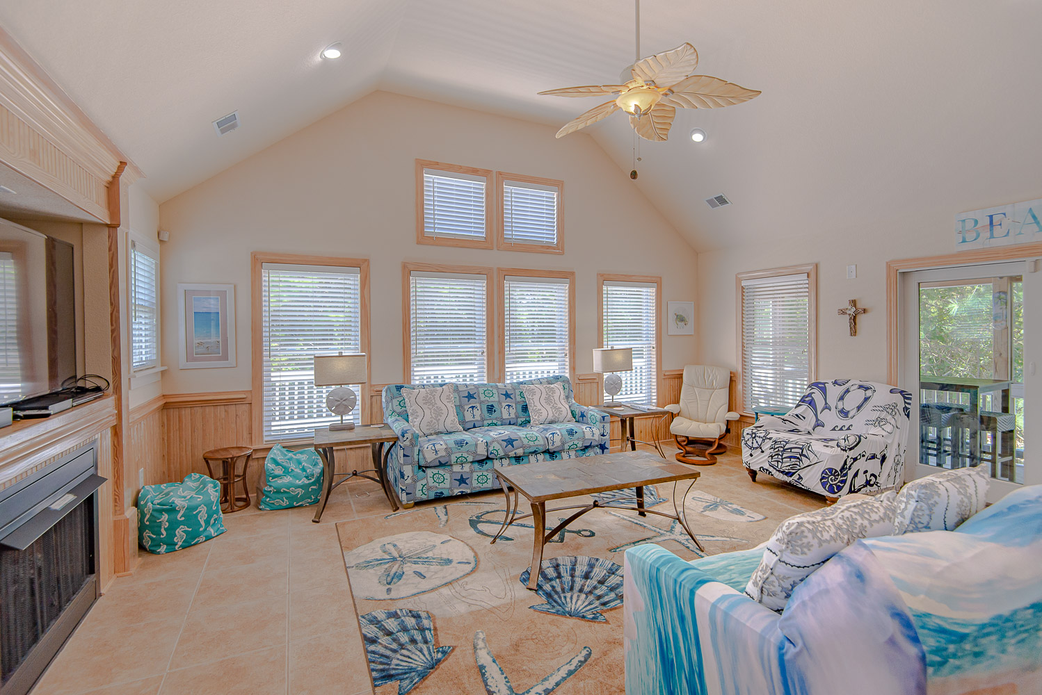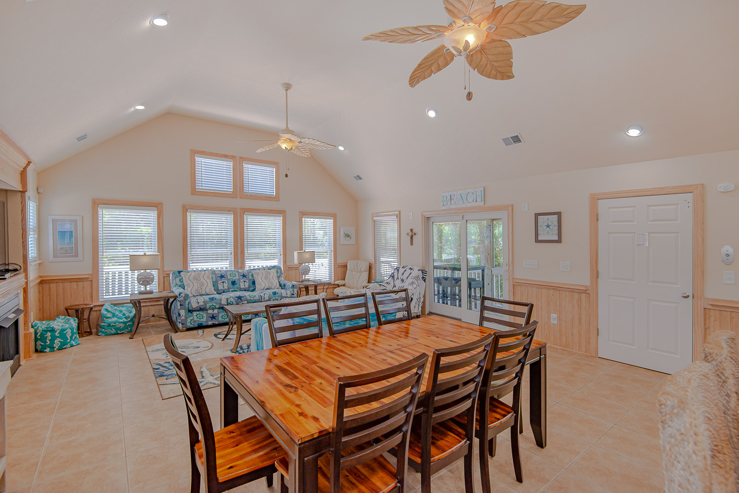 Top Level: Living/Dining/Kitchen Area, TV, DVD, Half Bath, 1 Private Suite w/King, Flat Screen TV, & Full Bath, Steps to Loft, Screen Porch w/Furniture, & Sun Deck w/Deck Furniture.