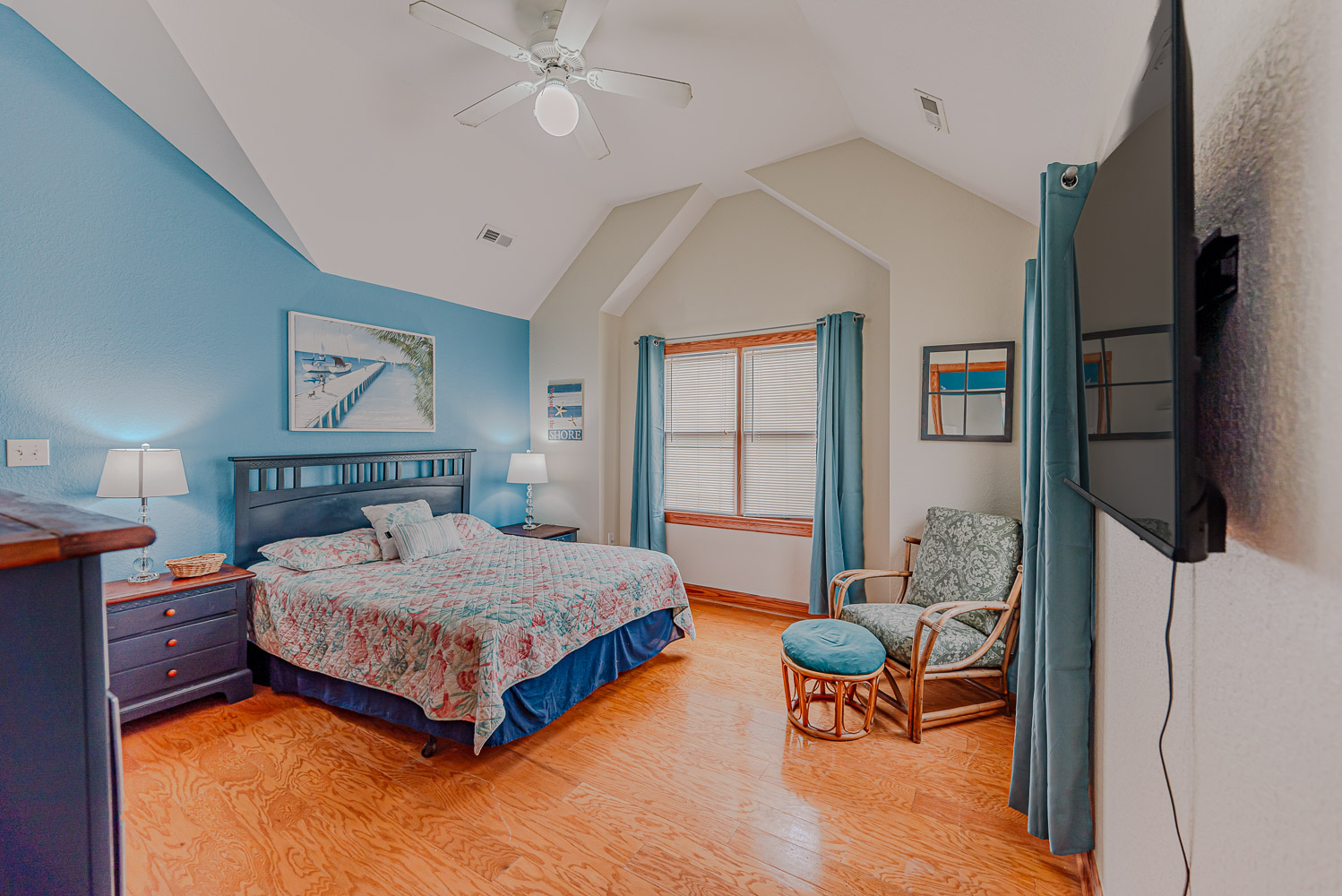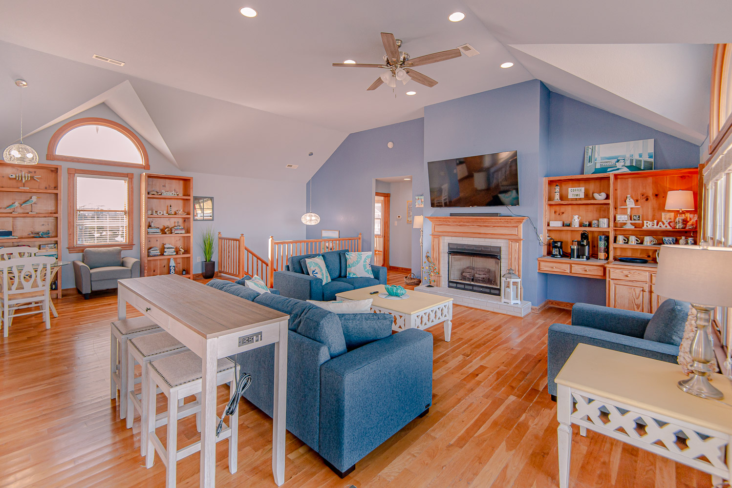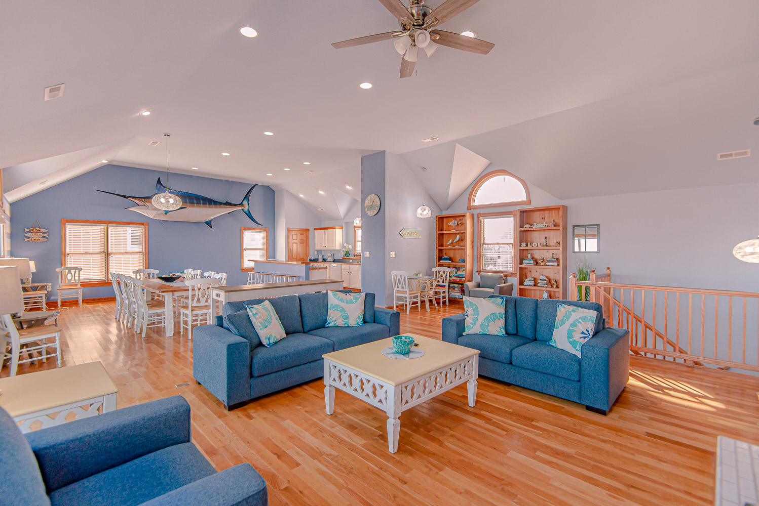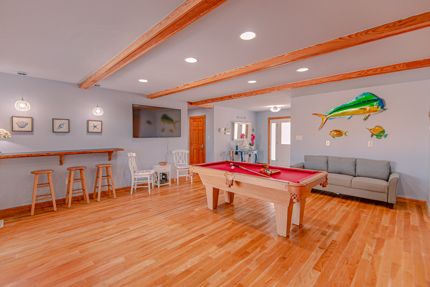 Top Level: Living Area w/Entertainment Center, TV, Dining Area w/Seating for 10+. Galley Style Kitchen w/Bar Seating for 4, Hardwood Floors, 2 Bedrooms (Private Suite w/King, TV, and Full Bath w/Jetted Tub/Shower Combo, Private Suite w/Queen, TV, and Full Bath w/Shower), Hall Half Bath, and Large Sun Deck Overlooking Pool w/Ocean Views and Deck Furniture.