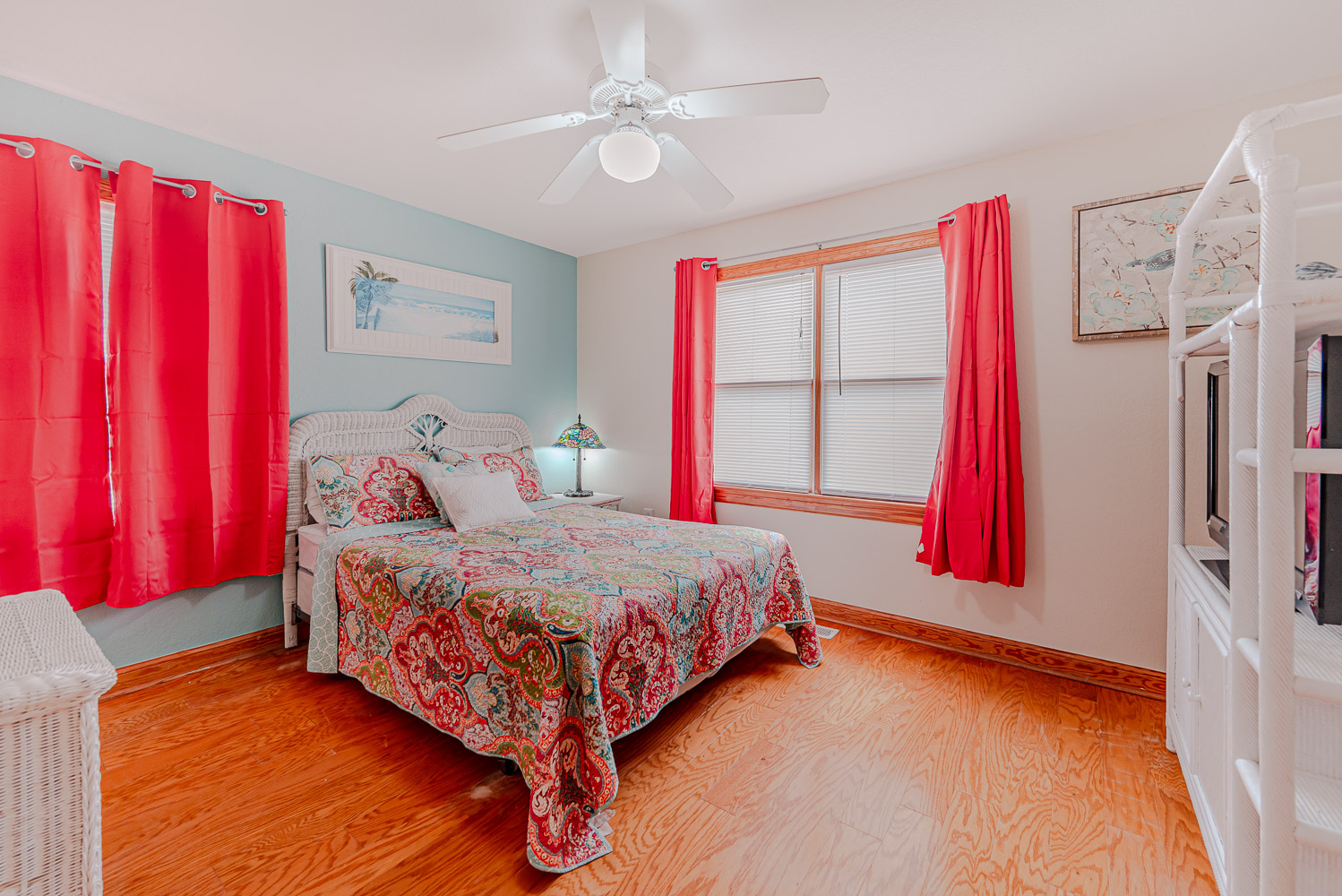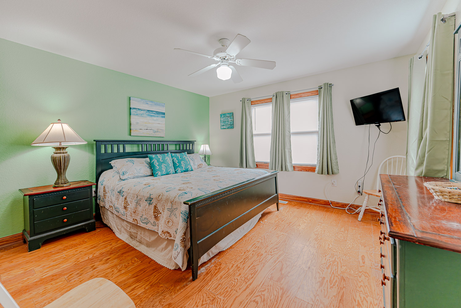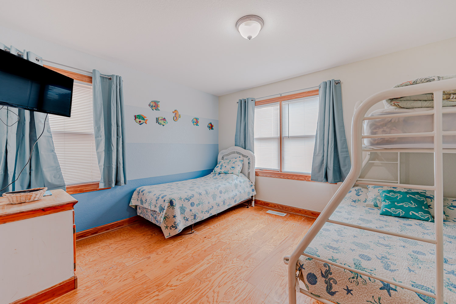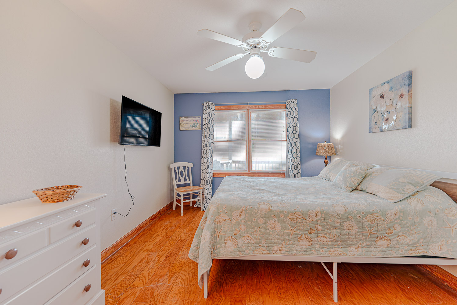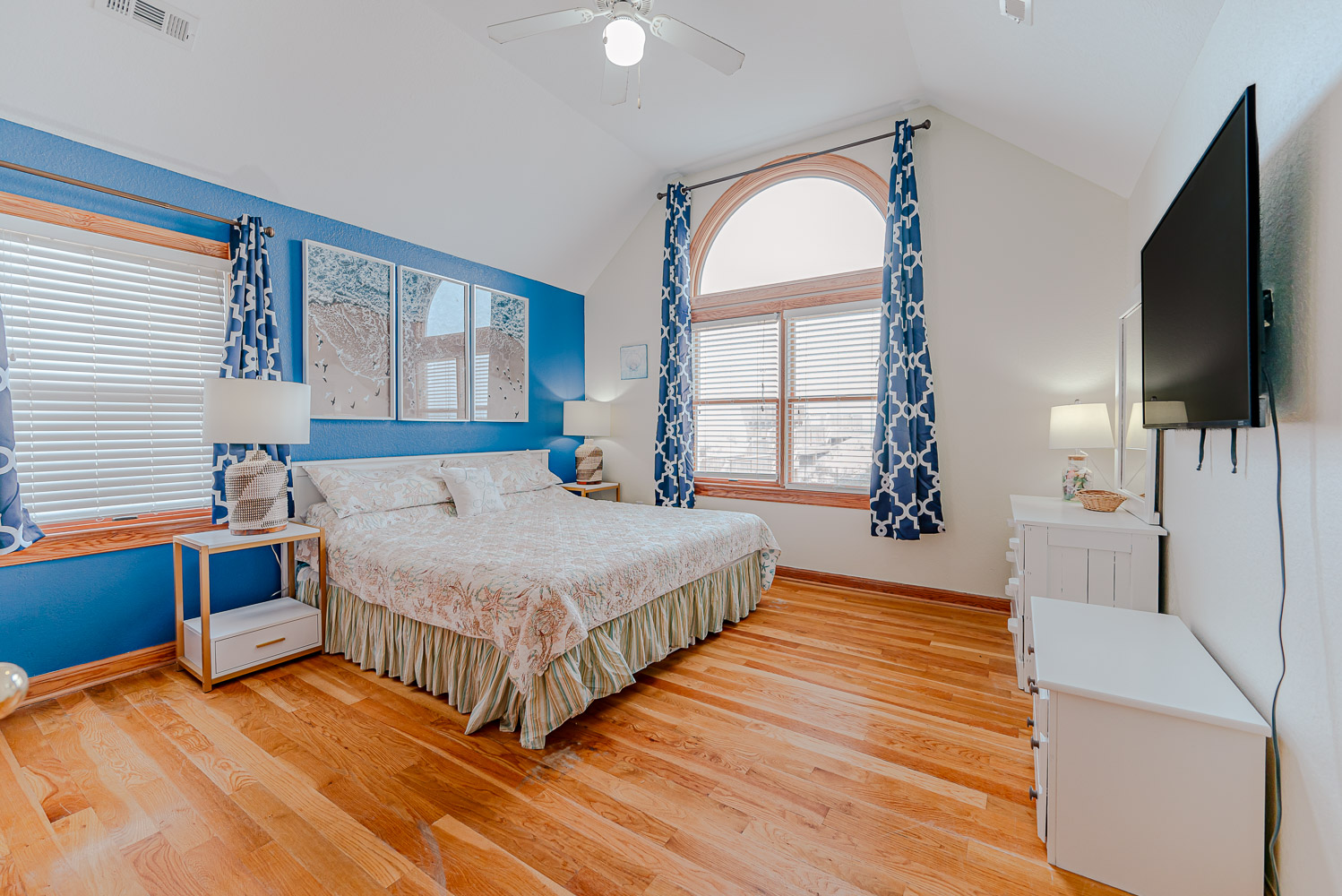 Top Level: Living Area w/Entertainment Center, TV, Dining Area w/Seating for 10+. Galley Style Kitchen w/Bar Seating for 4, Hardwood Floors, 2 Bedrooms (Private Suite w/King, TV, and Full Bath w/Jetted Tub/Shower Combo, Private Suite w/Queen, TV, and Full Bath w/Shower), Hall Half Bath, and Large Sun Deck Overlooking Pool w/Ocean Views and Deck Furniture.
