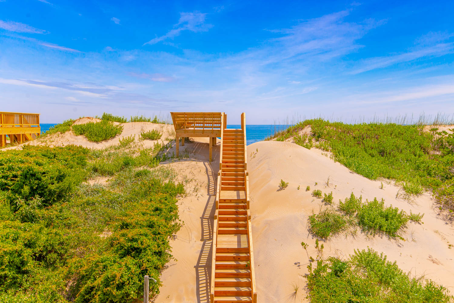 Ground Level: Parking for 6 Cars, Steps to Mid Level Covered Entry, Cornhole Boards, Large Front Yard w/Enhanced Landscaping, Fenced-In Pool Area w/Lighting, Private Swimming Pool - Open Seasonally, Hot Tub, Gas Grill, and Private Walk Way to Dune Top Deck w/Built-In Seating and Steps to Beach.