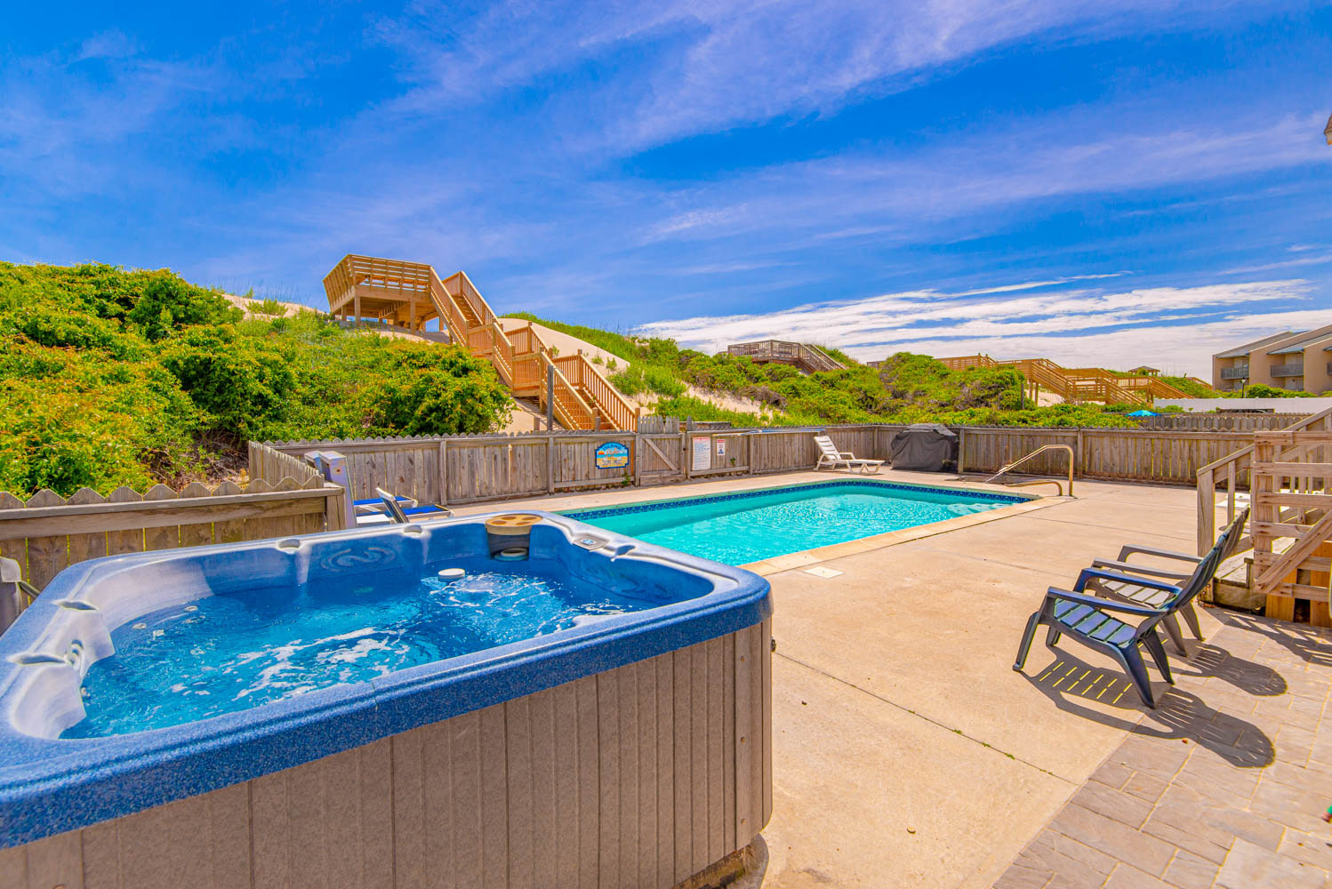 Ground Level: Parking for 6 Cars, Steps to Mid Level Covered Entry, Cornhole Boards, Large Front Yard w/Enhanced Landscaping, Fenced-In Pool Area w/Lighting, Private Swimming Pool - Open Seasonally, Hot Tub, Gas Grill, and Private Walk Way to Dune Top Deck w/Built-In Seating and Steps to Beach.