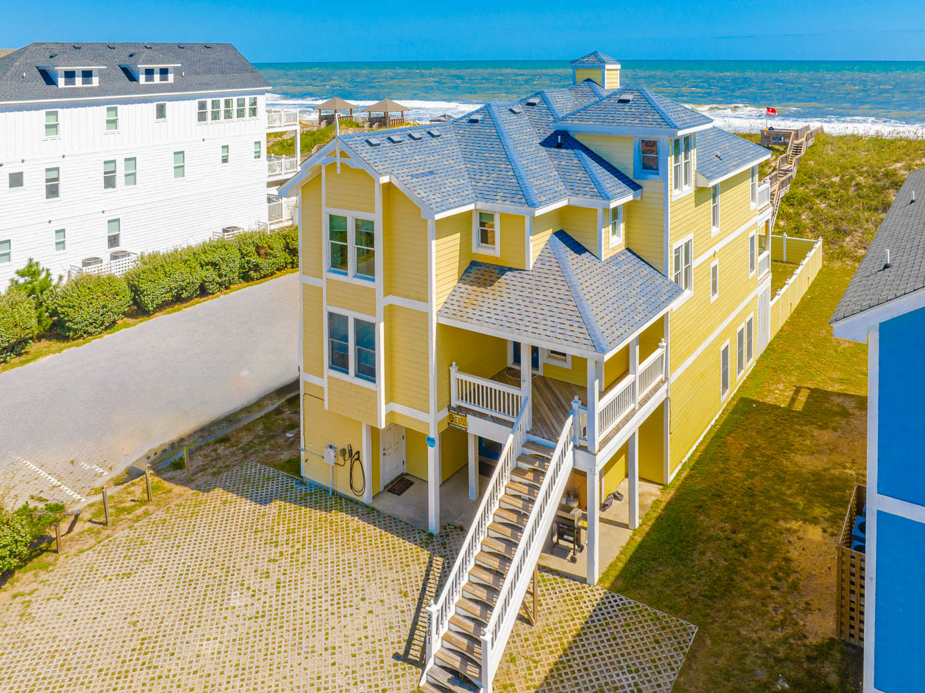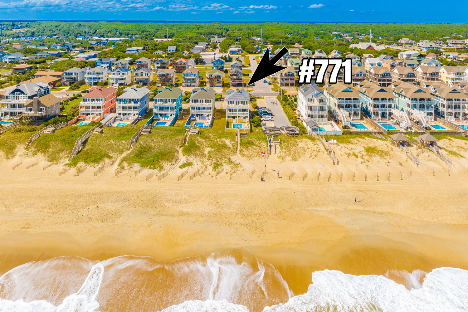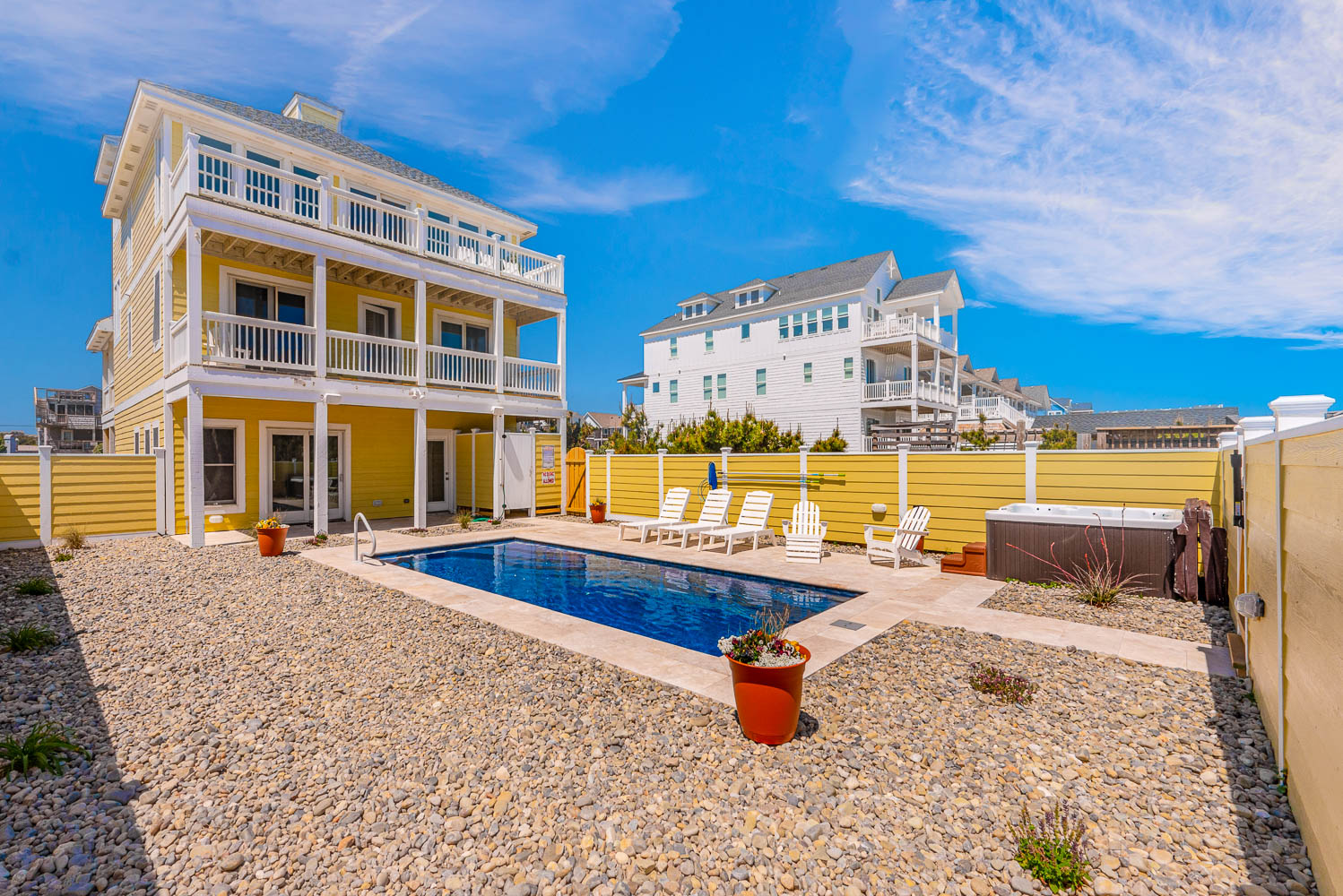 Ground Level: Parking for 6 Cars, EV Charging Station, Covered Entry, Elevator to All Floors, Rec. Room w/Pool Table, Game Table, Wet Bar, Refrigerator, Icemaker, Large Flat Panel TV, Separate TV for Gaming Devices, 3 Bedrooms (Private Suite w/Duo Bunk, Full Bath; 1 w/Duo Bunk, 1 w/Bunk Set), Full Shared Bath, Access to Patio Area, Private 13 x 25 Heated Swimming Pool - Open Seasonally. (Can Be Heated for $400.00 Per Week, Plus Tax- Please Bear in Mind that Pool Temperature is Subject to Outside Temperatures and Conditions), Hot Tub , 6 Ft. Privacy Fence, and Private Walkway to Dune Top Deck w/Ocean Views.
