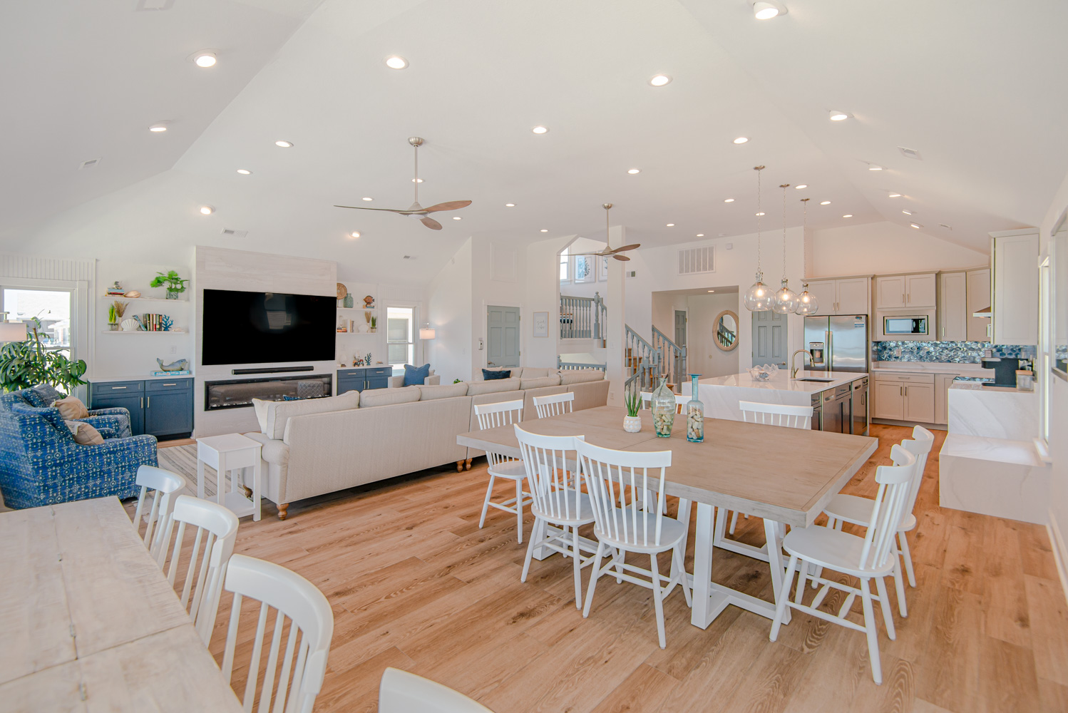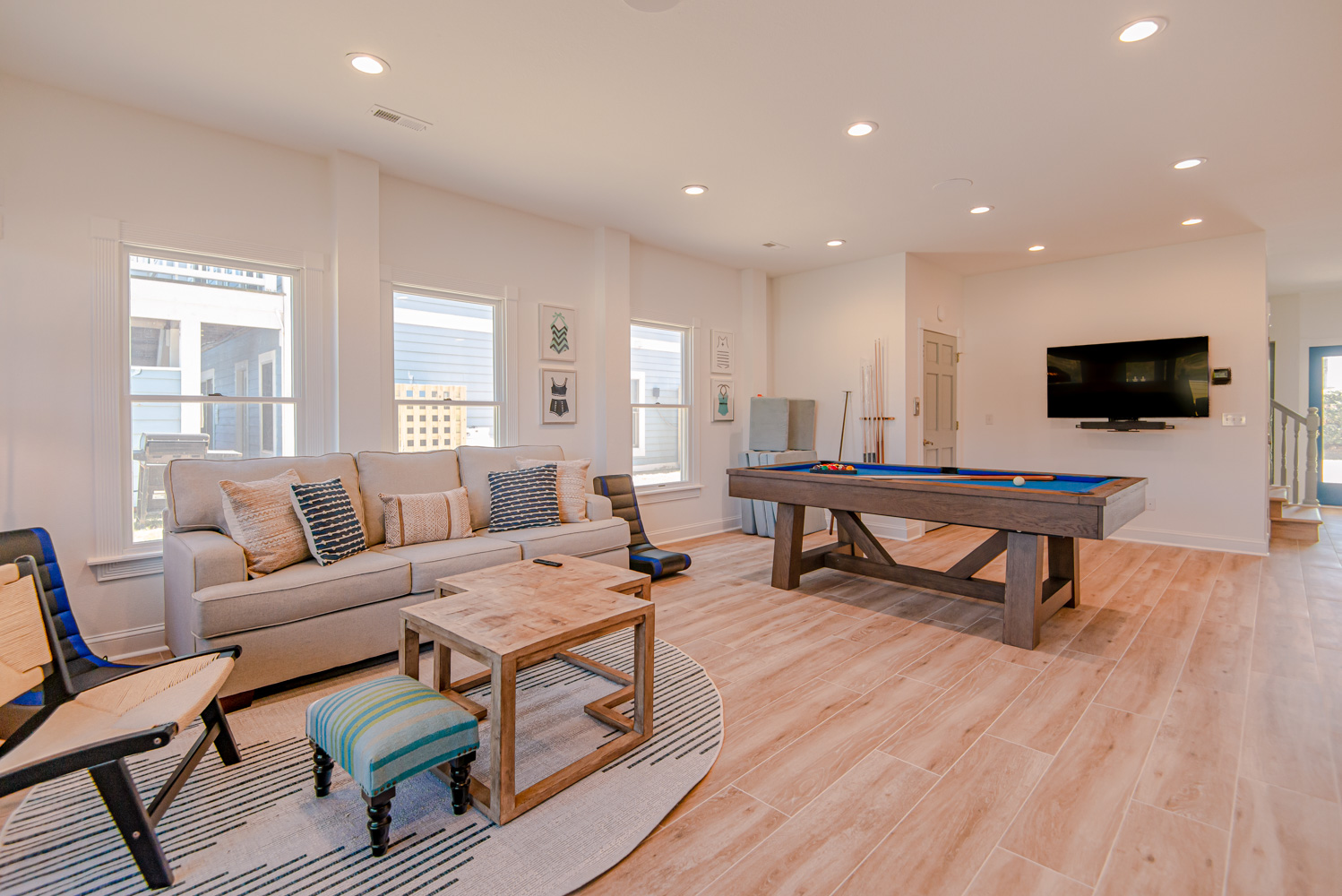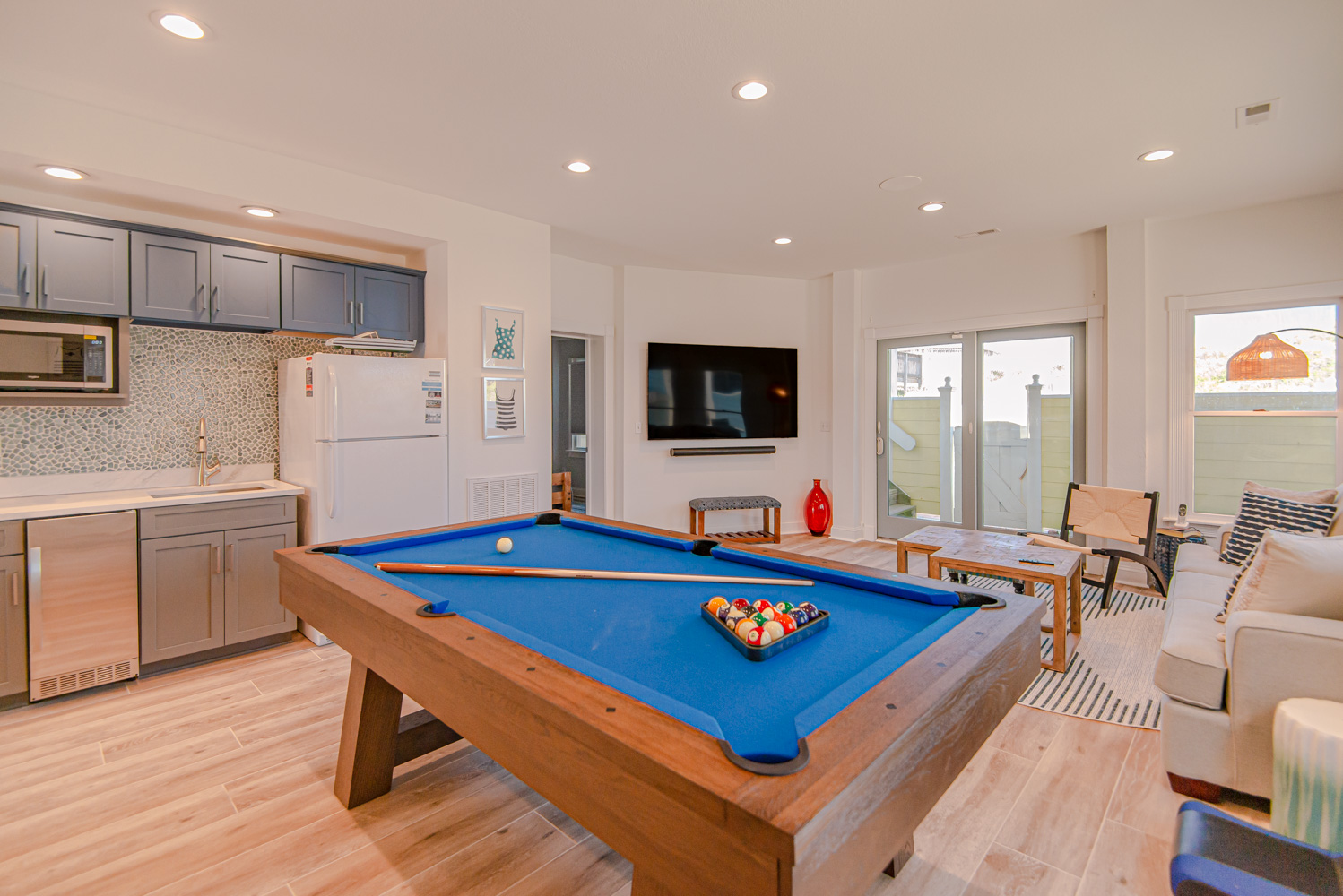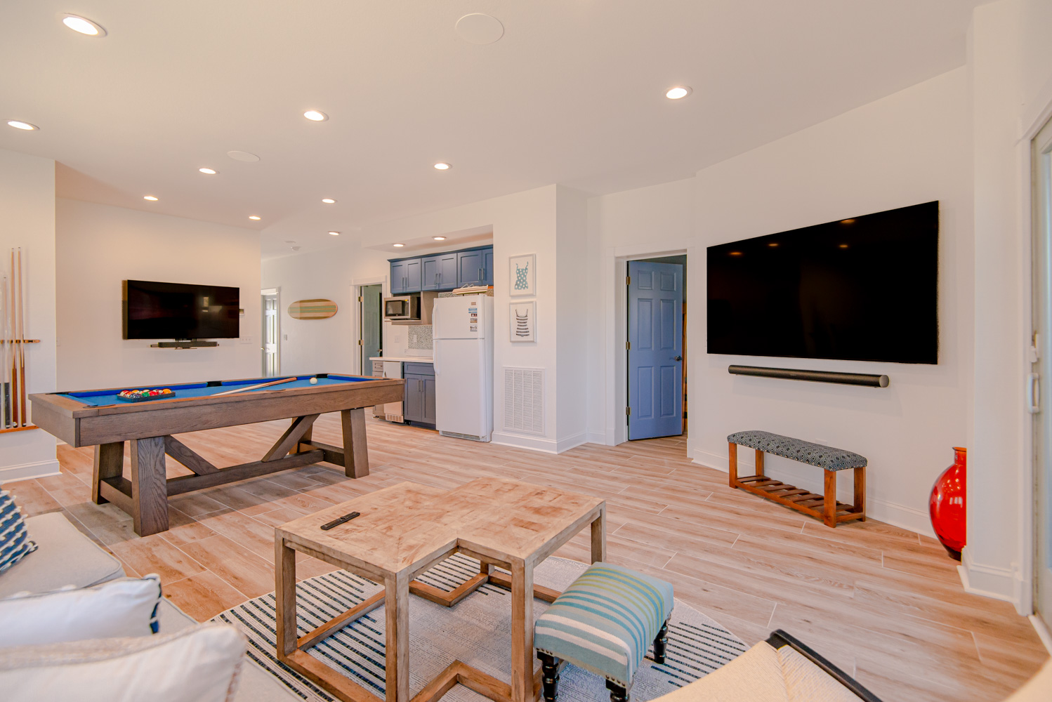 Recent major renovations included an all-new kitchen with new cabinets, granite counters, island bar w/seating and appliances. Premium vinyl plank flooring throughout the home, new living area furnishings, new dining room furnishings, new rec. room furnishings, new pool table, video arcade machine, new top-level private bedroom furnishings, New Smart TV’s throughout (all bedrooms have 43" Smart TV's), new tile in the baths and enhanced décor. This home is fabulous with high-end furnishings and decor throughout!