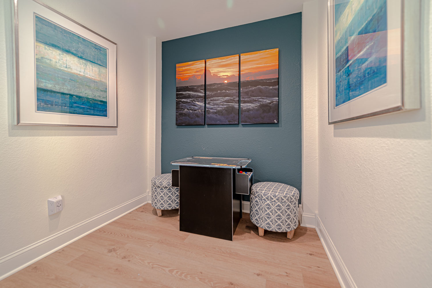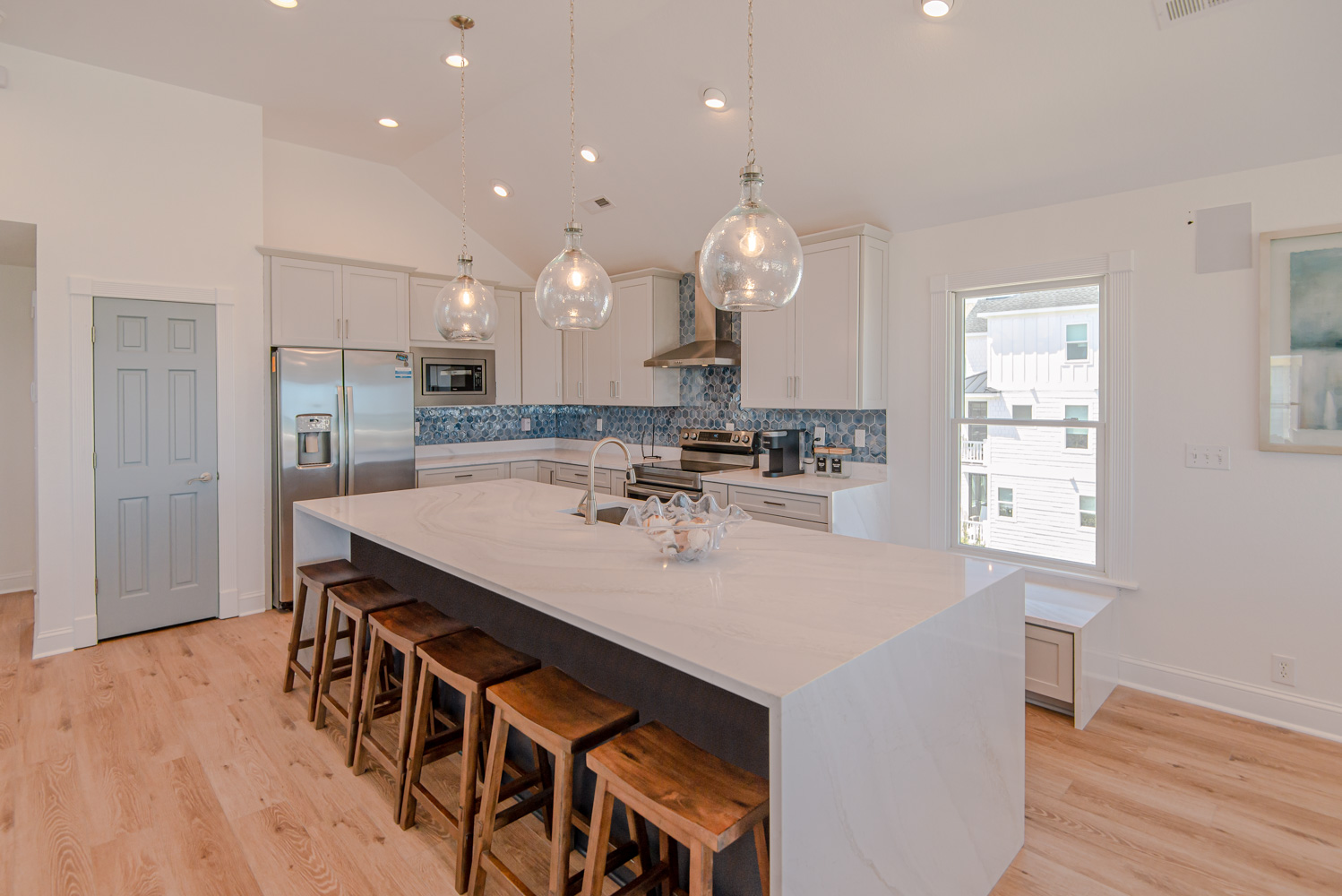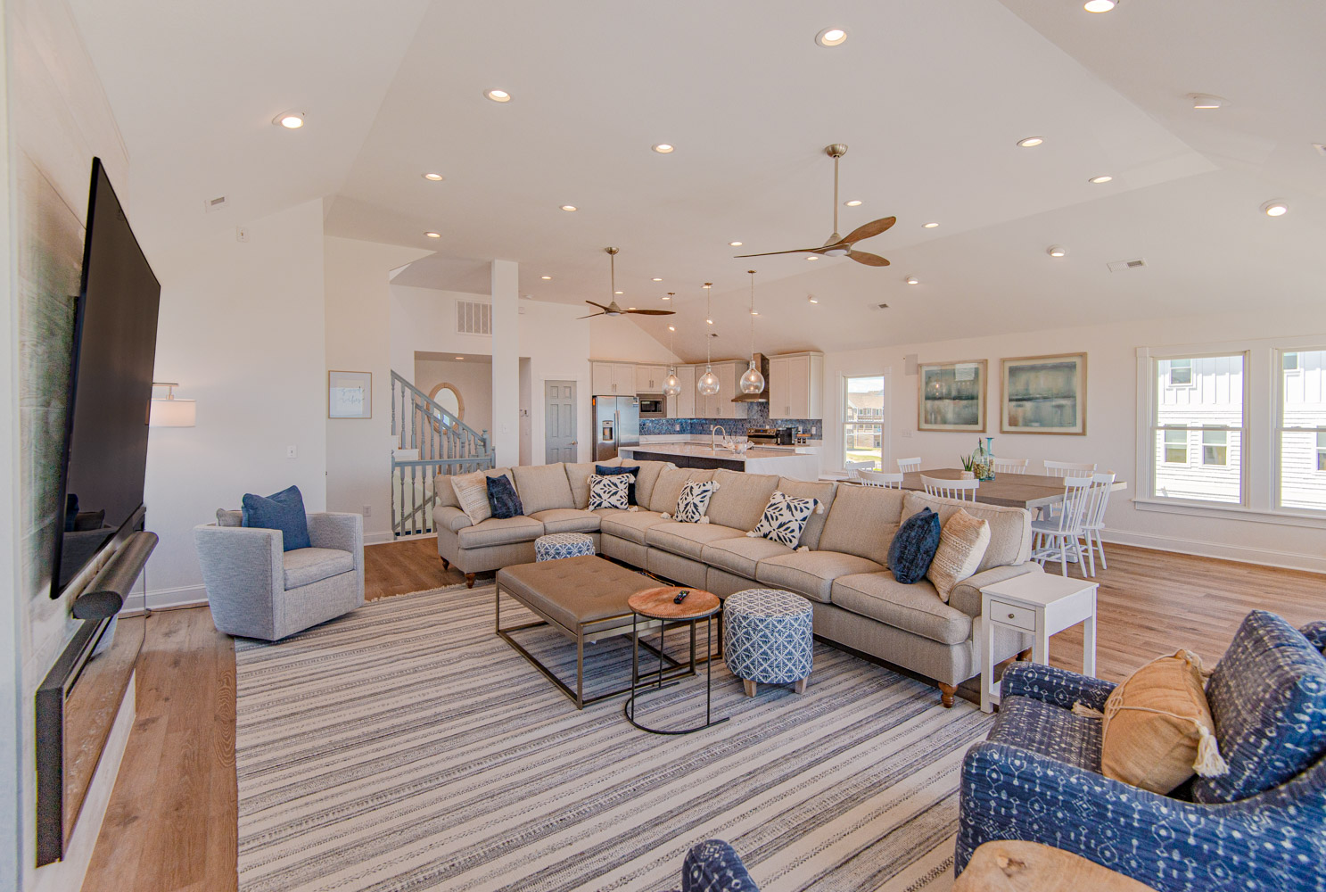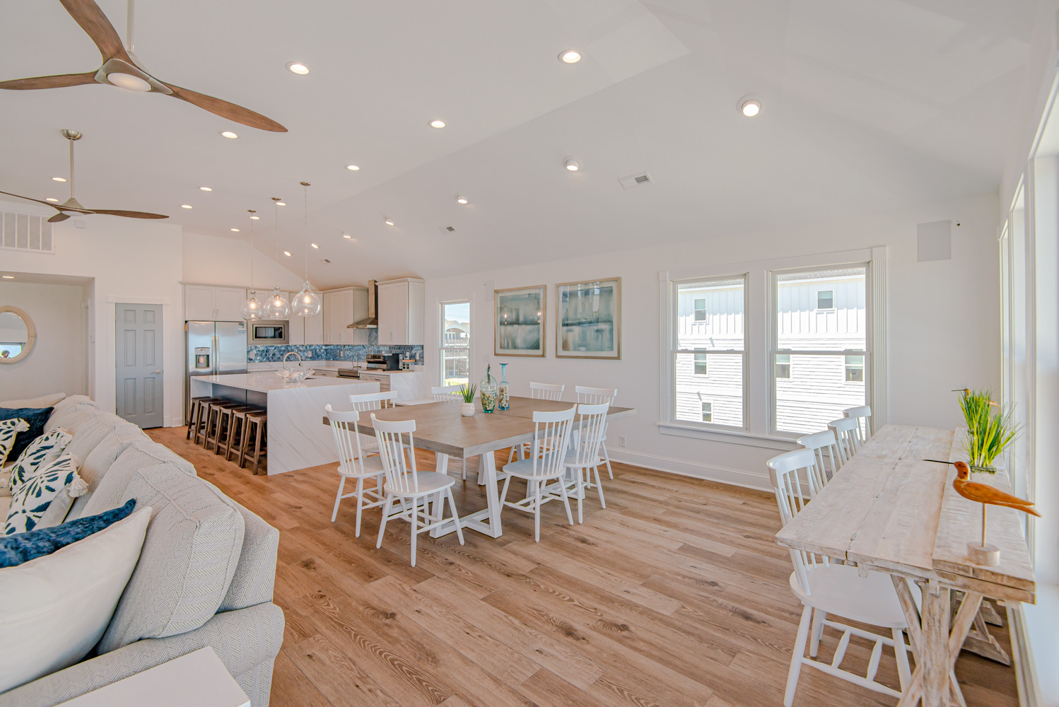 Recent major renovations included an all-new kitchen with new cabinets, granite counters, island bar w/seating and appliances. Premium vinyl plank flooring throughout the home, new living area furnishings, new dining room furnishings, new rec. room furnishings, new pool table, video arcade machine, new top-level private bedroom furnishings, New Smart TV’s throughout (all bedrooms have 43" Smart TV's), new tile in the baths and enhanced décor. This home is fabulous with high-end furnishings and decor throughout!