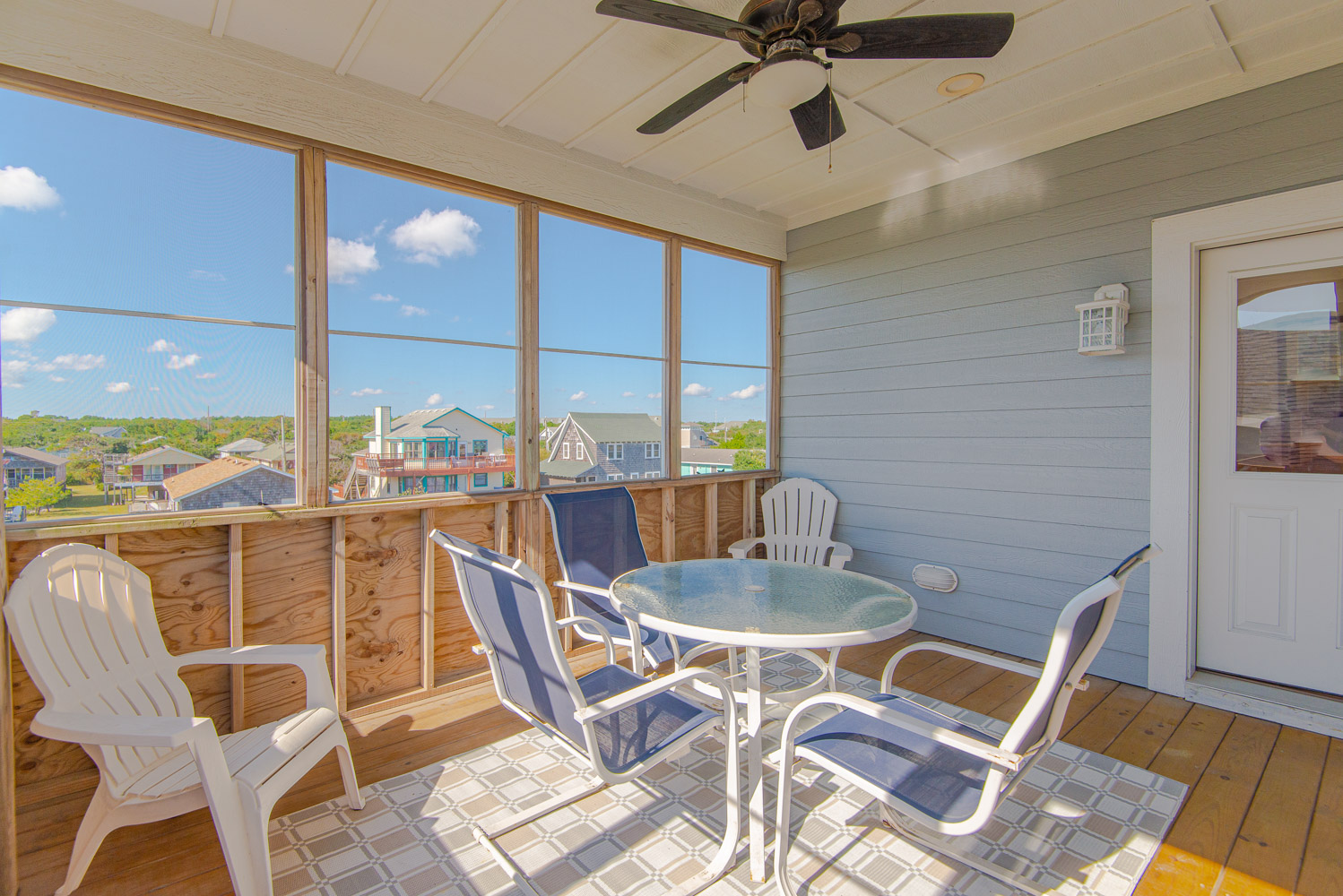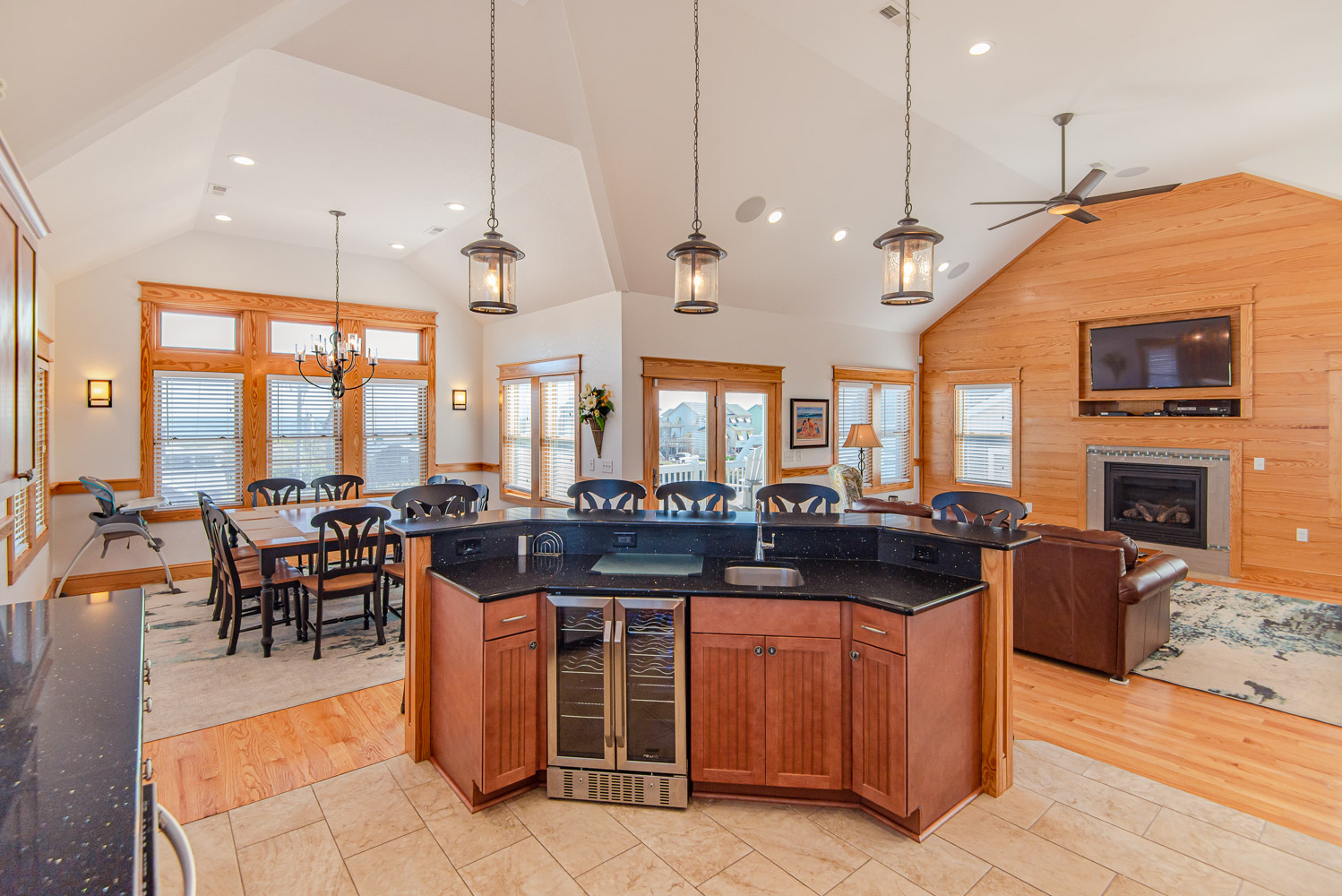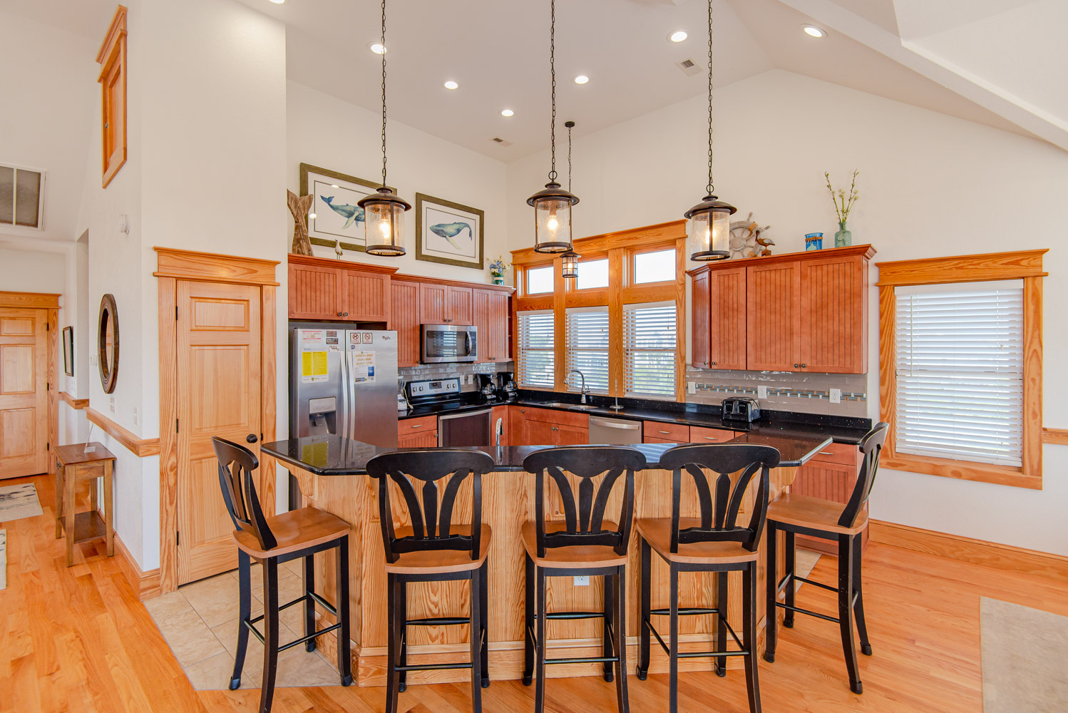 Top Level: Beautifully Decorated Living Area; Queen Sleep Sofa, Smart TV, Surround Sound, Exterior Vented Gas Fireplace; Dining Area, Kitchen Area w/Island Bar w/Wine Cooler; Half Bath, Private Suite w/King, TV, Full Bath; Screen Porch Overlooking Pool, and Large Sun Deck w/Built Out Bench, 2 Dolphin Watch Chairs w/Great Ocean Views.