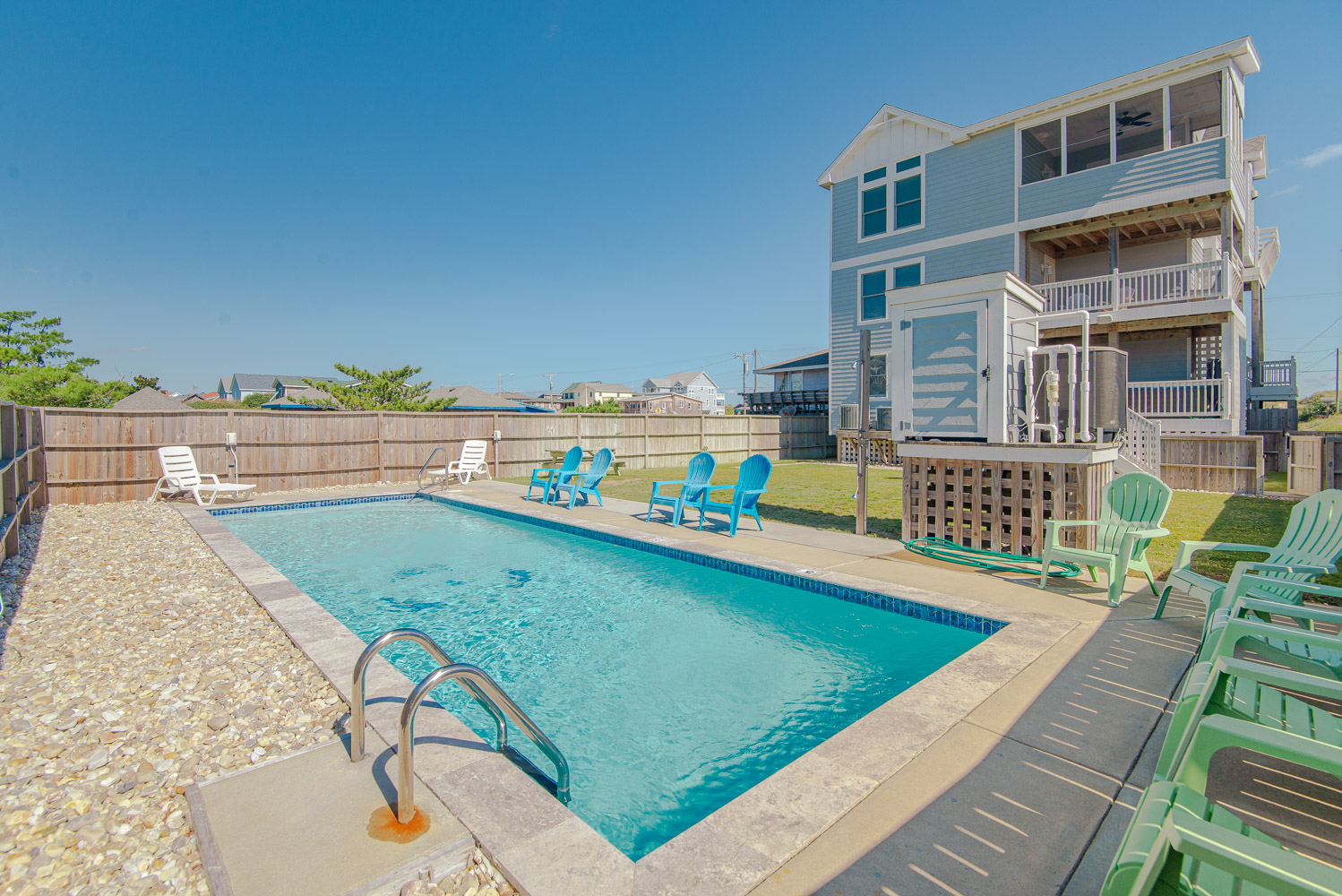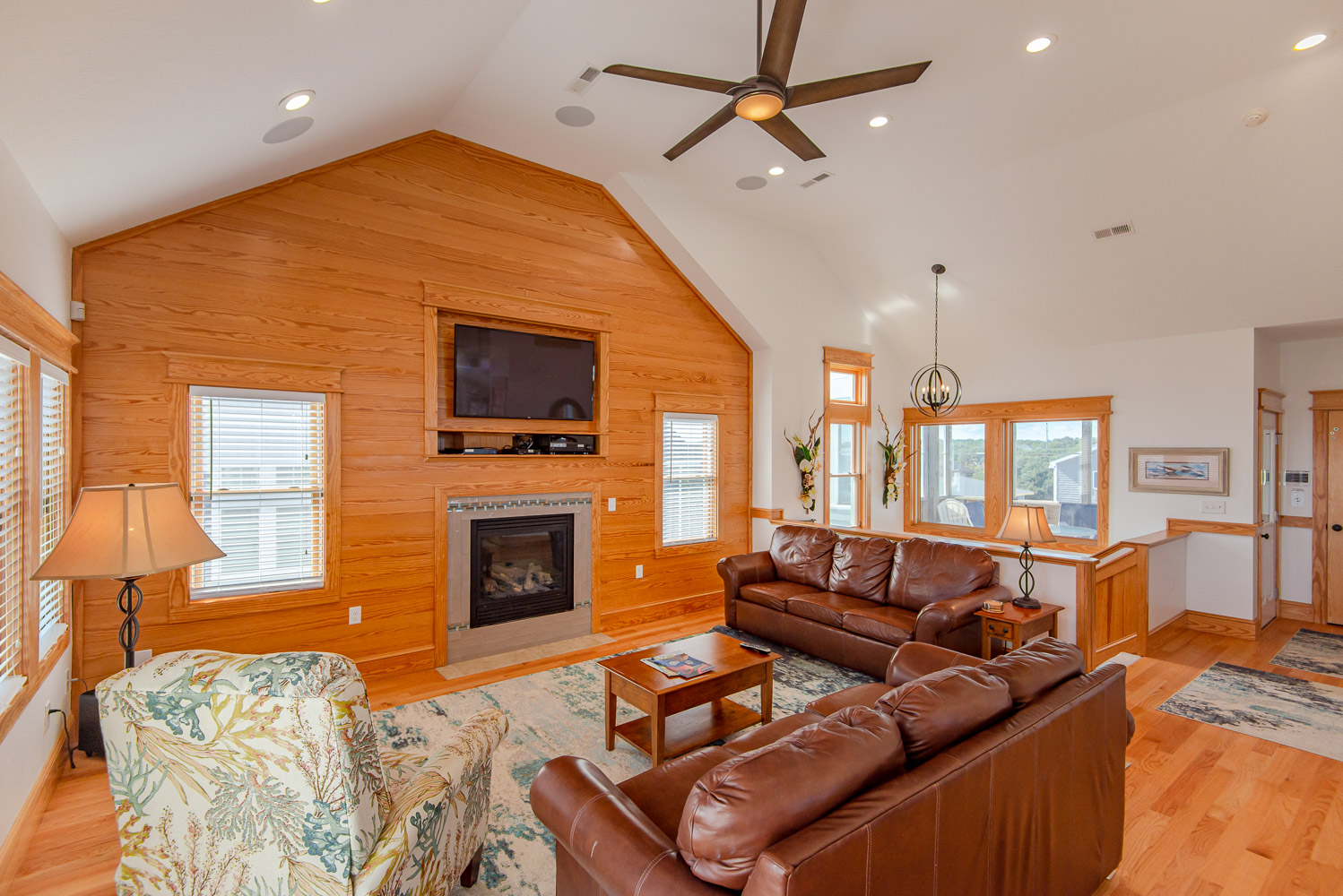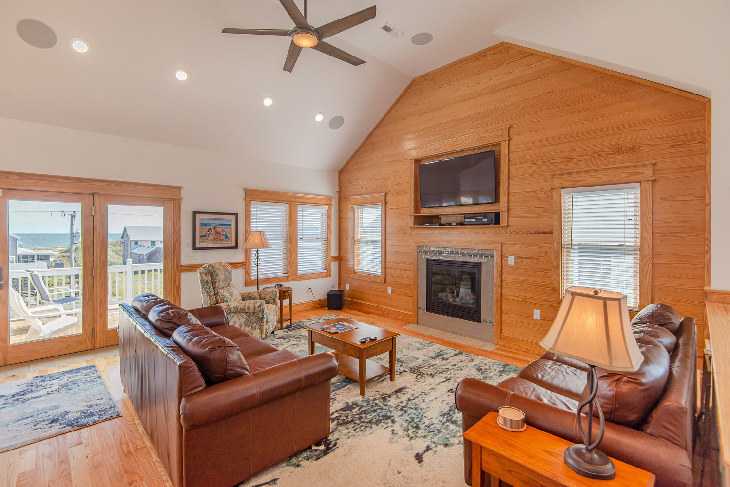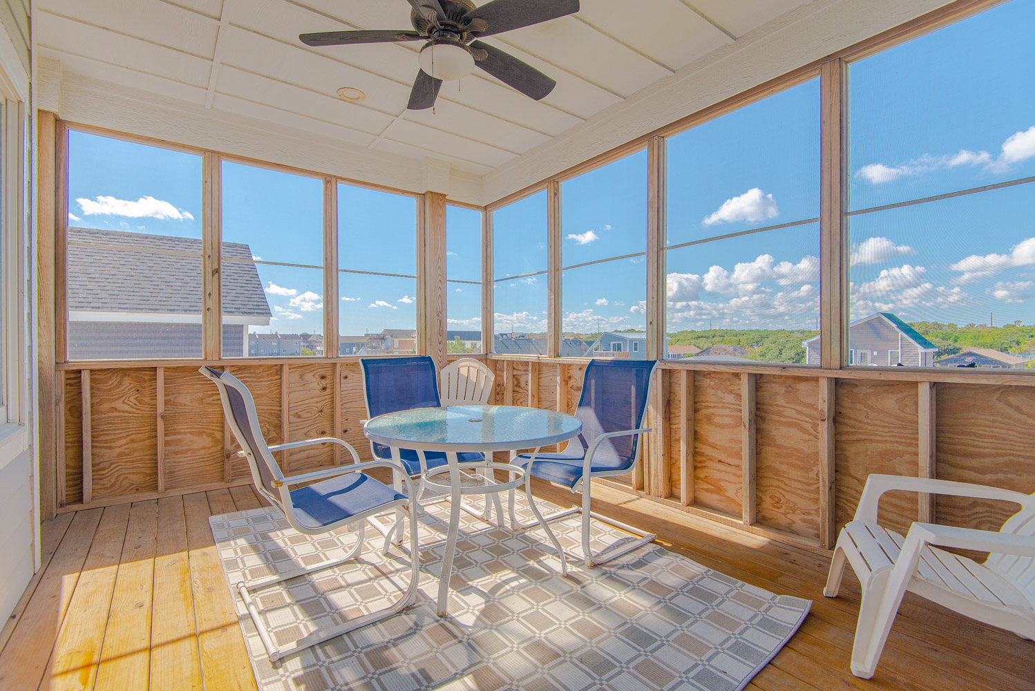 Top Level: Beautifully Decorated Living Area; Queen Sleep Sofa, Smart TV, Surround Sound, Exterior Vented Gas Fireplace; Dining Area, Kitchen Area w/Island Bar w/Wine Cooler; Half Bath, Private Suite w/King, TV, Full Bath; Screen Porch Overlooking Pool, and Large Sun Deck w/Built Out Bench, 2 Dolphin Watch Chairs w/Great Ocean Views.