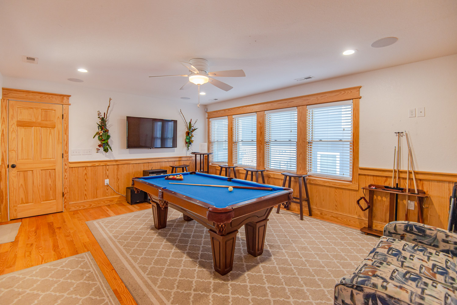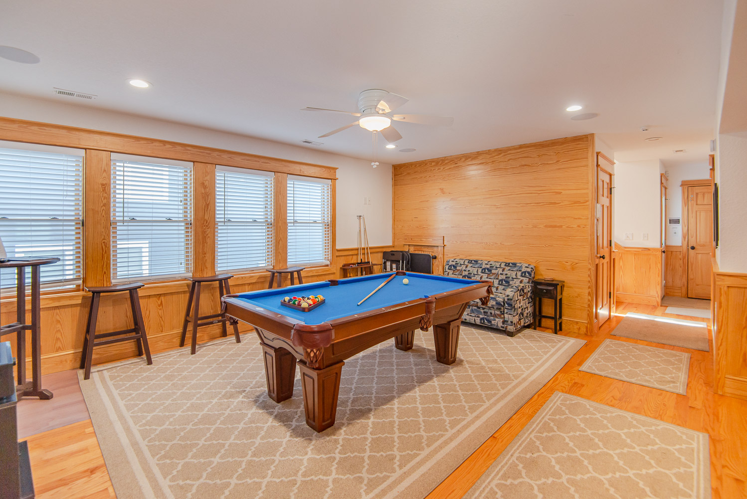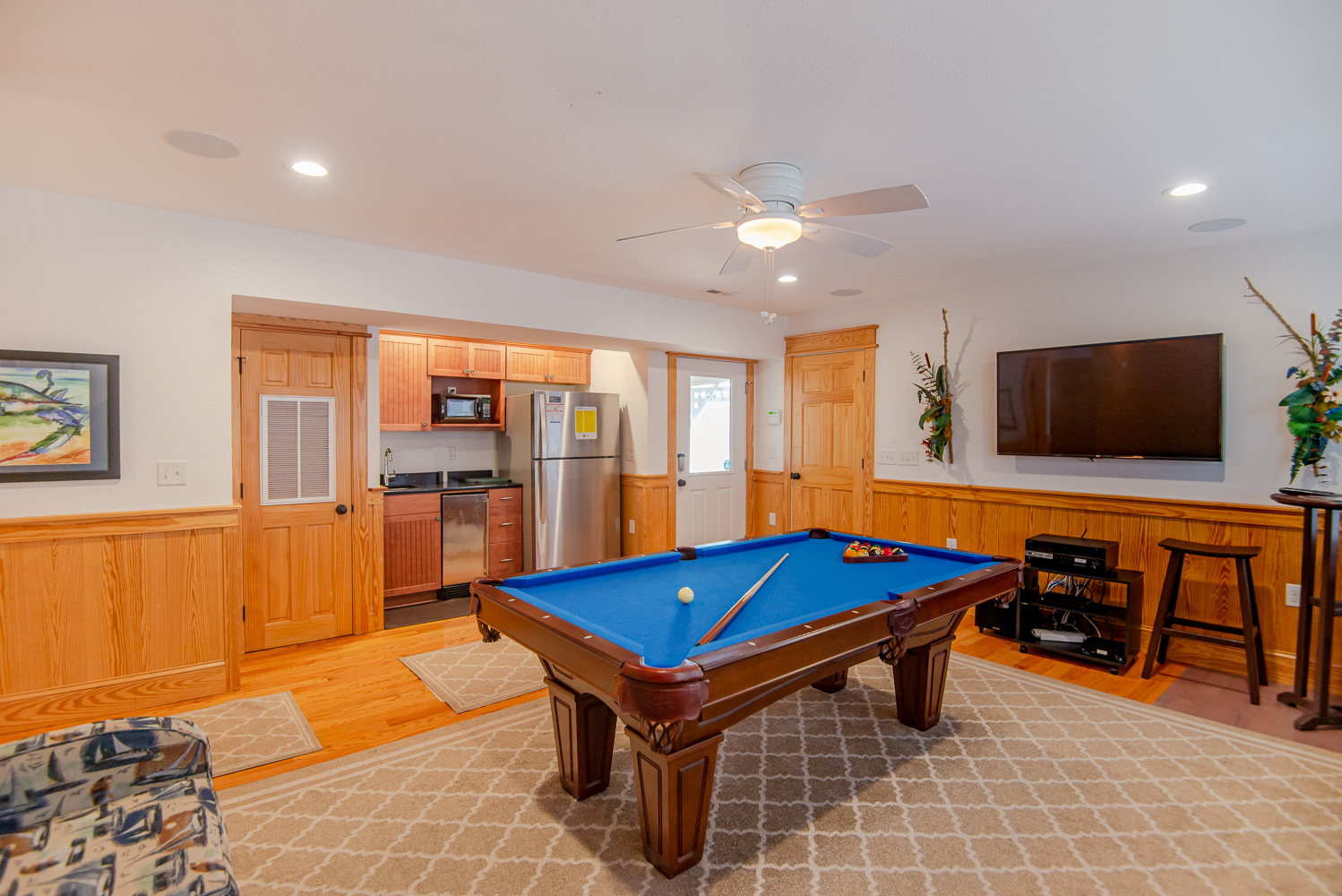 First Level: Elevated (Approx. 6 Steps Up), Covered Entry, Rec. Room w/Pool Table, Smart TV, Surround Sound, Wet Bar, Microwave, Ice Maker, Full Size Refrigerator; Den w/Smart TV, Queen Sleep Sofa, Full Bath, Elevator to Upper Floors, Access to Patio Area w/Hot Tub, and Deck w/Steps to Gated Area and Access to Private Swimming Pool.