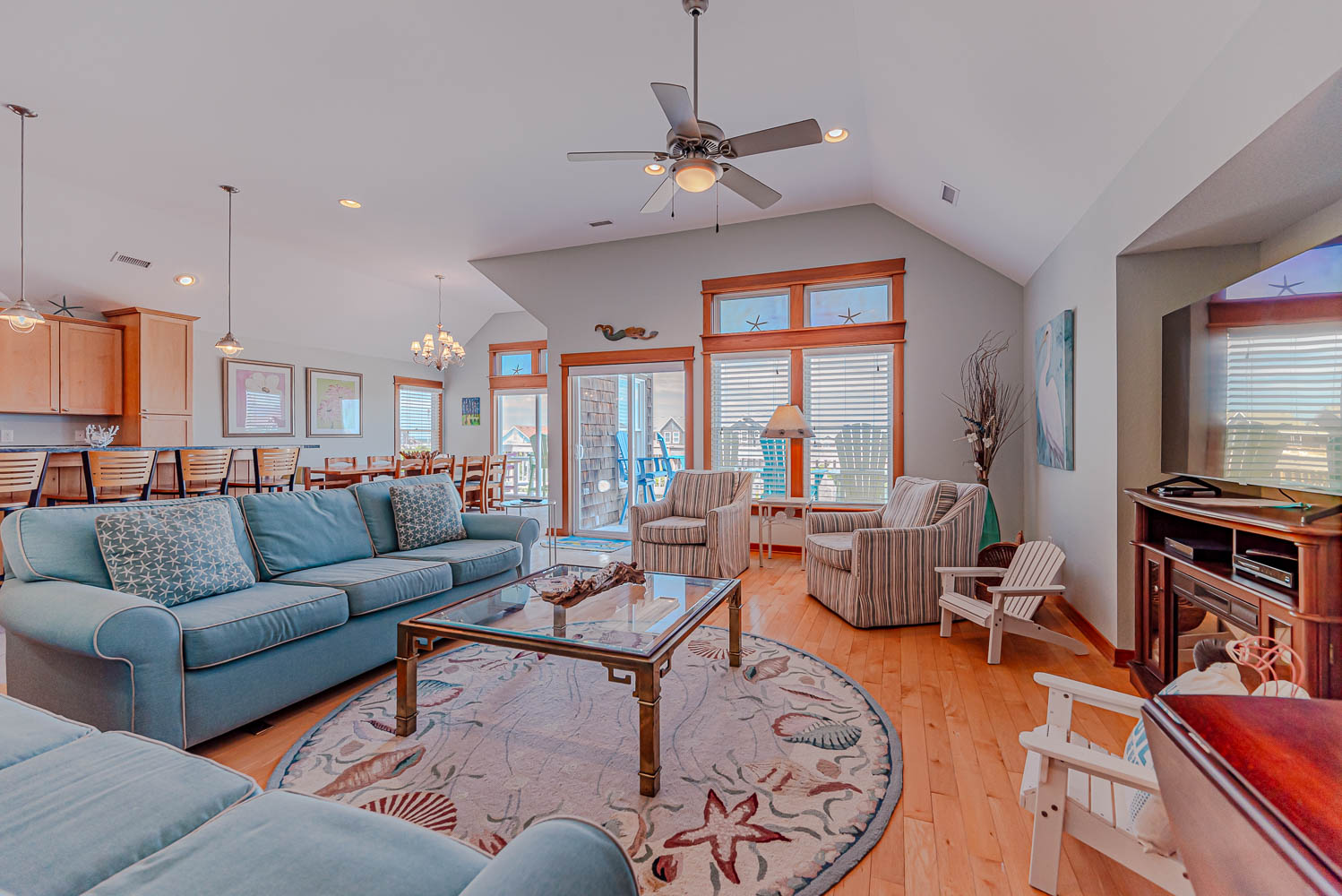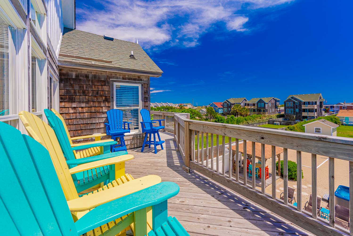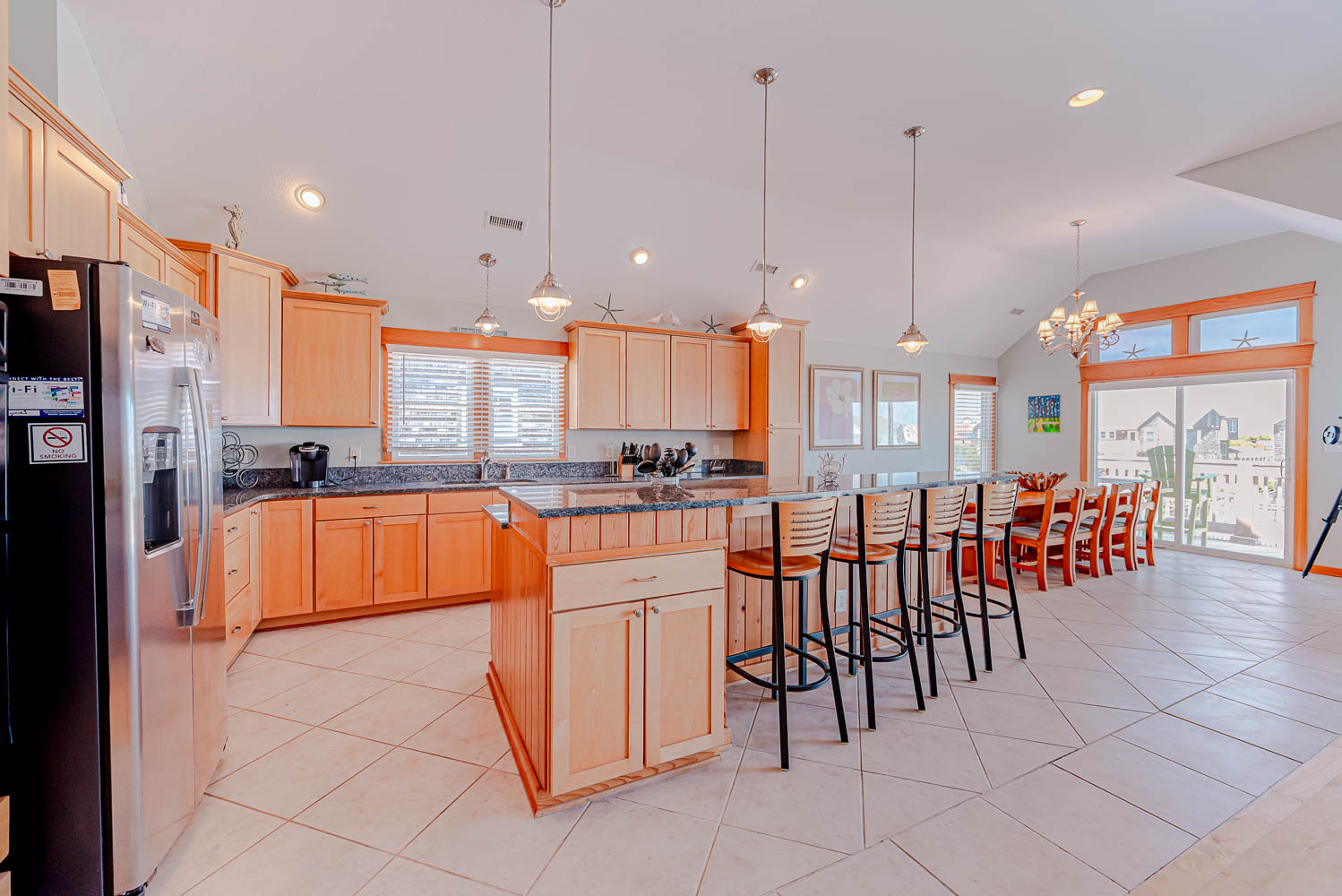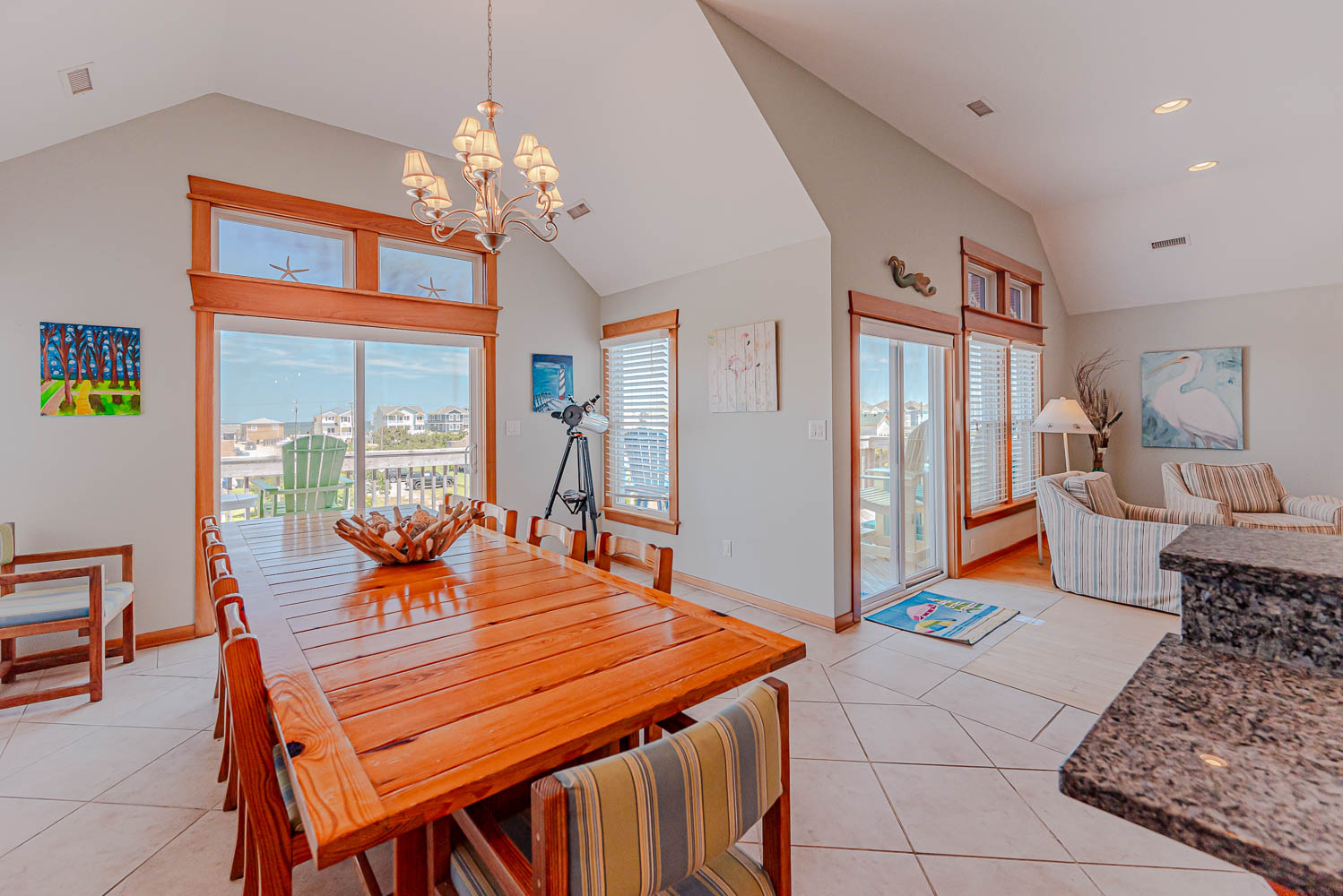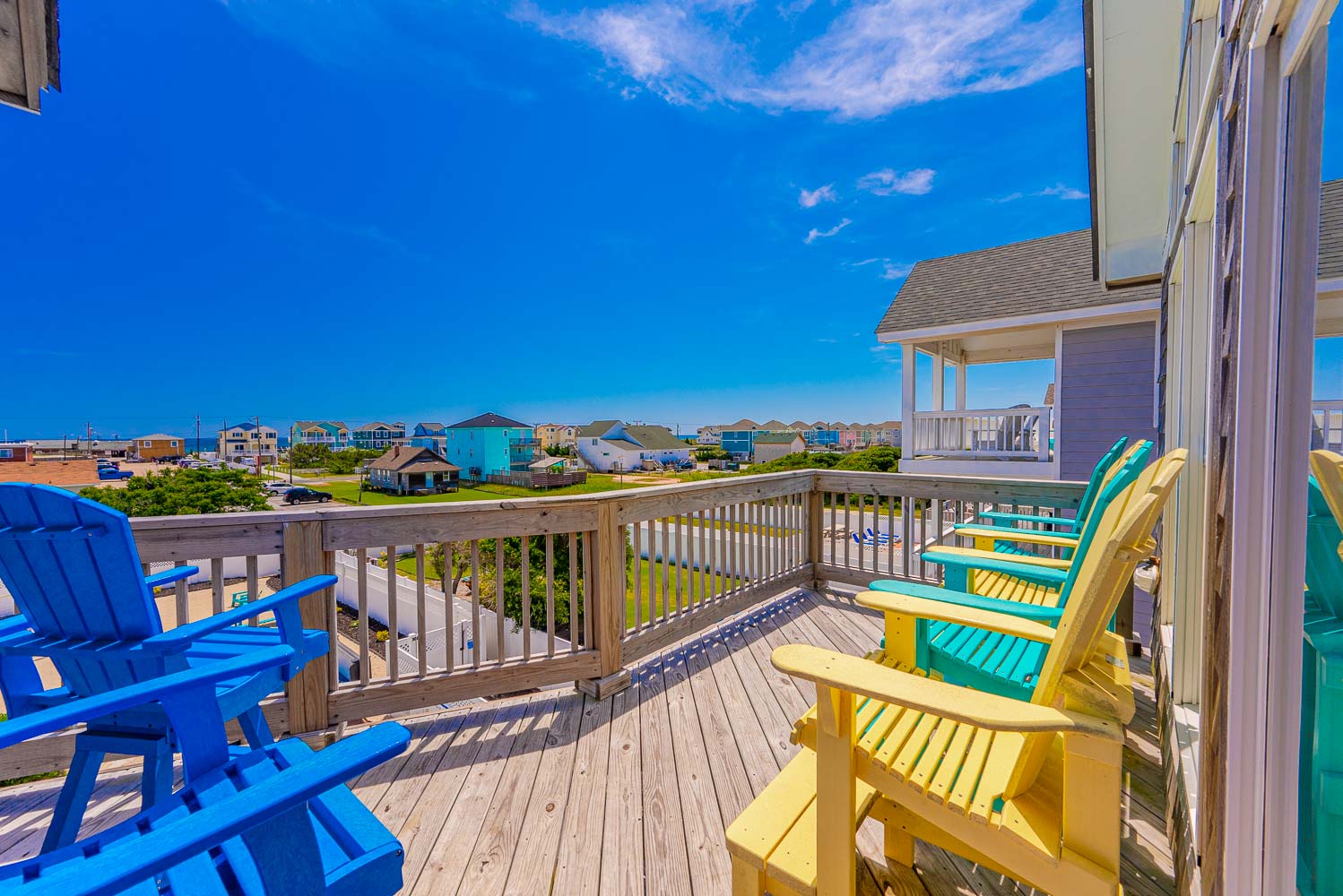 Top Level: Great Room 60 Inch TV, DVD, Fireplace, Ocean View, Deck Access, Kitchen w/Granite, Stainless Steel Appliances, Dining Area w/Seating for Up to 14, Bar Area w/Seating for 4, Half Bath, Private Suite w/King, TV, DVD, Full Bath w/Whirlpool Tub and Shower, Uncovered Deck, and Sun Deck and Deck Chairs.