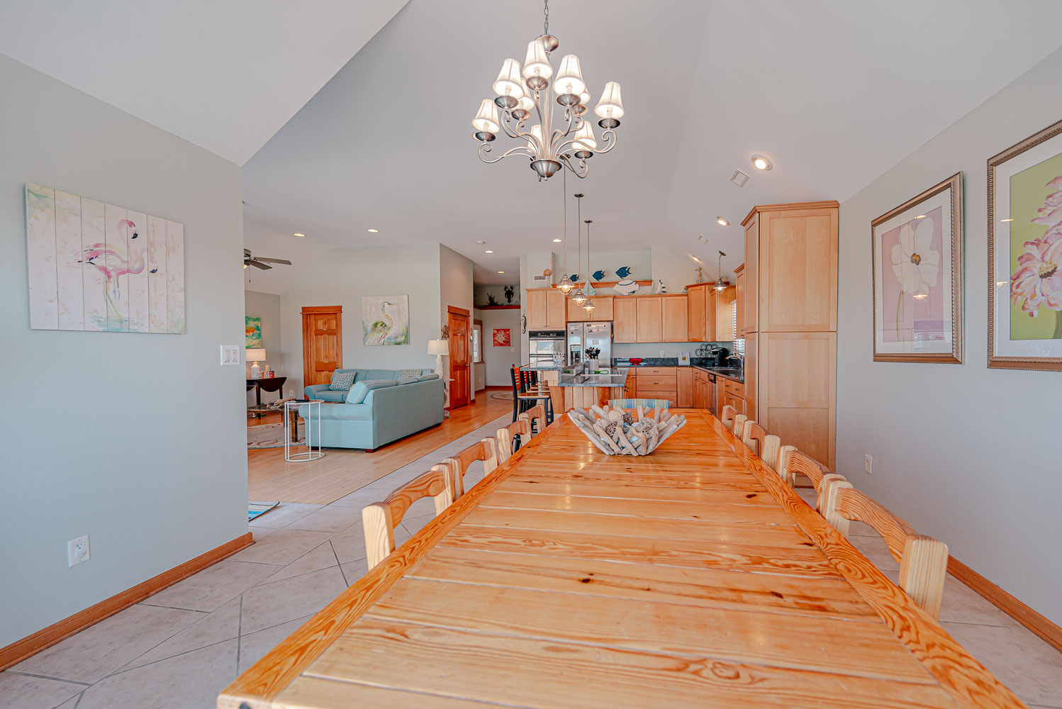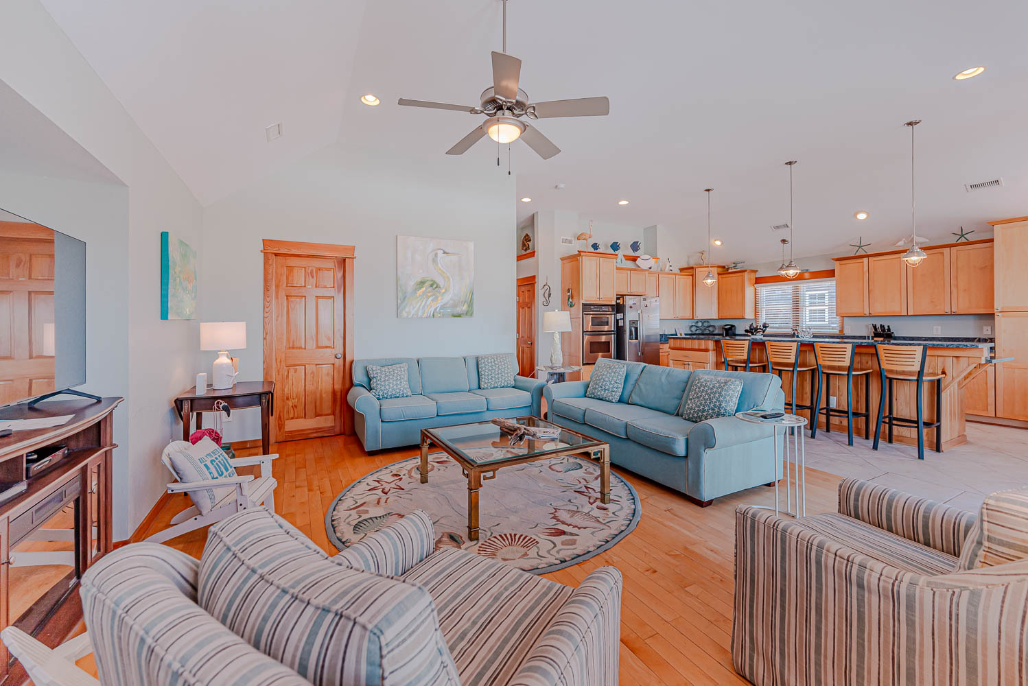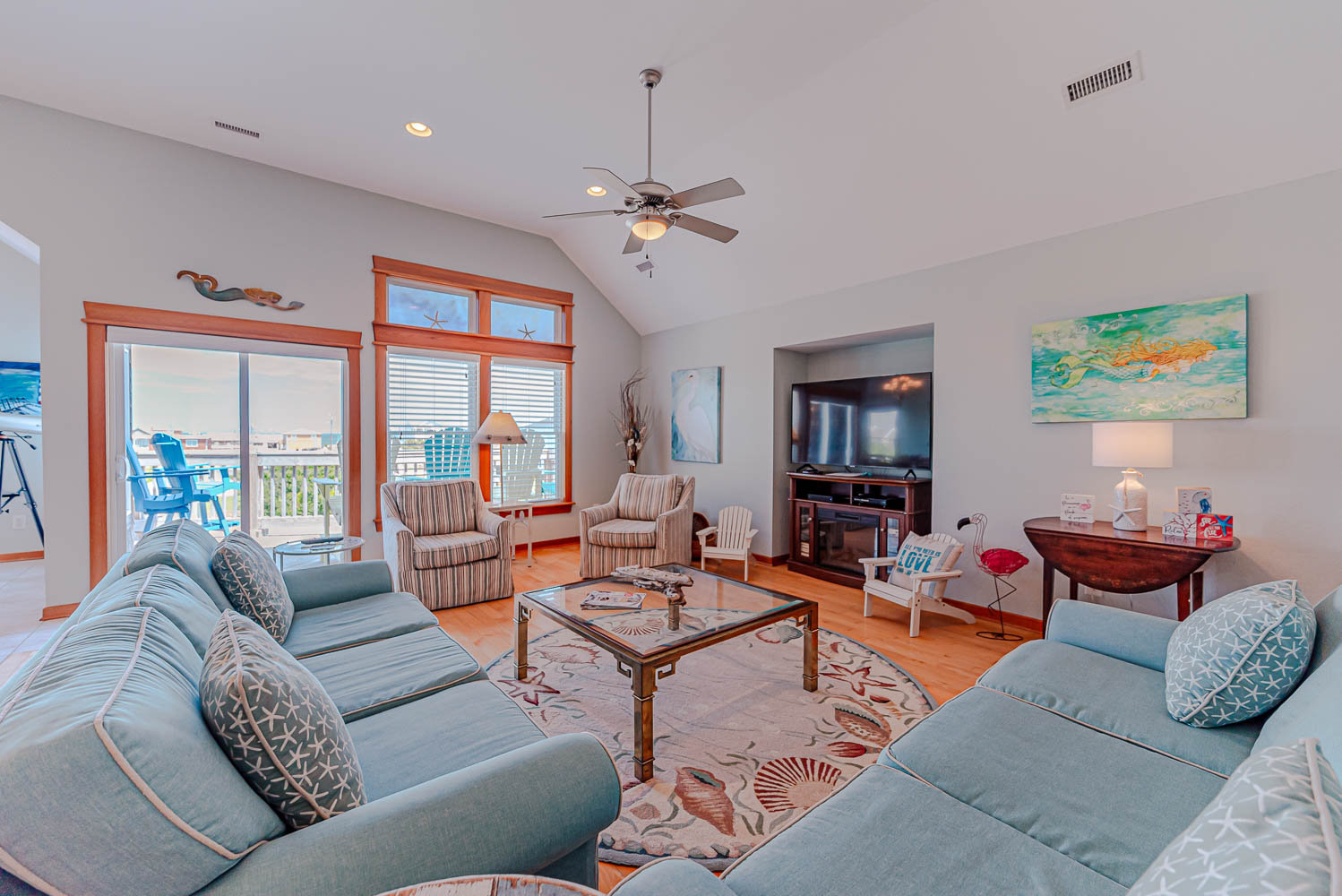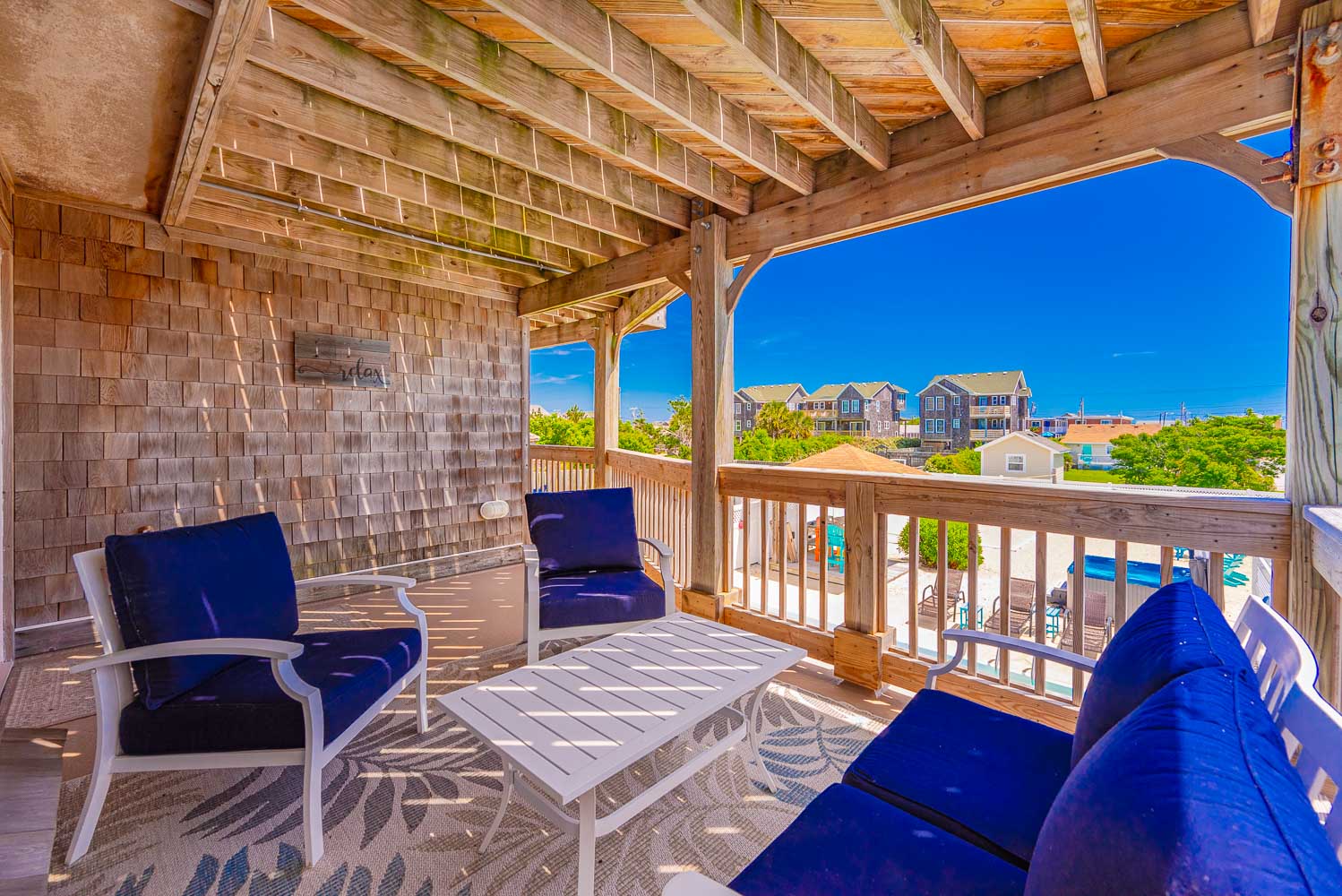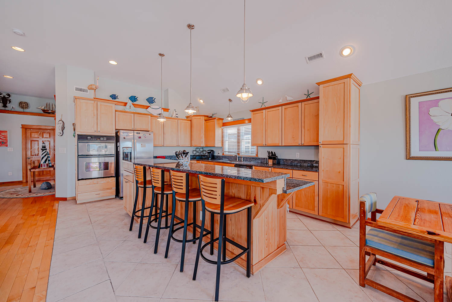 Top Level: Great Room 60 Inch TV, DVD, Fireplace, Ocean View, Deck Access, Kitchen w/Granite, Stainless Steel Appliances, Dining Area w/Seating for Up to 14, Bar Area w/Seating for 4, Half Bath, Private Suite w/King, TV, DVD, Full Bath w/Whirlpool Tub and Shower, Uncovered Deck, and Sun Deck and Deck Chairs.