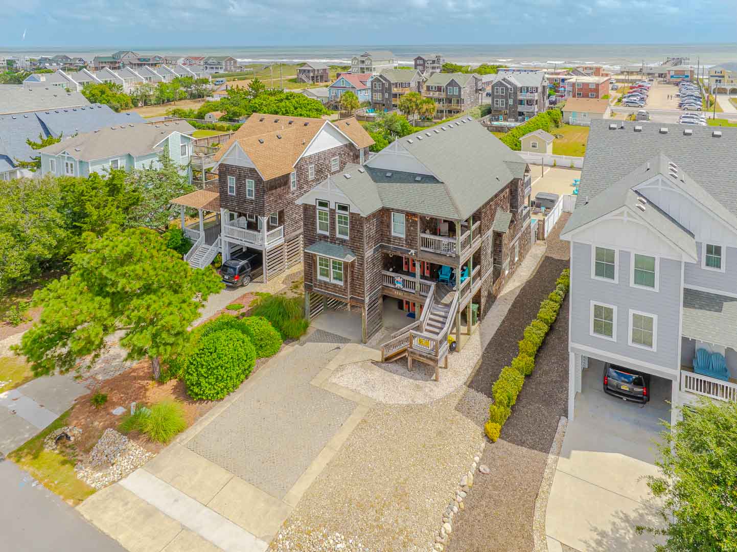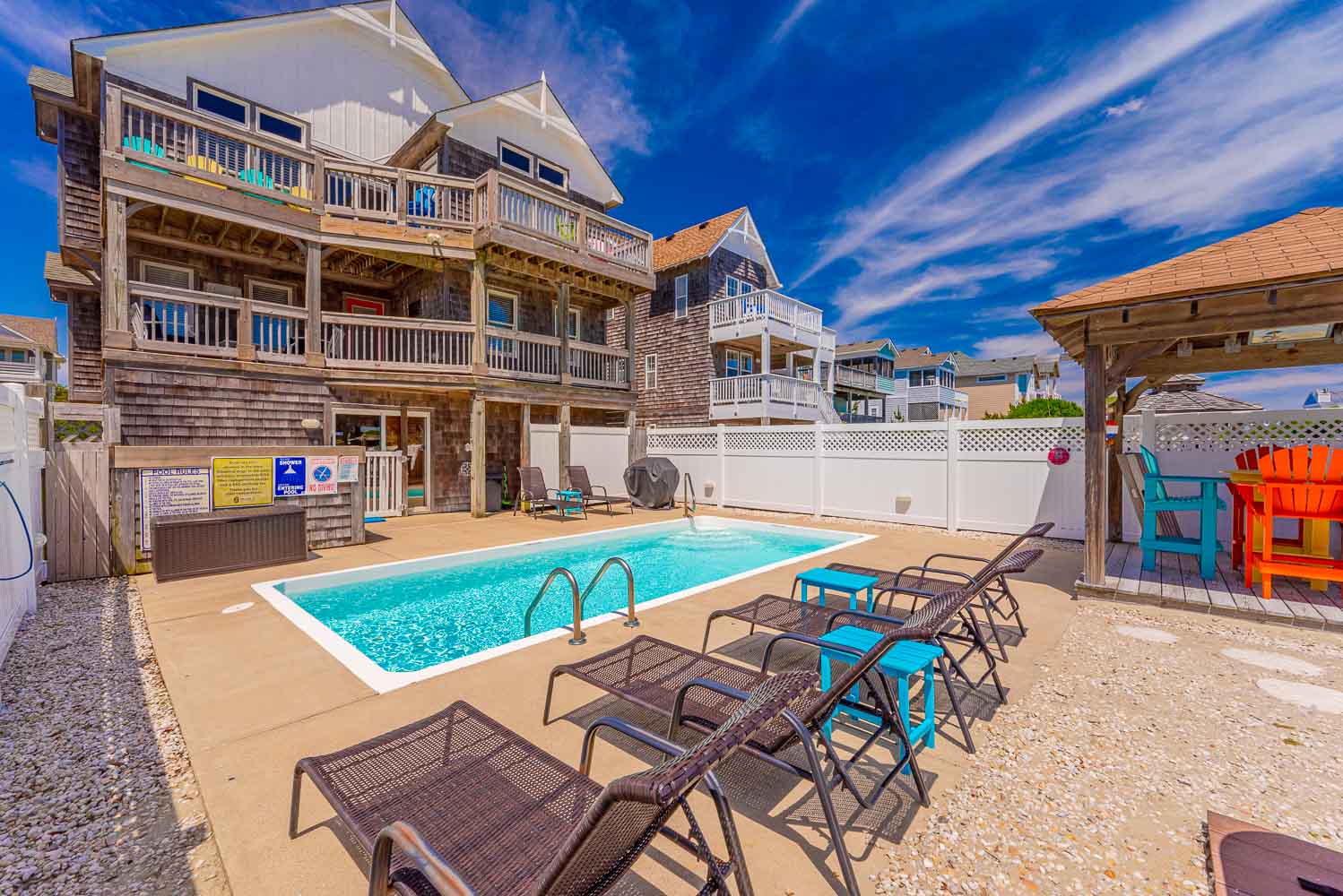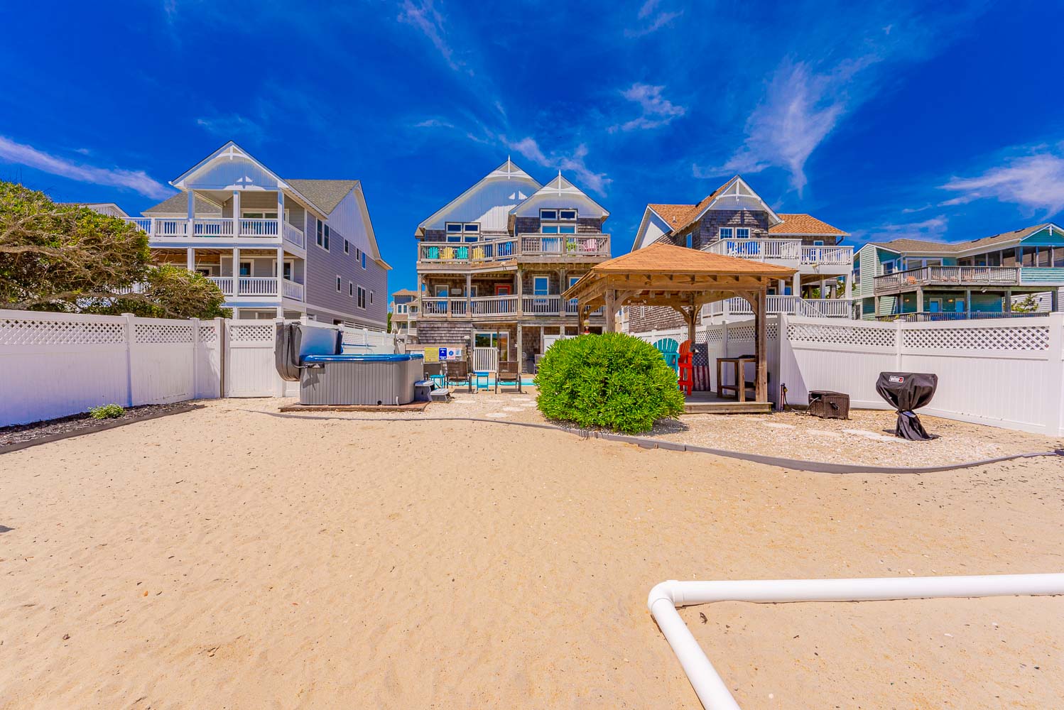 Ground Level: Parking for 7 Cars, Covered Entry, Elevator to All Levels, Large Rec. Room w/Pool Table, Foosball Table, Card Table, TV, Blu-Ray, Wet Bar w/Full Size Refrigerator, Microwave, Den/Media Room w/TV, Pullout Couch, DVD, Surround Sound, Full Hall Bath w/Shower Only, Laundry Area, and Access to the Fabulous Expansive Backyard, Enclosed Outside Shower, Private Heated Swimming Pool - Open Seasonally. (Can be Heated for $200.00 Per Week, Plus Tax. Please Bear in Mind That Pool Temperature is Subject to Outside Temperatures and Conditions), Hot Tub, Gazebo/Tiki Bar, Gas Grill, Volleyball Court, Corn Hole Boards (stored in Laundry Area), Picnic Table, and Outdoor Furnishings.
