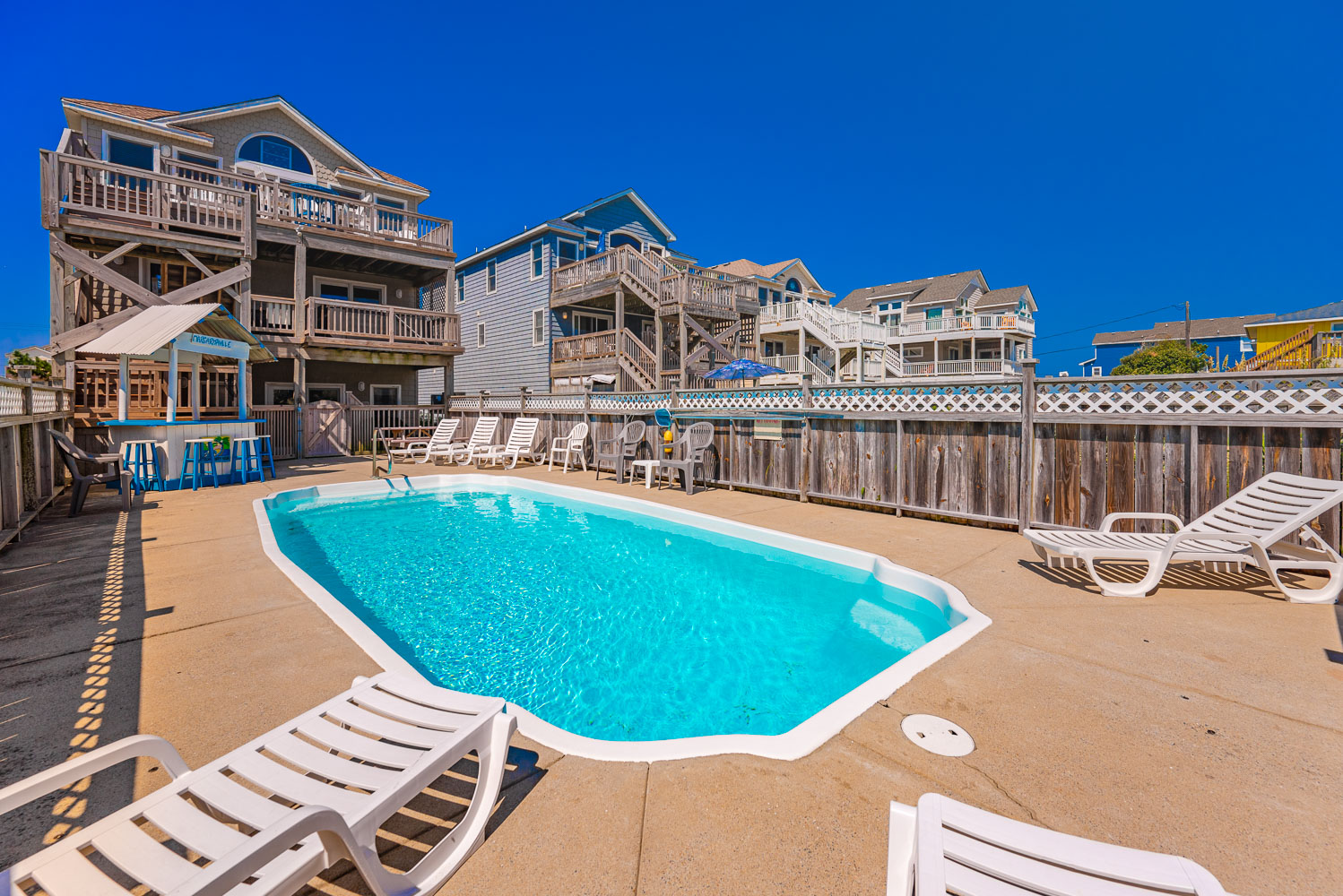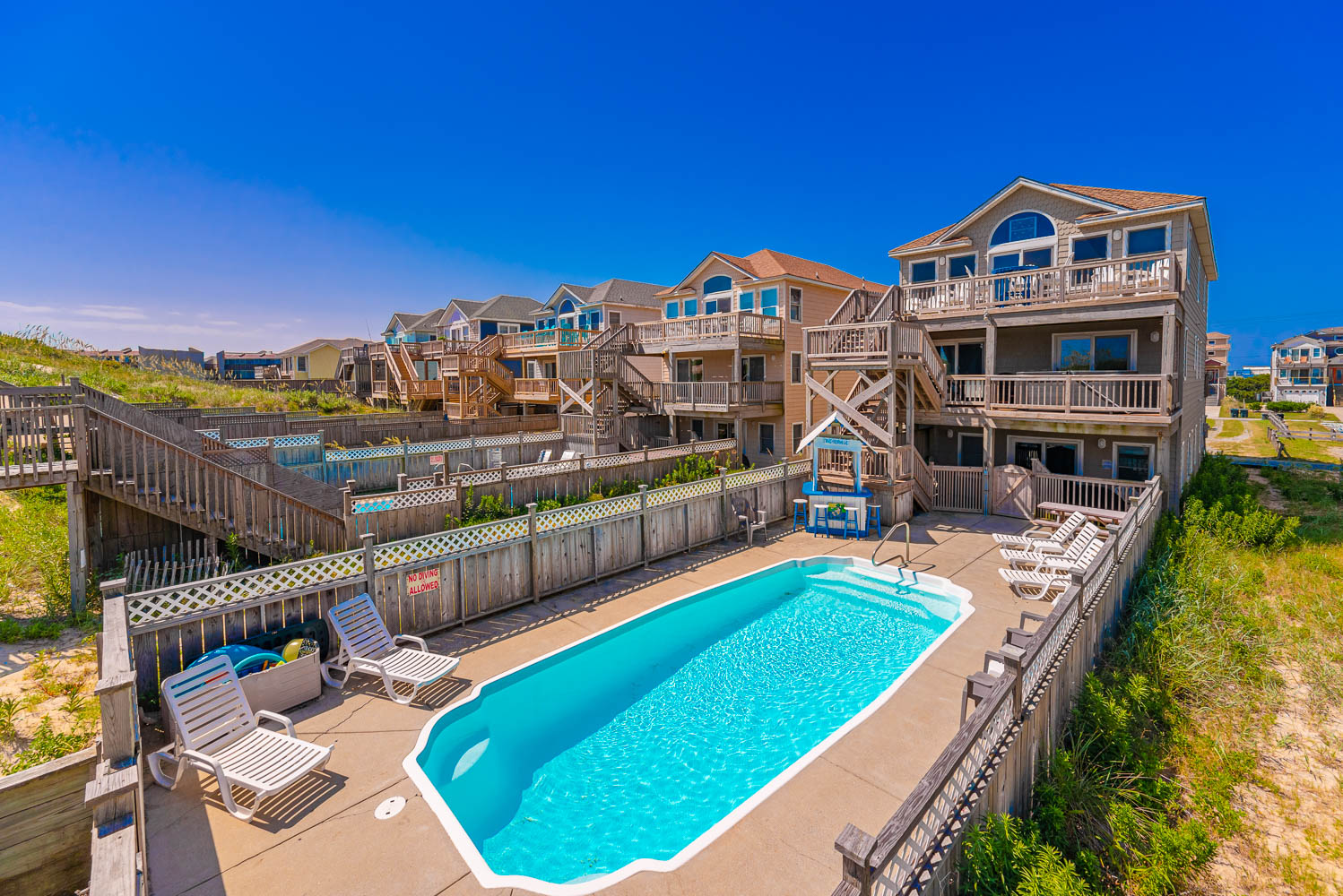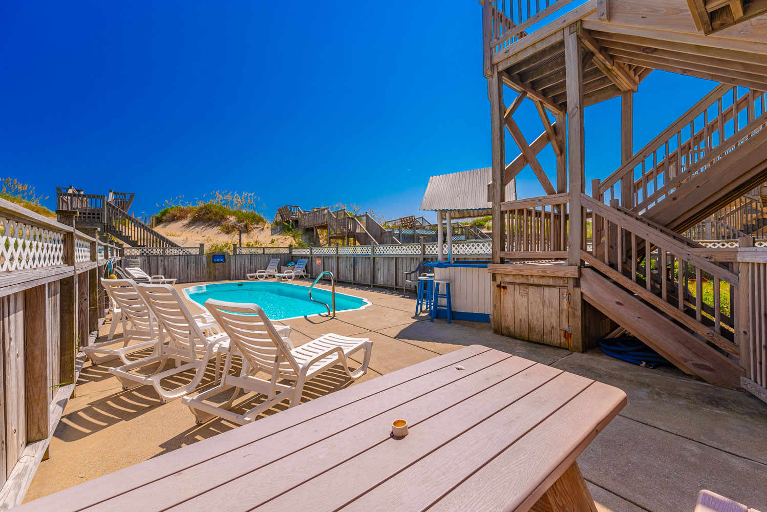 Ground Level: Parking for 8 Cars, Covered Entry, Rec. Room w/Pool Table, 50 Inch 4K Smart HDTV, Wet Bar, Refrigerator, Ice Maker, 3 Bedrooms (1 w/Queen, TV; 1 w/2 Singles, TV; 1 w//Bunk Set, TV), 2 Full Hall Baths w/Tub/Shower, Access to Patio Area, Private 14x28 Swimming Pool - Open Seasonally, Pool Furniture, 6 Lounge Chairs, Table, Chairs, Enclosed Outside Shower, Gas Grill, and Wooden Walkway to Beach w/Dune Top Deck w/Built-In Seating.
