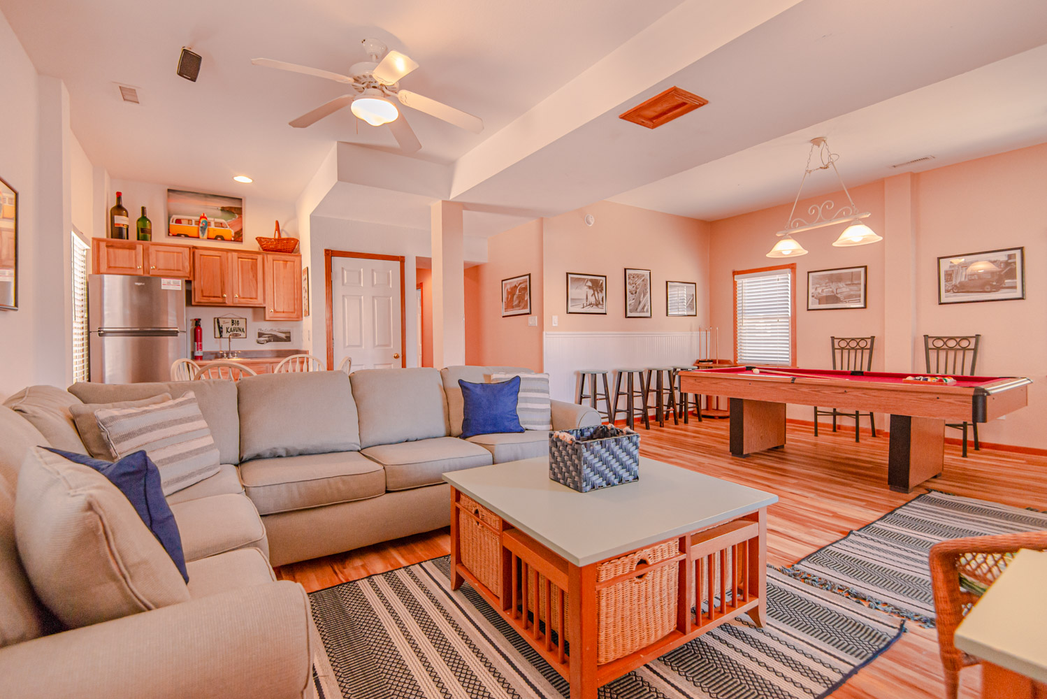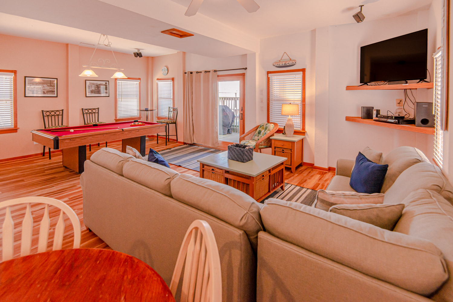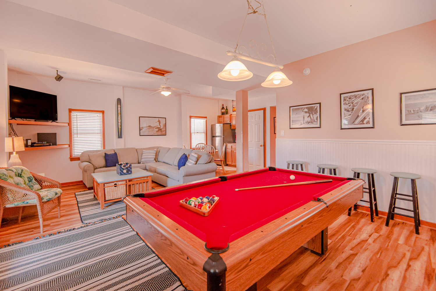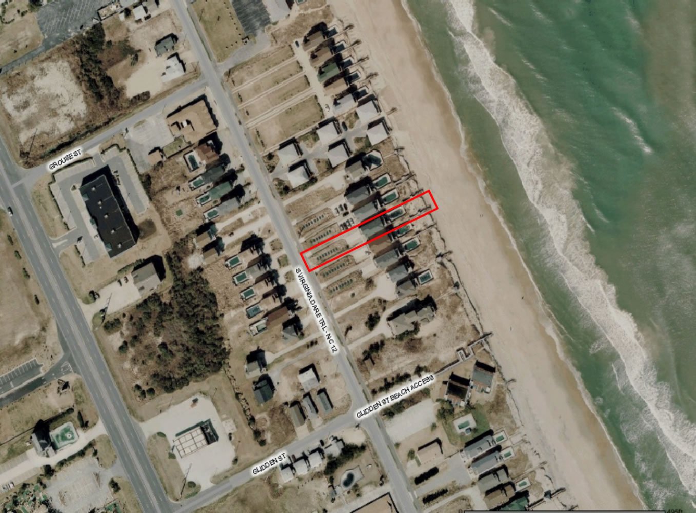 Ground Level: Parking for 8 Cars, Covered Entry, Rec. Room w/Pool Table, 50 Inch 4K Smart HDTV, Wet Bar, Refrigerator, Ice Maker, 3 Bedrooms (1 w/Queen, TV; 1 w/2 Singles, TV; 1 w//Bunk Set, TV), 2 Full Hall Baths w/Tub/Shower, Access to Patio Area, Private 14x28 Swimming Pool - Open Seasonally, Pool Furniture, 6 Lounge Chairs, Table, Chairs, Enclosed Outside Shower, Gas Grill, and Wooden Walkway to Beach w/Dune Top Deck w/Built-In Seating.