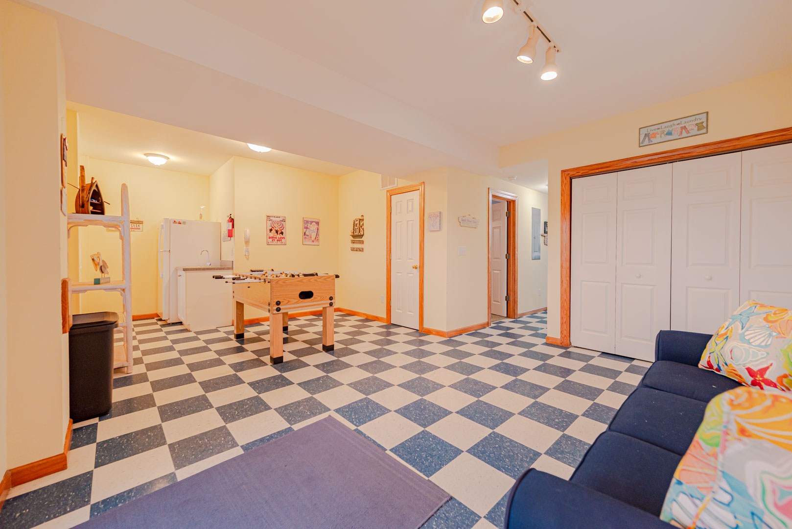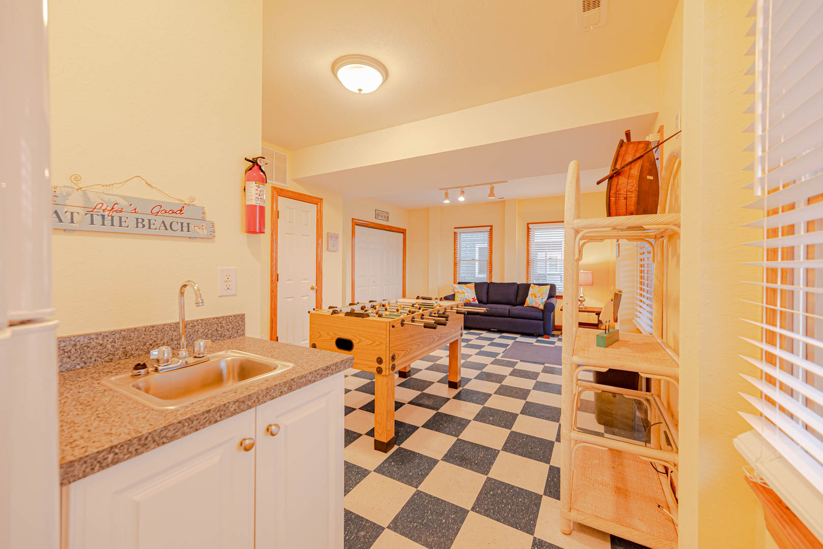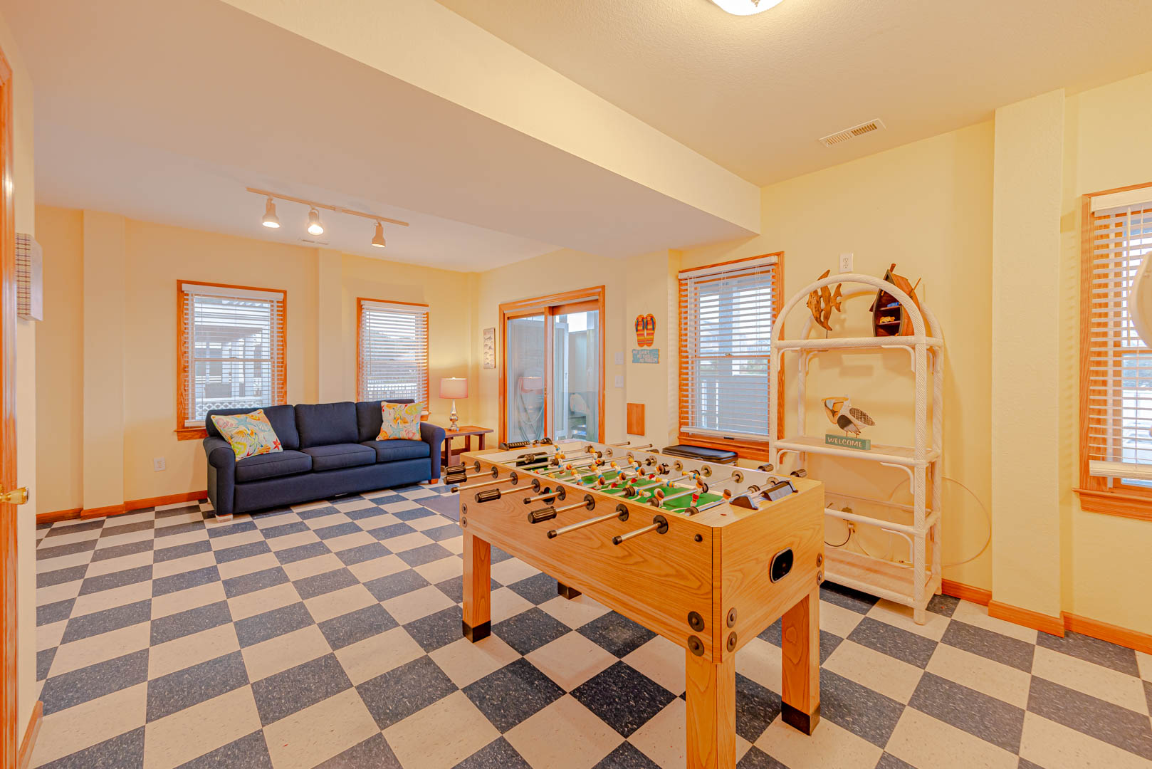 Ground Level: Parking for 4 Cars, Covered Entry, Rec. Room w/Foosball, Wet Bar w/Full Size Refrigerator, Private Suite w/2 Singles, TV, Full Bath w/Shower, Laundry Area, and Access Patio Area w/Hot Tub, Private 10x20 Swimming Pool, Charcoal Grill, and Enclosed Outside Shower.