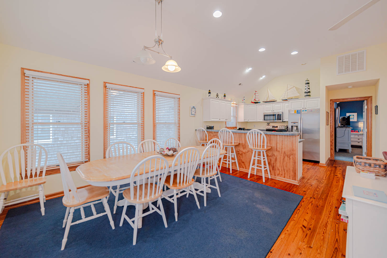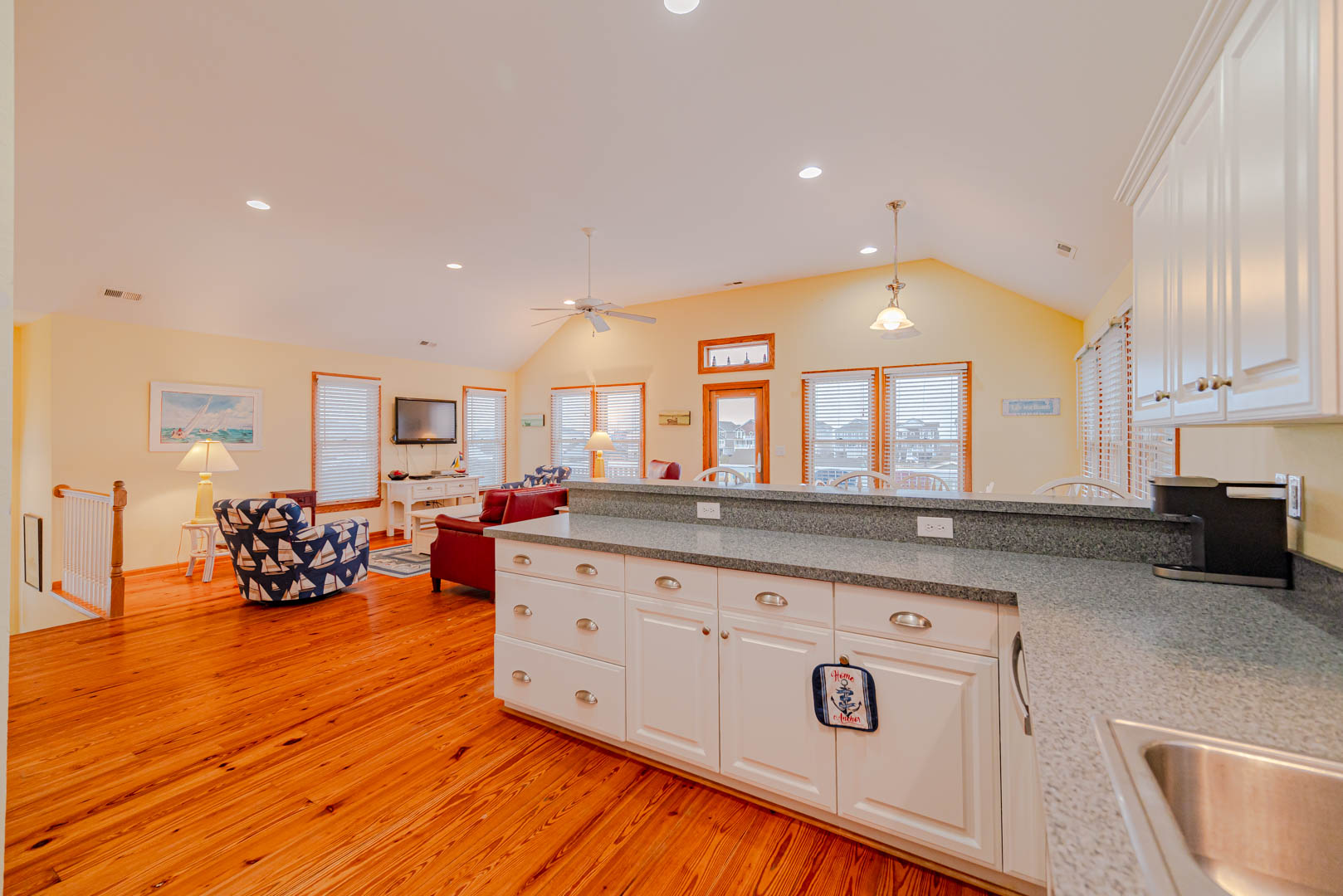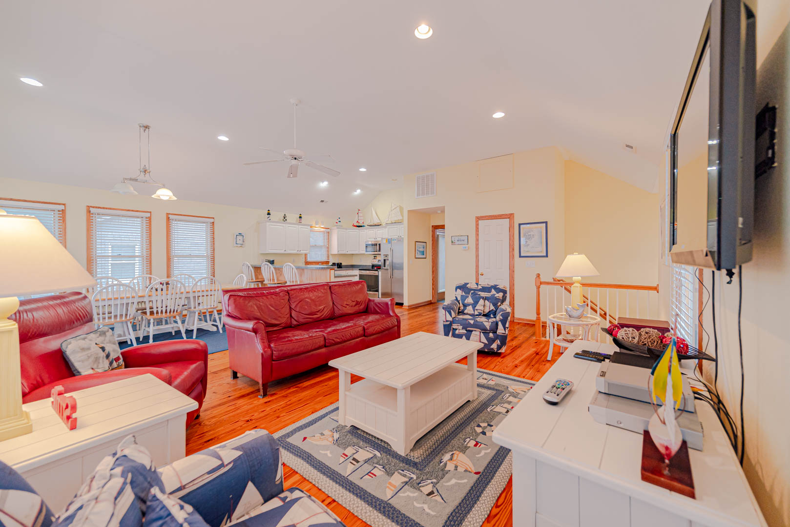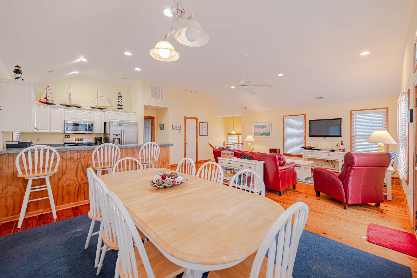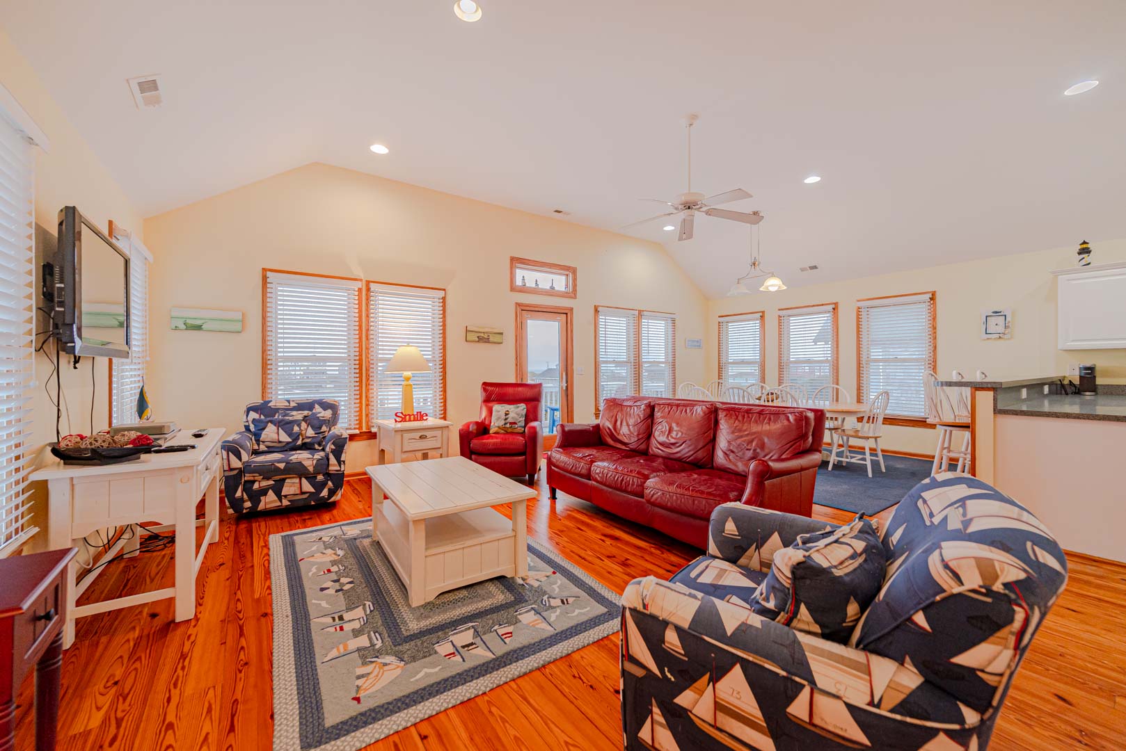 Top Level: Spacious Living Area, TV; Dining Area w/Seating for Ten (10); Fully Equipped Kitchen, Breakfast Bar; Ocean Views, Access to Sun Deck, Half Bath, and Private Suite w/King, TV, Full Bath.