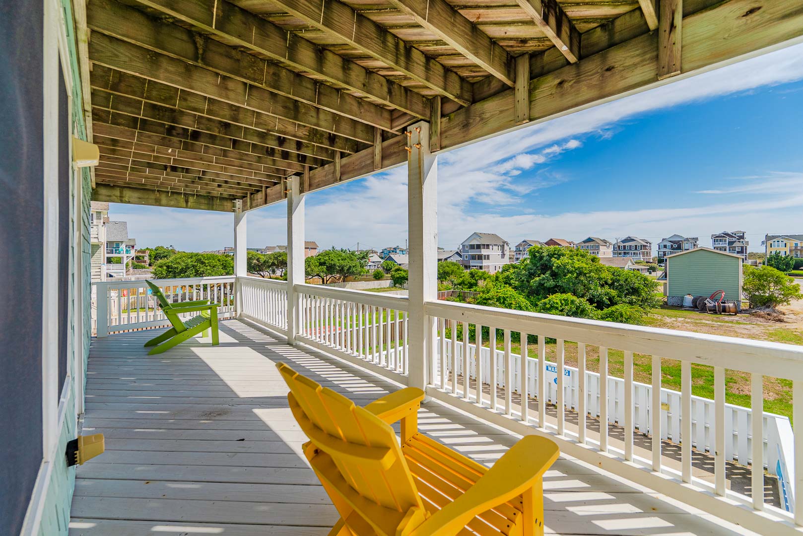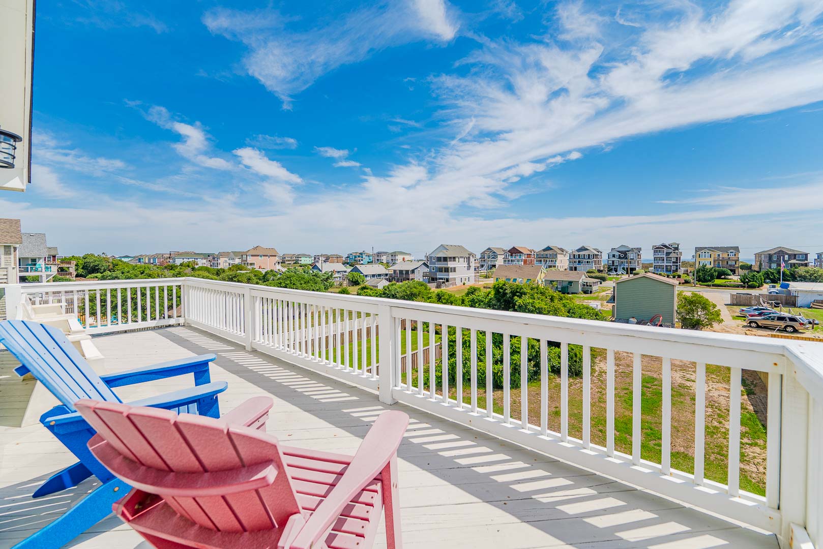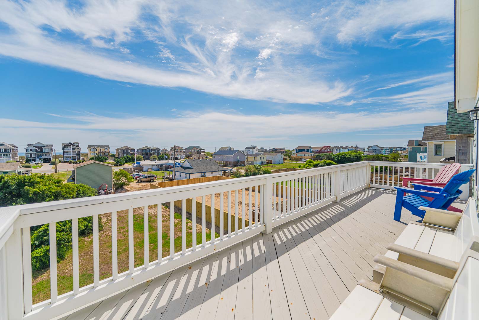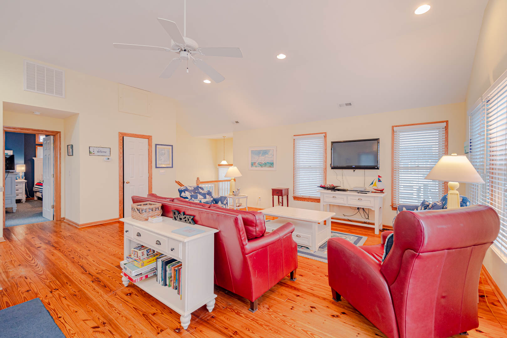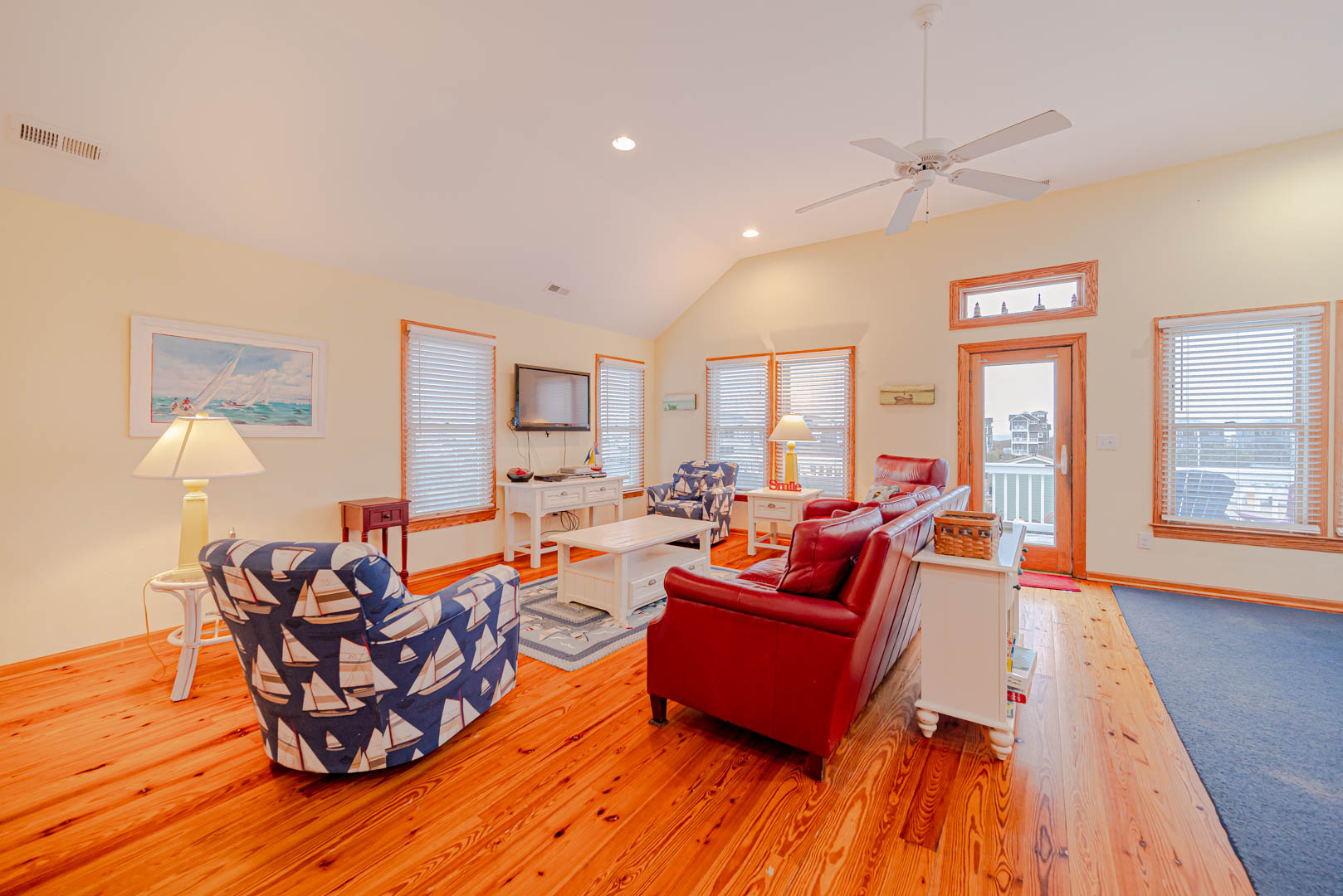 Top Level: Spacious Living Area, TV; Dining Area w/Seating for Ten (10); Fully Equipped Kitchen, Breakfast Bar; Ocean Views, Access to Sun Deck, Half Bath, and Private Suite w/King, TV, Full Bath.