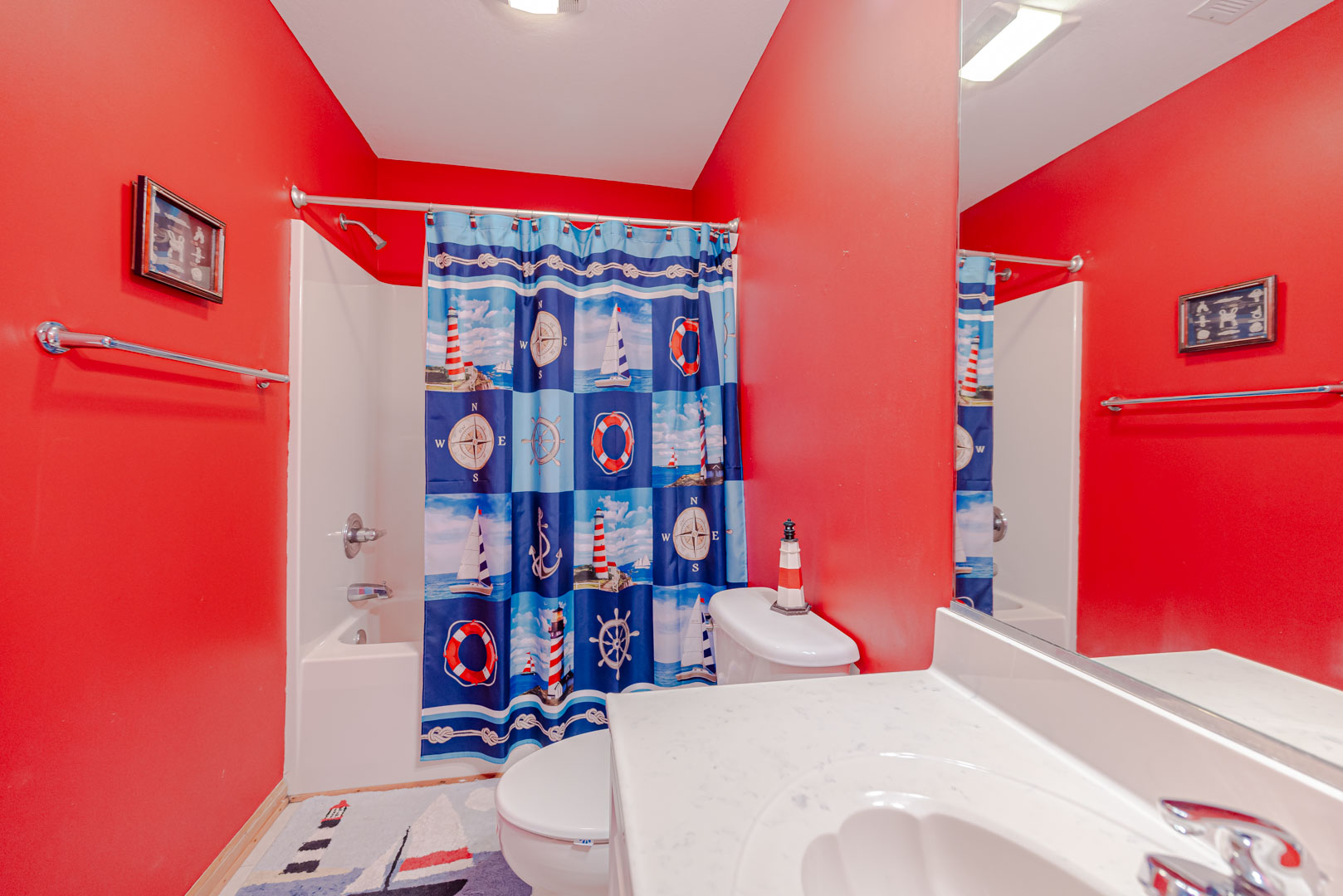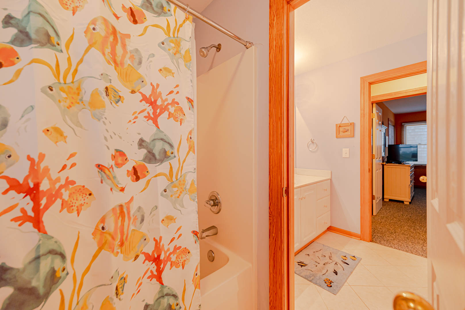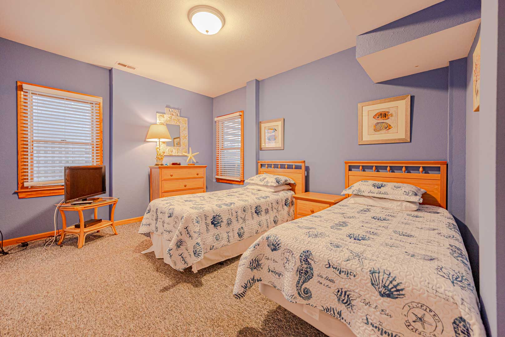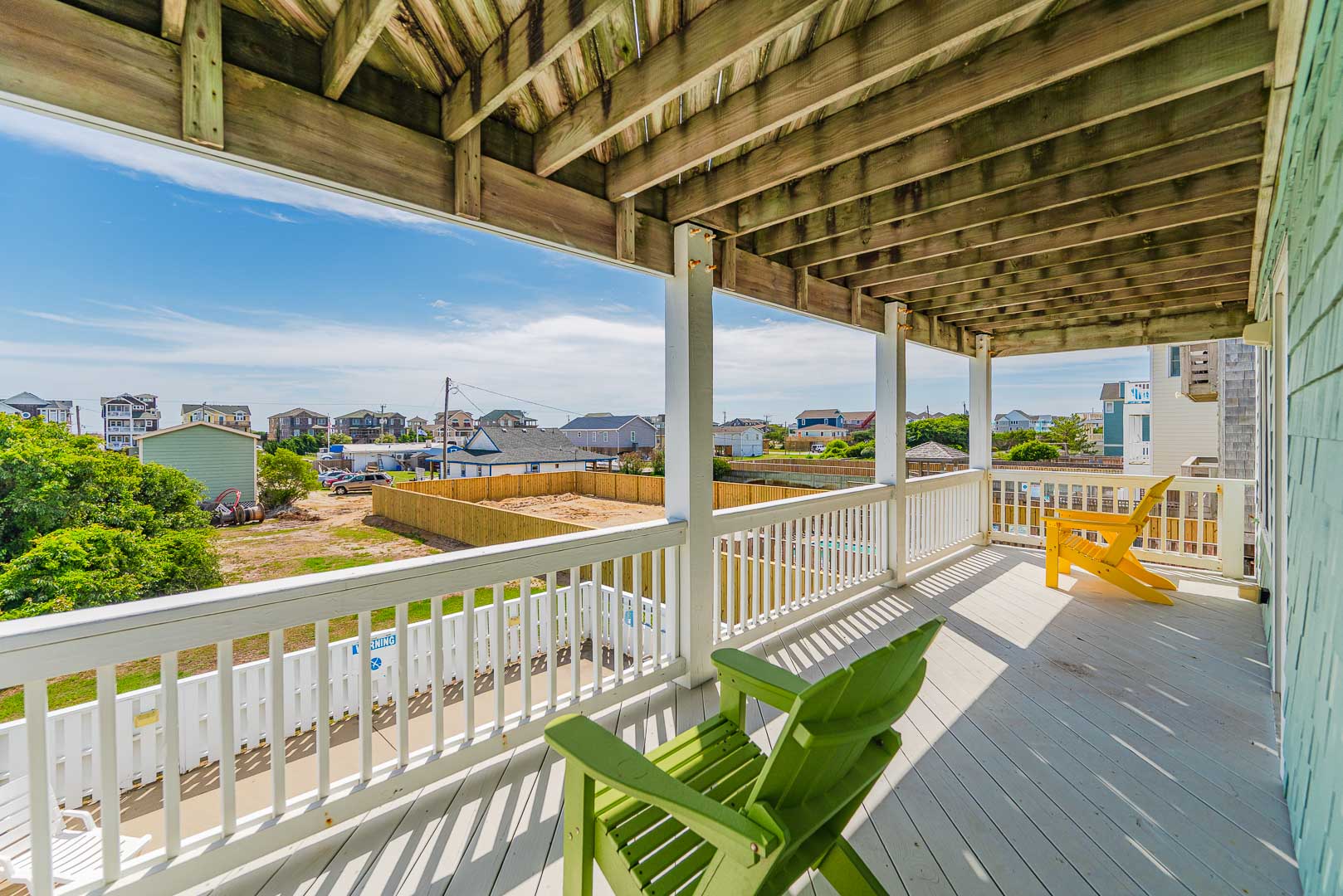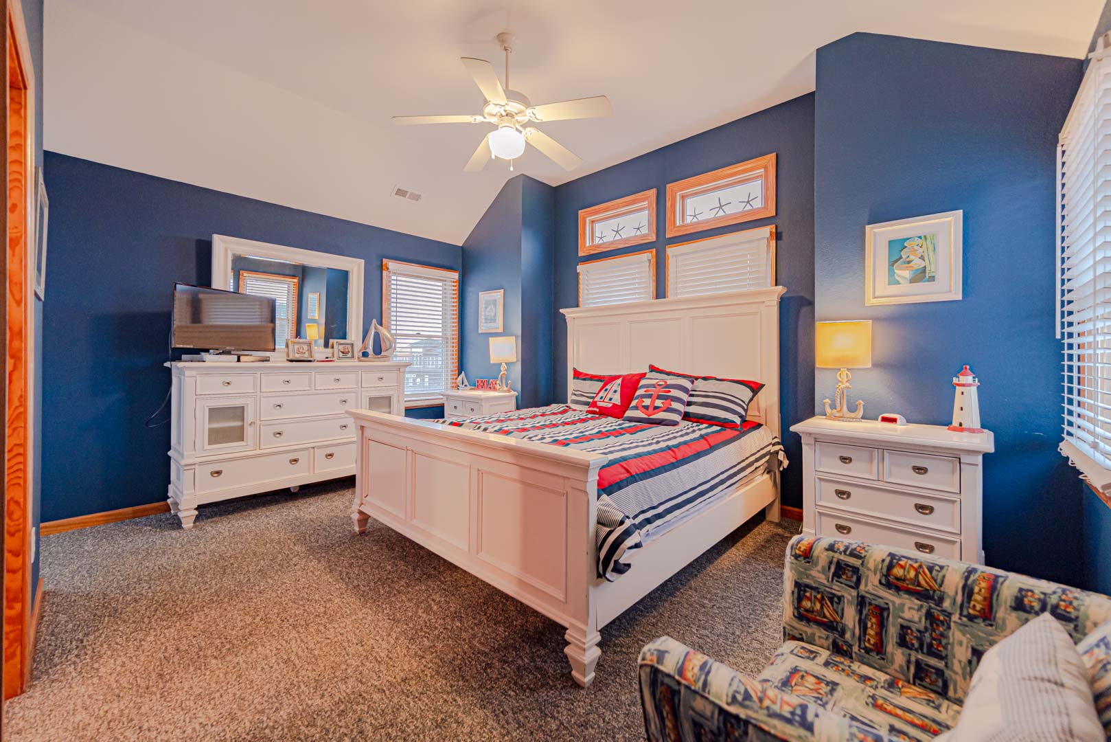 Mid Level: 3 Bedrooms (Private Suite w/King, TV, Full Bath; 1 w/Queen, TV; 1 w/Duo Bunk, TV), Full Hall Bath, and Covered Porch w/Furniture.