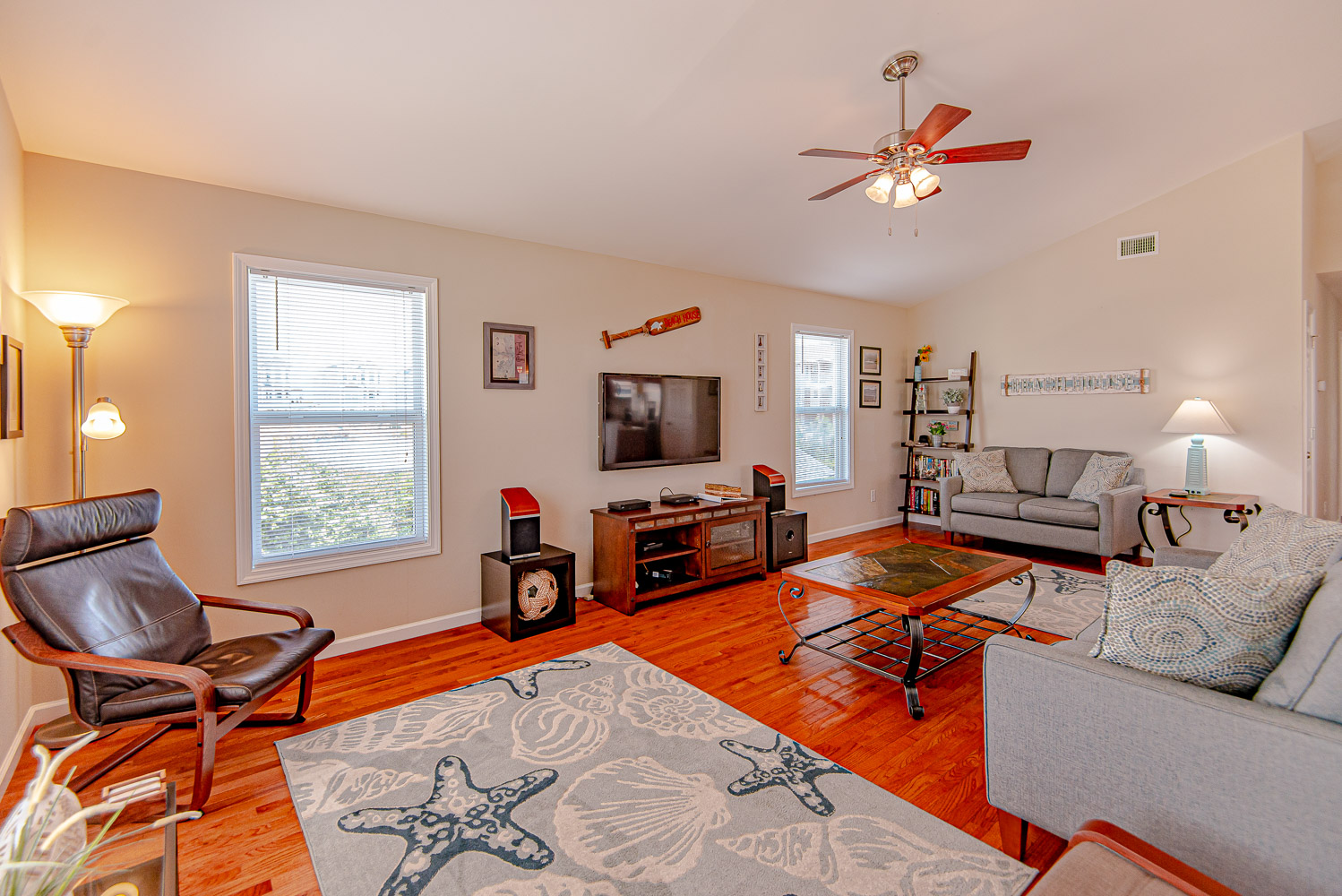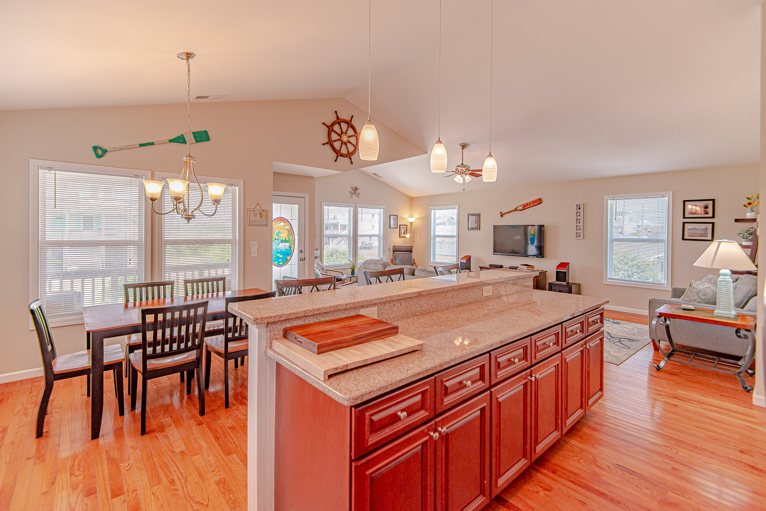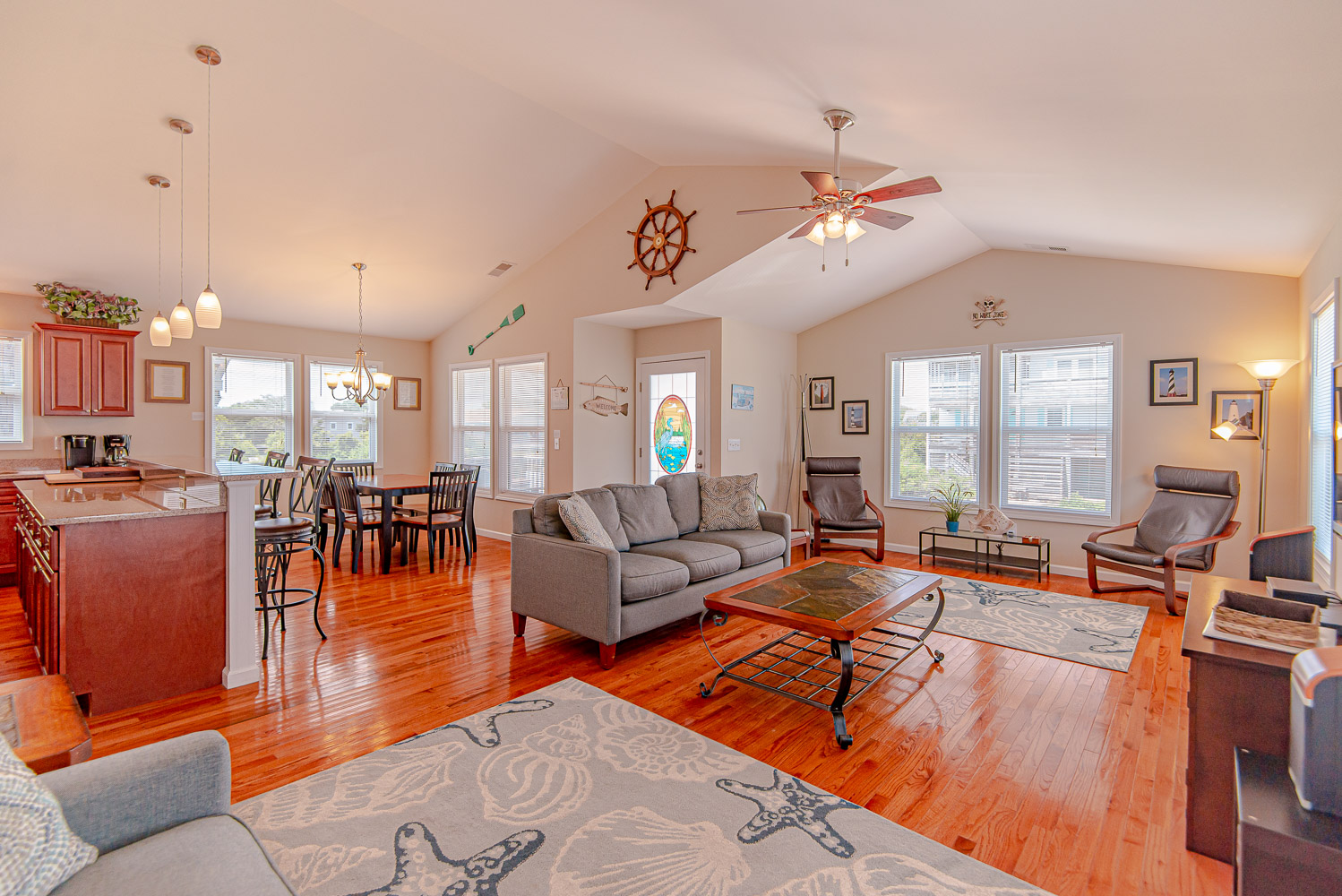 Main Level: Living Area, Hardwood Floors, Large Flat Panel TV, Dining Area, Hardwood Floors, Kitchen Area w/Stainless Appliances, Granite Counters, 3 Bedrooms (1 Private Suite w/King, TV, & Full Bath w/Tile, Granite, Shower w/6 Inch Step to Enter, 1 w/Queen & TV, 1 w/Duo Bunk, TV), Full Tile & Grantie Hall Bath Tub/Shower, & Covered Deck w/Deck Furniture.