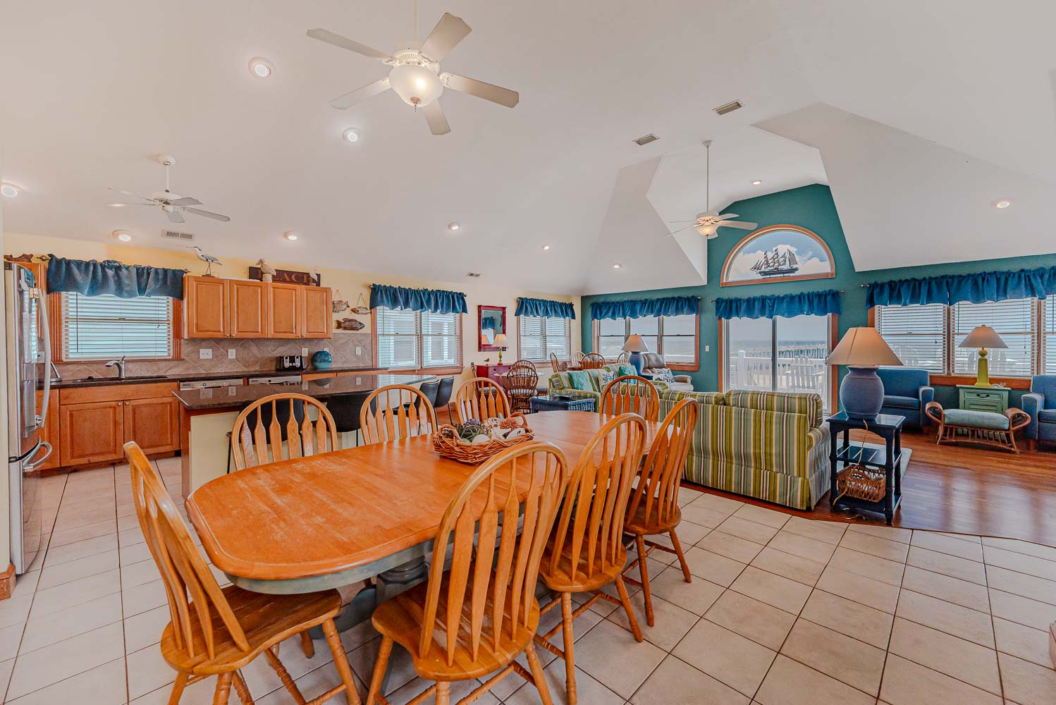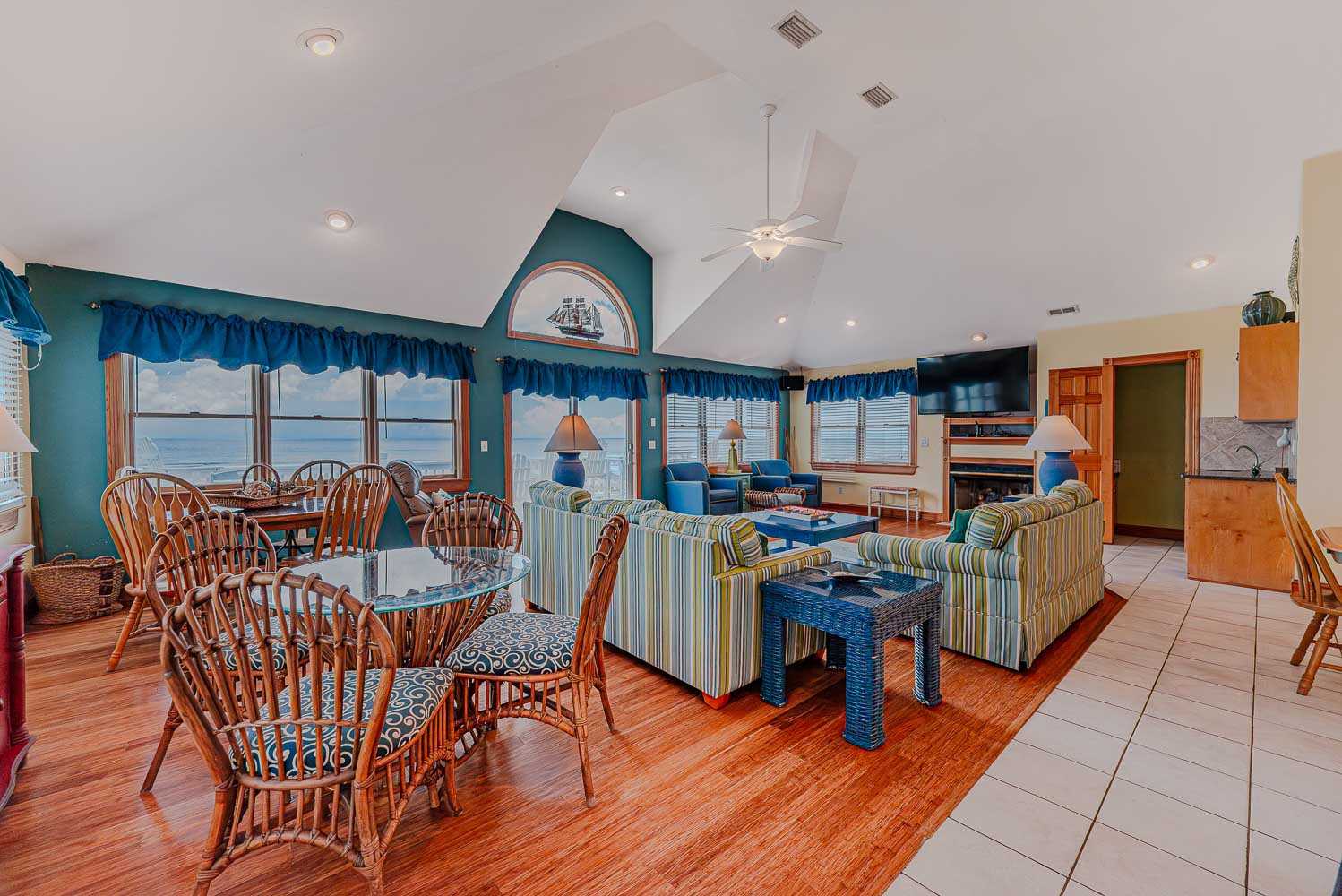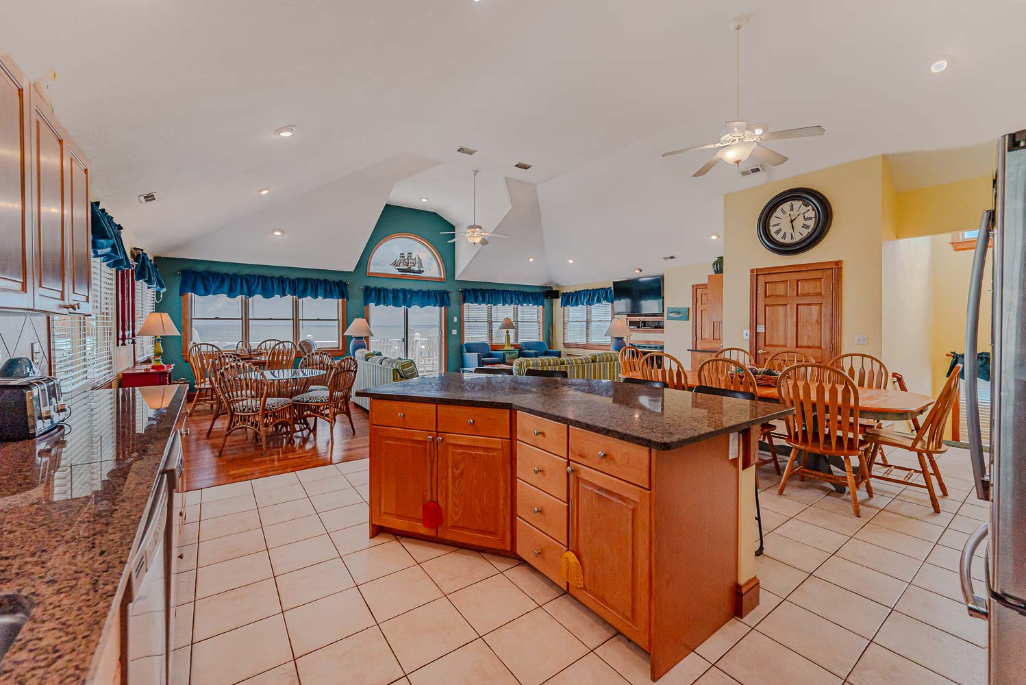 Top Level: Spacious Living Area, Large TV, Gas Fireplace, Fantastic Ocean Views, Access to Oceanfront Sun Deck w/Deck Furniture, Fully Equipped Kitchen w/Stainless Steel Appliances, Island Bar Seating for Four (4), Dining Area w/Seating for Twelve (12), 2 Breakfast Tables w/Seating for Four (4); Half Bath; Private Suite w/King, TV, and Full Bath w/Tiled Walk-In Shower.
