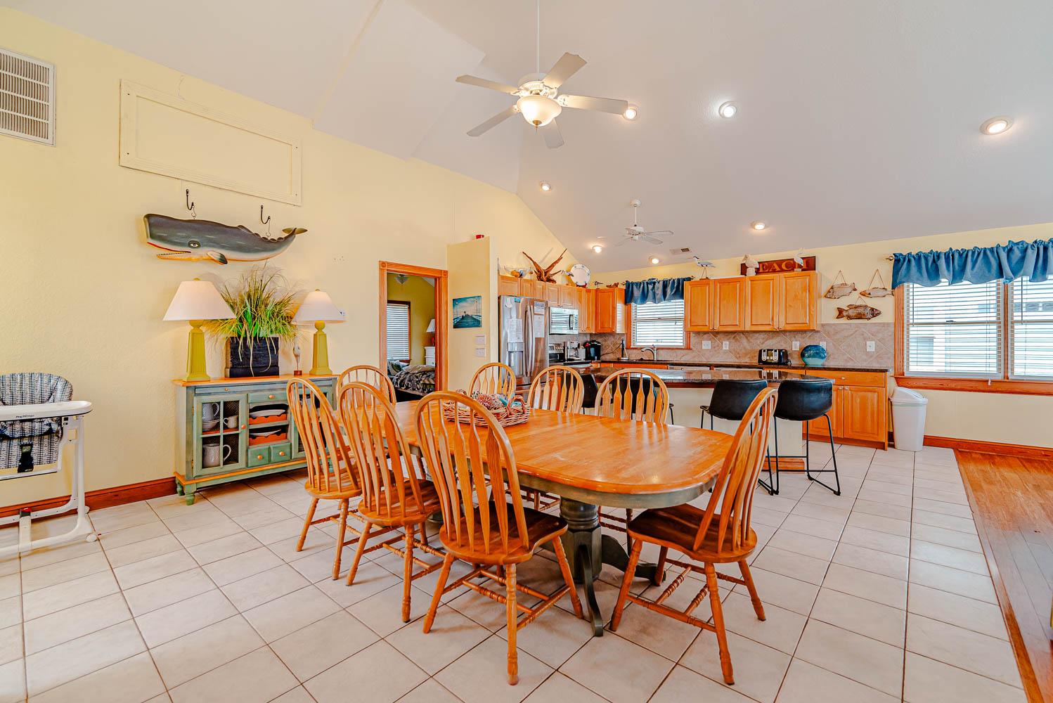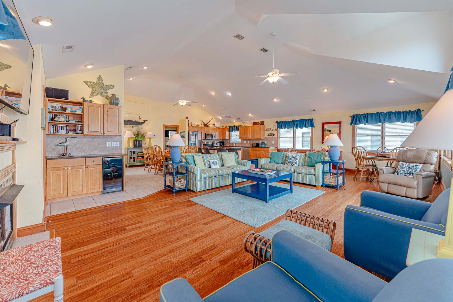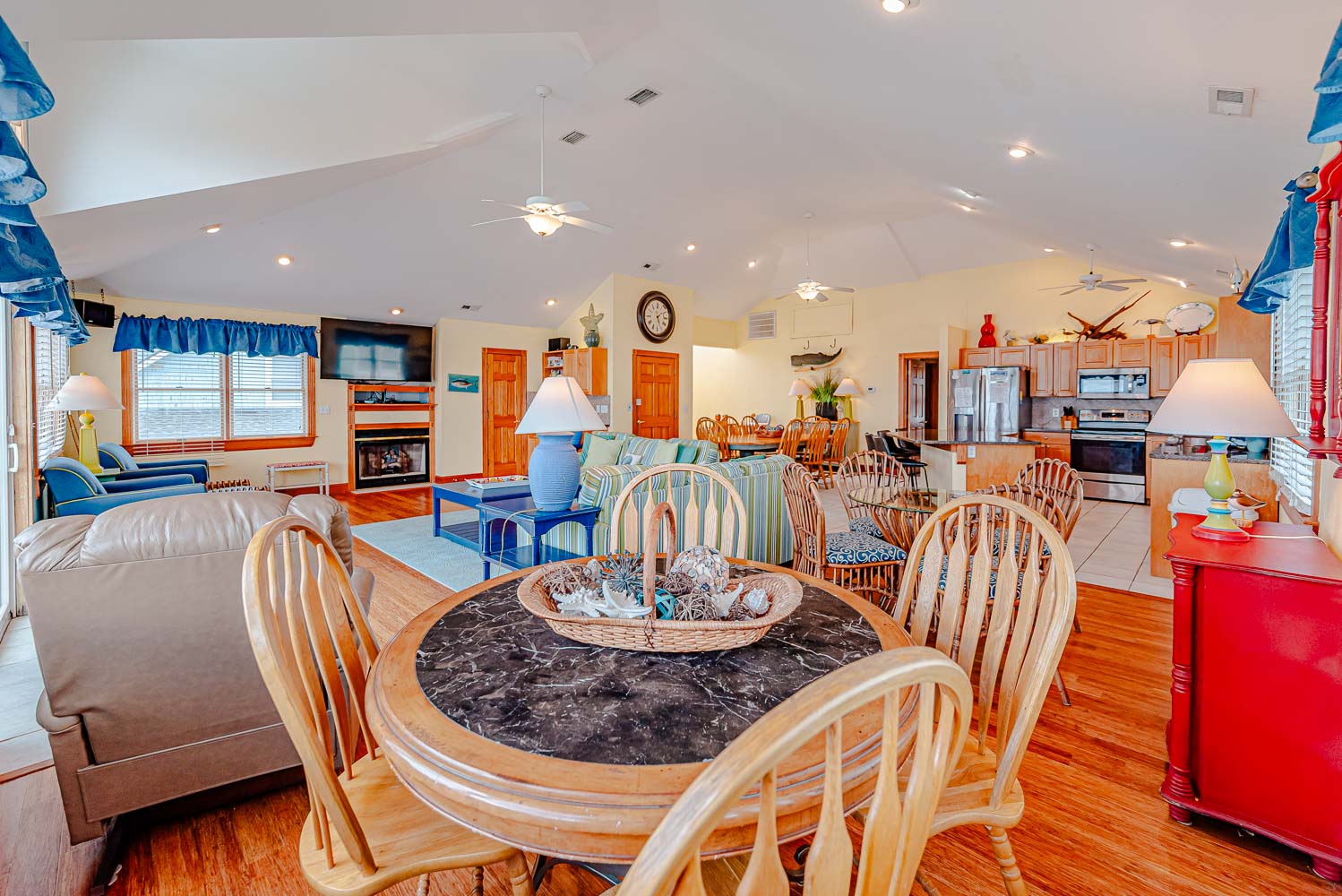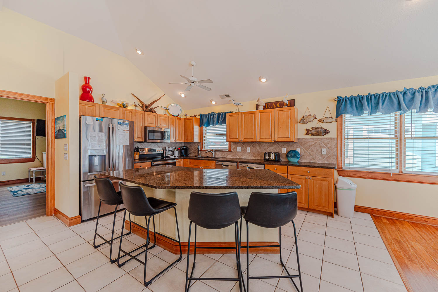 Top Level: Spacious Living Area, Large TV, Gas Fireplace, Fantastic Ocean Views, Access to Oceanfront Sun Deck w/Deck Furniture, Fully Equipped Kitchen w/Stainless Steel Appliances, Island Bar Seating for Four (4), Dining Area w/Seating for Twelve (12), 2 Breakfast Tables w/Seating for Four (4); Half Bath; Private Suite w/King, TV, and Full Bath w/Tiled Walk-In Shower.