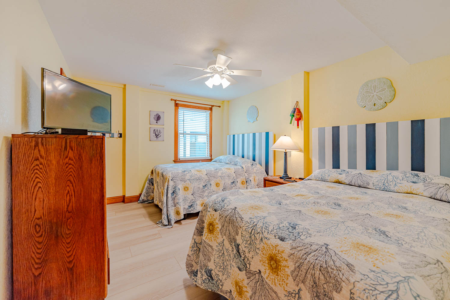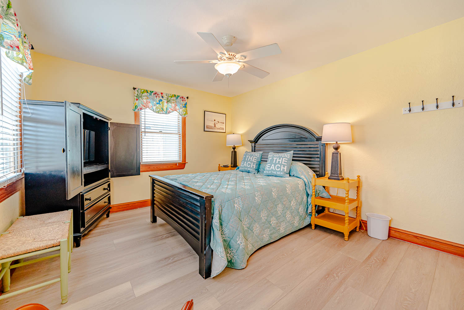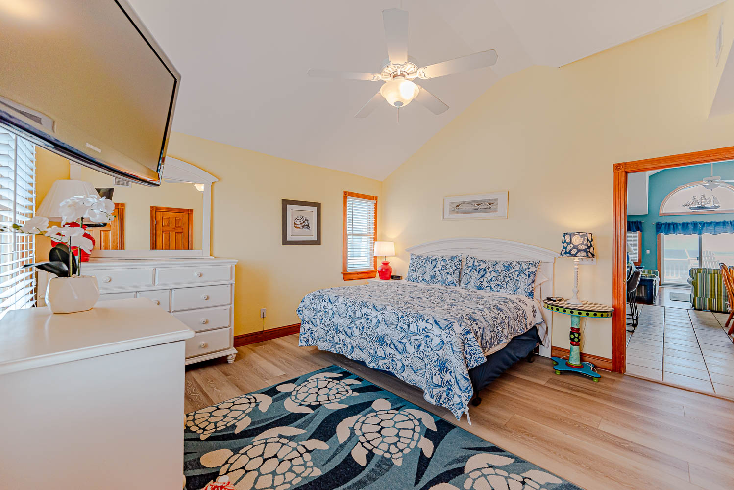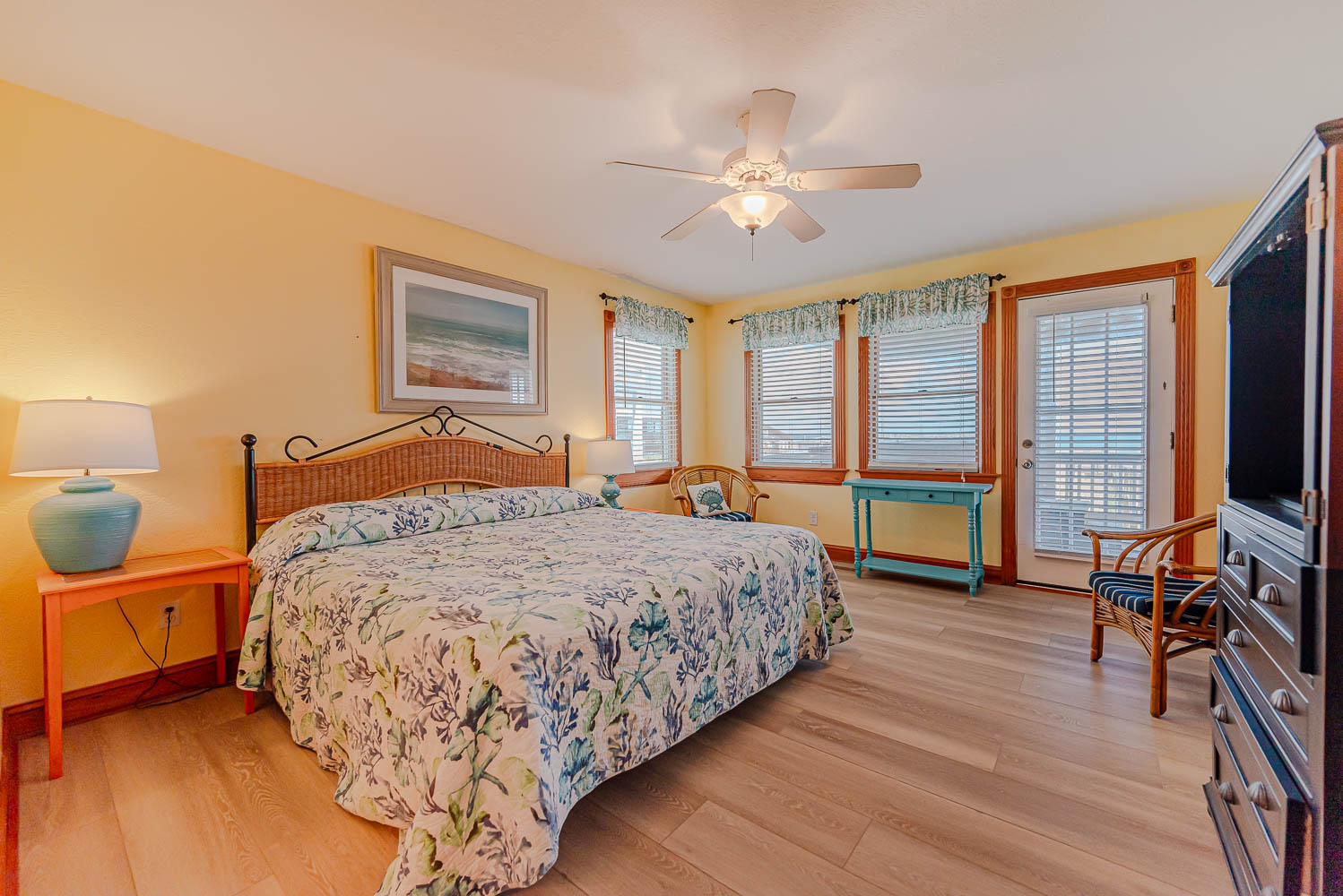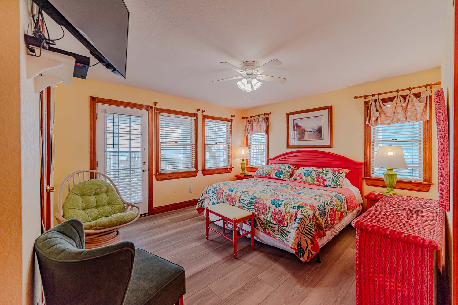 Mid Level: 4 Bedrooms (Private Suite w/King, TV, Full Bath w/Tub/Shower; Private Suite w/King, TV, Full Bath w/Tiled Walk-In Shower; 1 w/King, TV; 1 w/Queen, TV), Full Hall Bath w/Shower, Access to Wrap Around Covered Deck w/Hot Tub, Deck Furniture, Ocean Views, Steps to Ground Level, & Steps to Top Level.