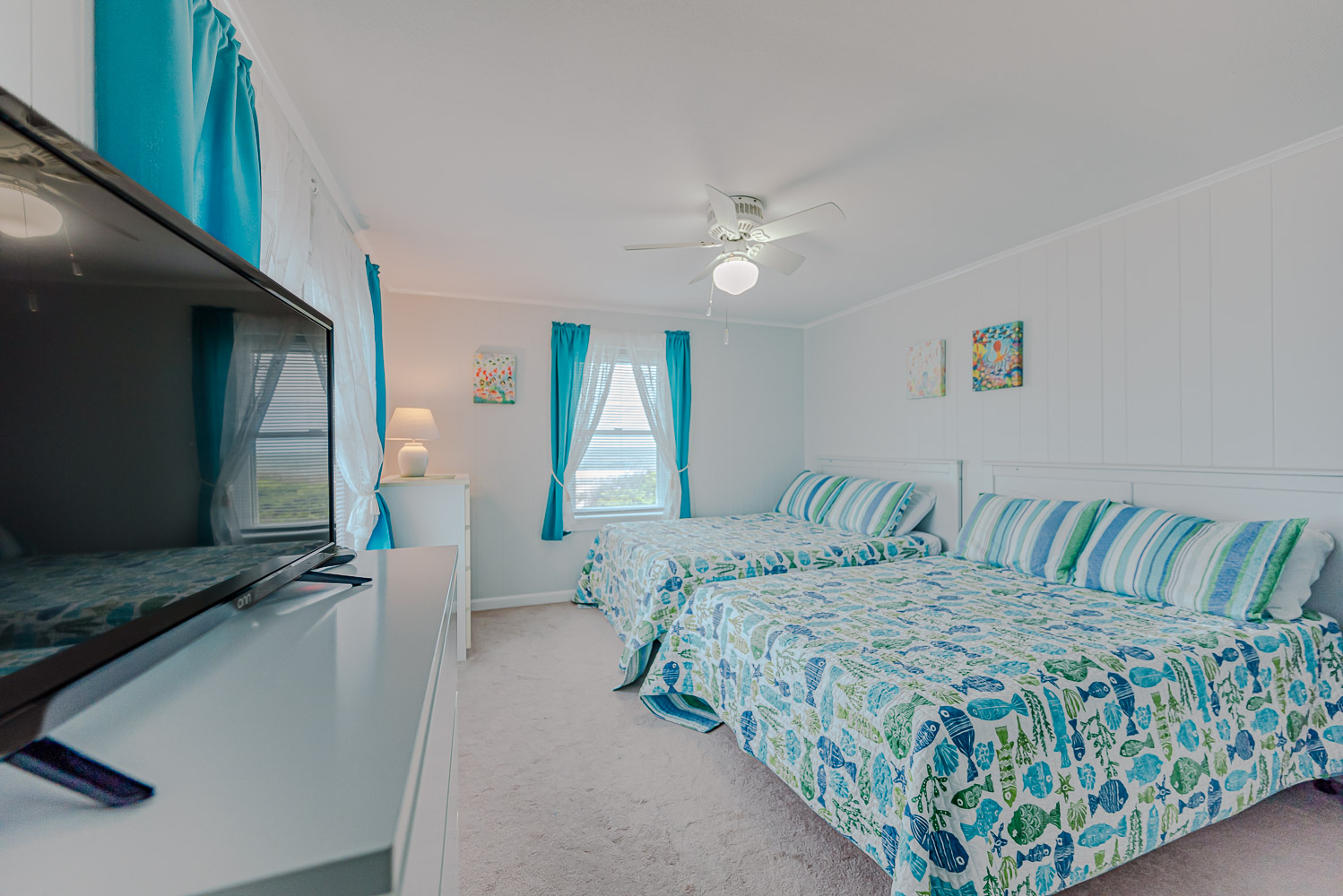 Top Level: Full Bath w/Tub/Shower, Ceramic Tile on Walls/Floor, Hall Closet (Iron and board), 2 Bedrooms (1 w/Queen, TV, Access to Balcony/Sun Deck, Two Dressers, TV, Large Closet; 1 w/2 Doubles, Overlooks Pool Area, 2 Dressers, TV, Large Closet.