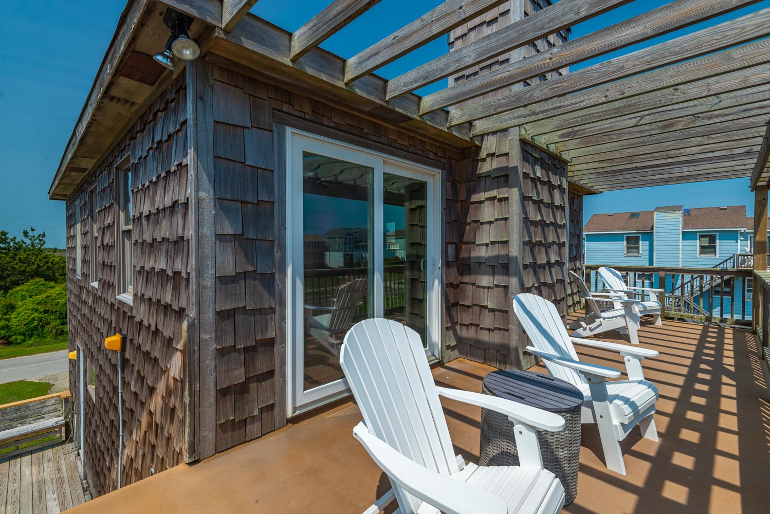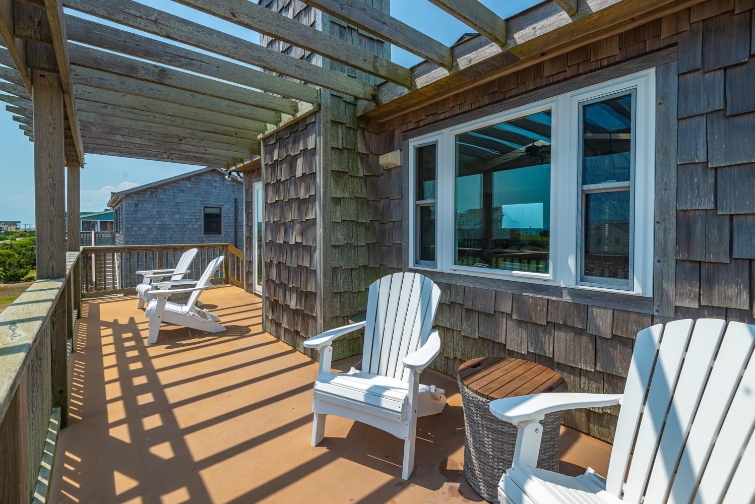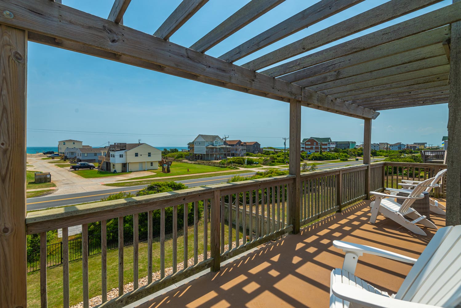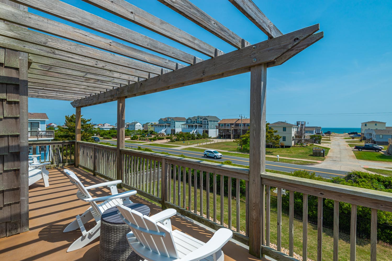 Top Level: Living Area, TV; Ocean Facing Pergola Covered Deck, Deck Furniture, Picnic Table, Ocean and Sound Views; Full Hall Bath w/Shower; Kitchen Area, Bar Seating for Four (4); and Dining Area w/Seating for Eight (8).