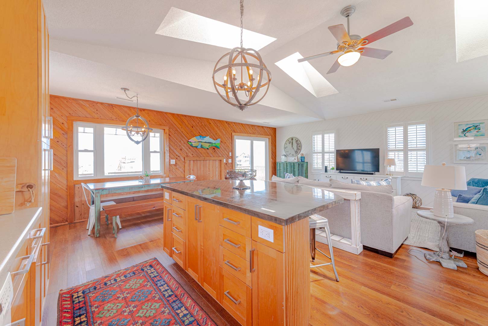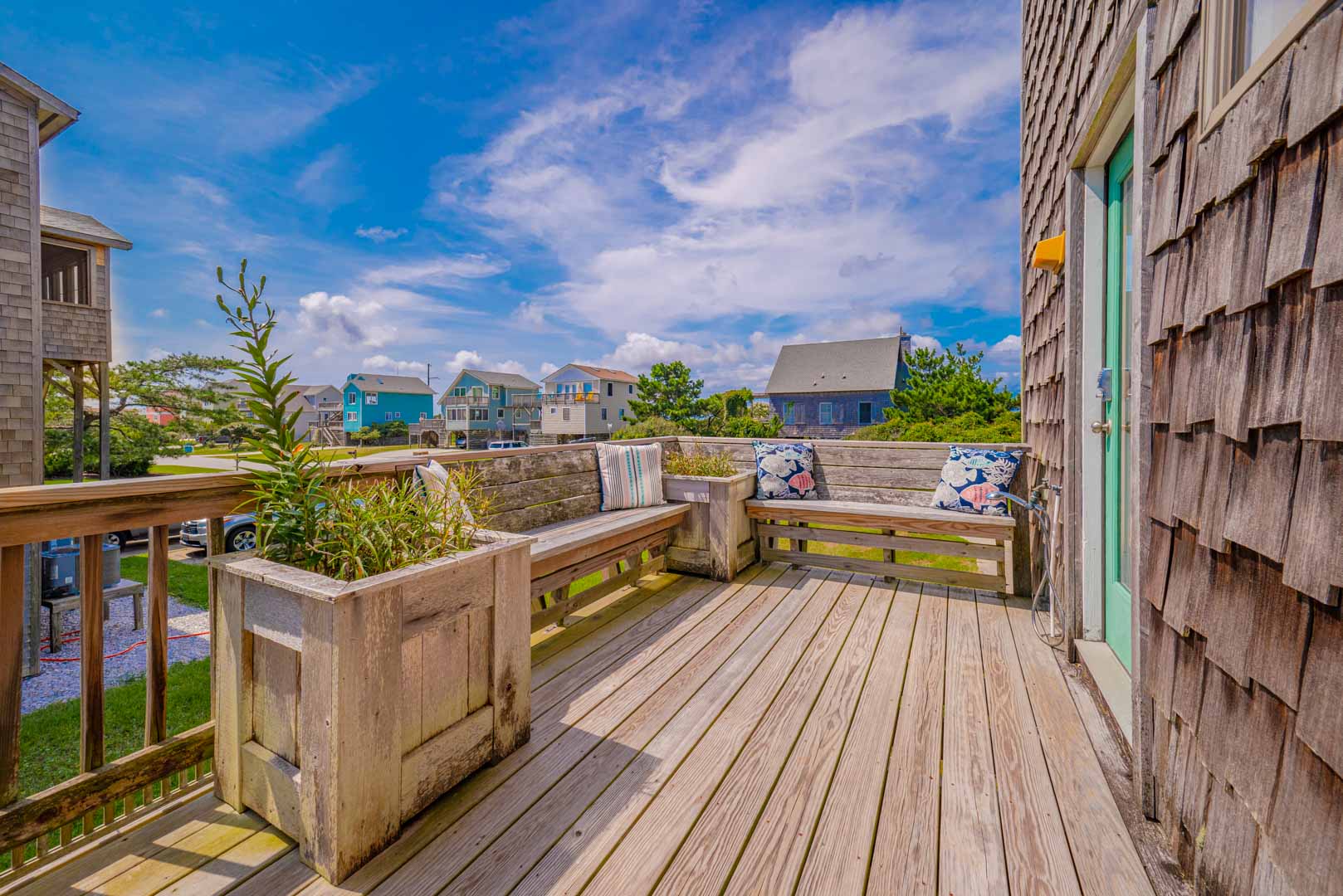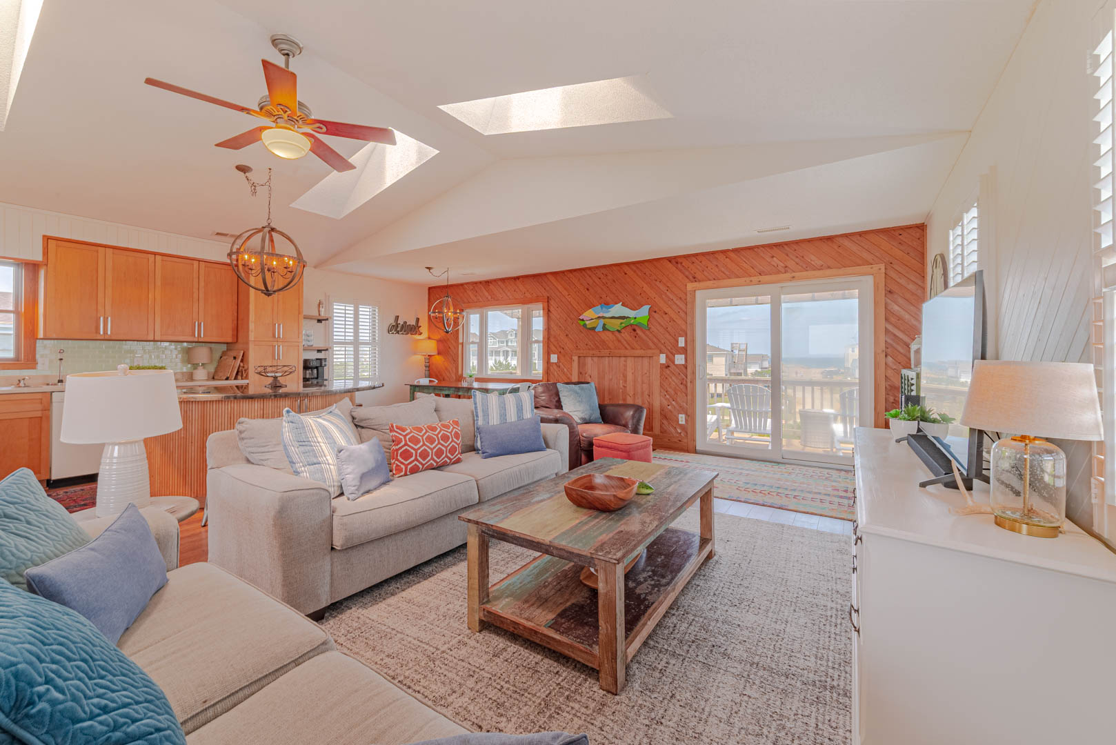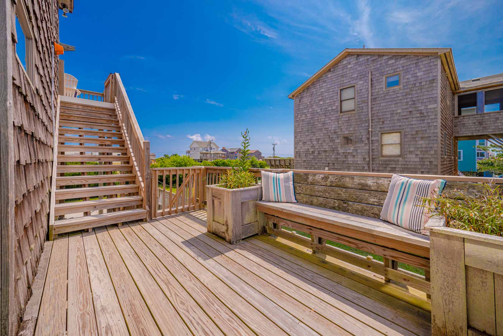 Top Level: Living Area, TV; Ocean Facing Pergola Covered Deck, Deck Furniture, Picnic Table, Ocean and Sound Views; Full Hall Bath w/Shower; Kitchen Area, Bar Seating for Four (4); and Dining Area w/Seating for Eight (8).