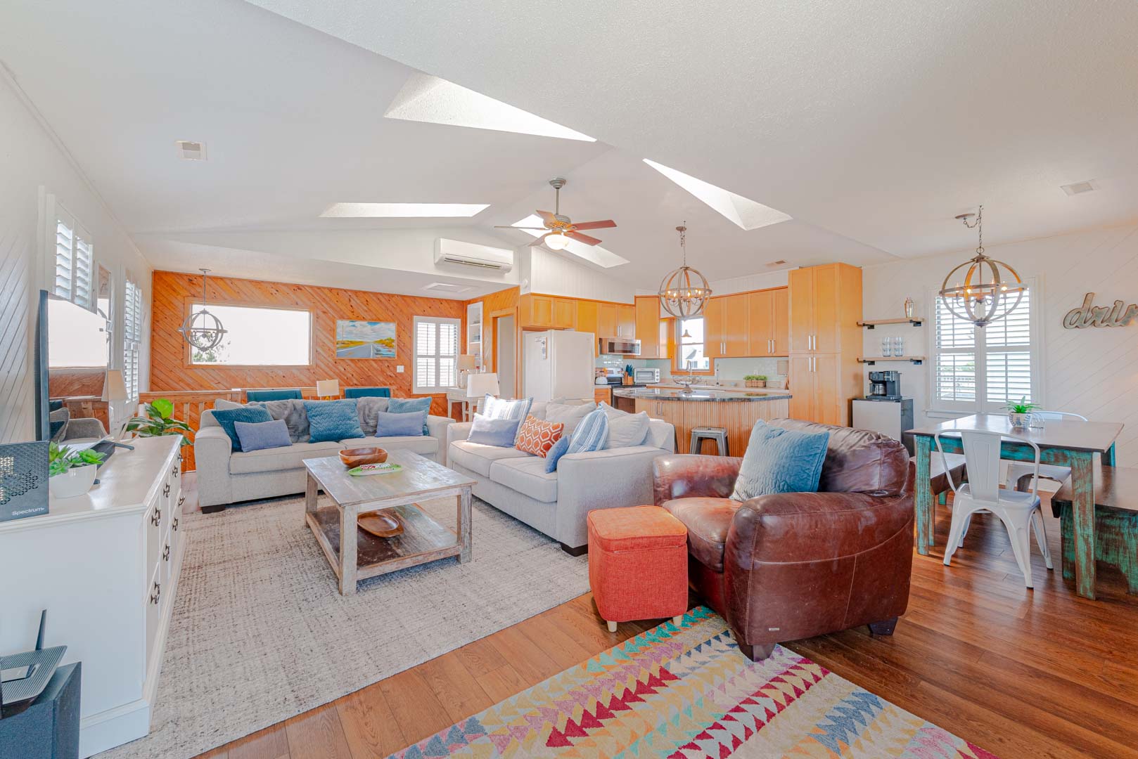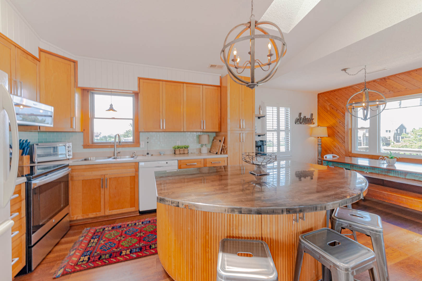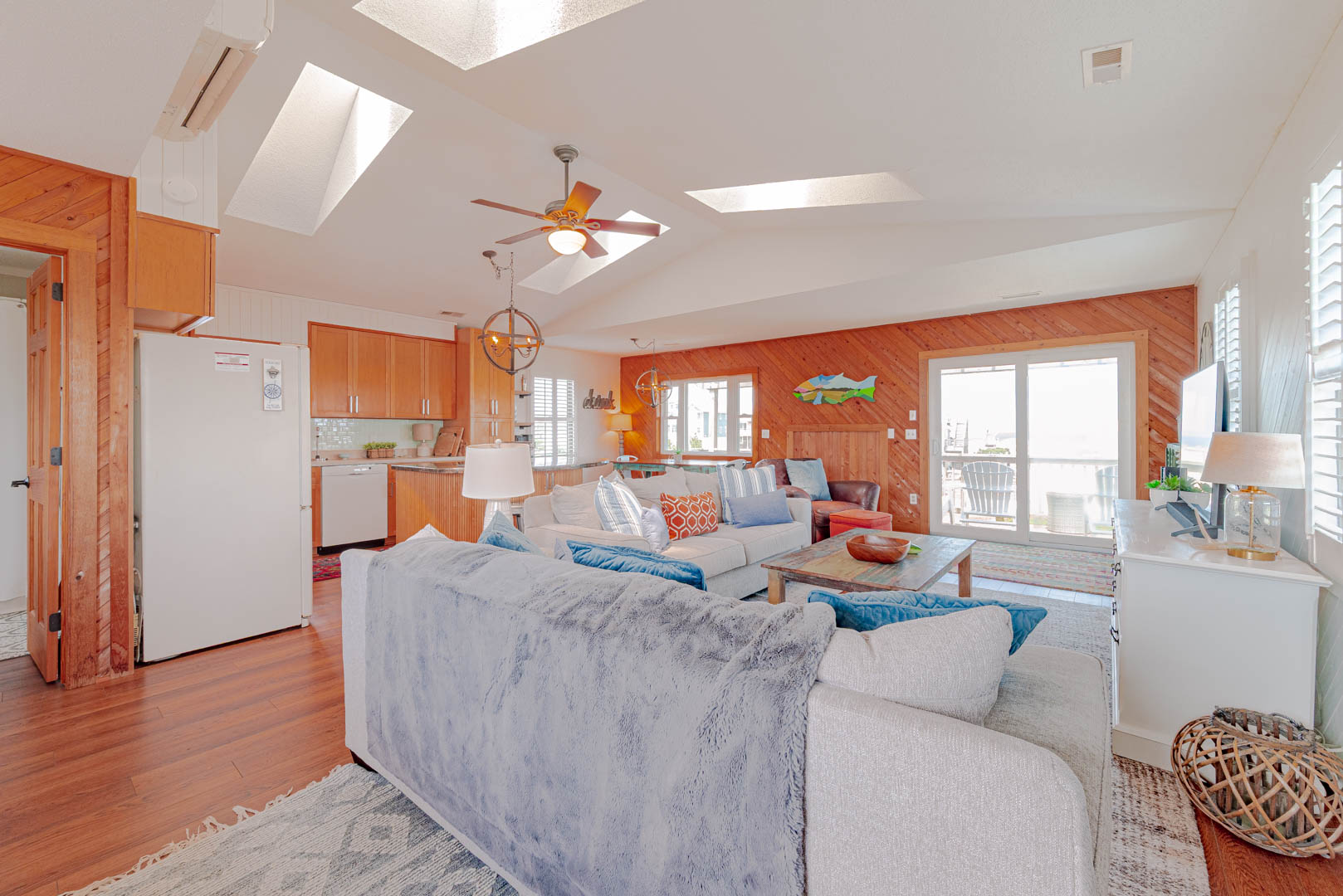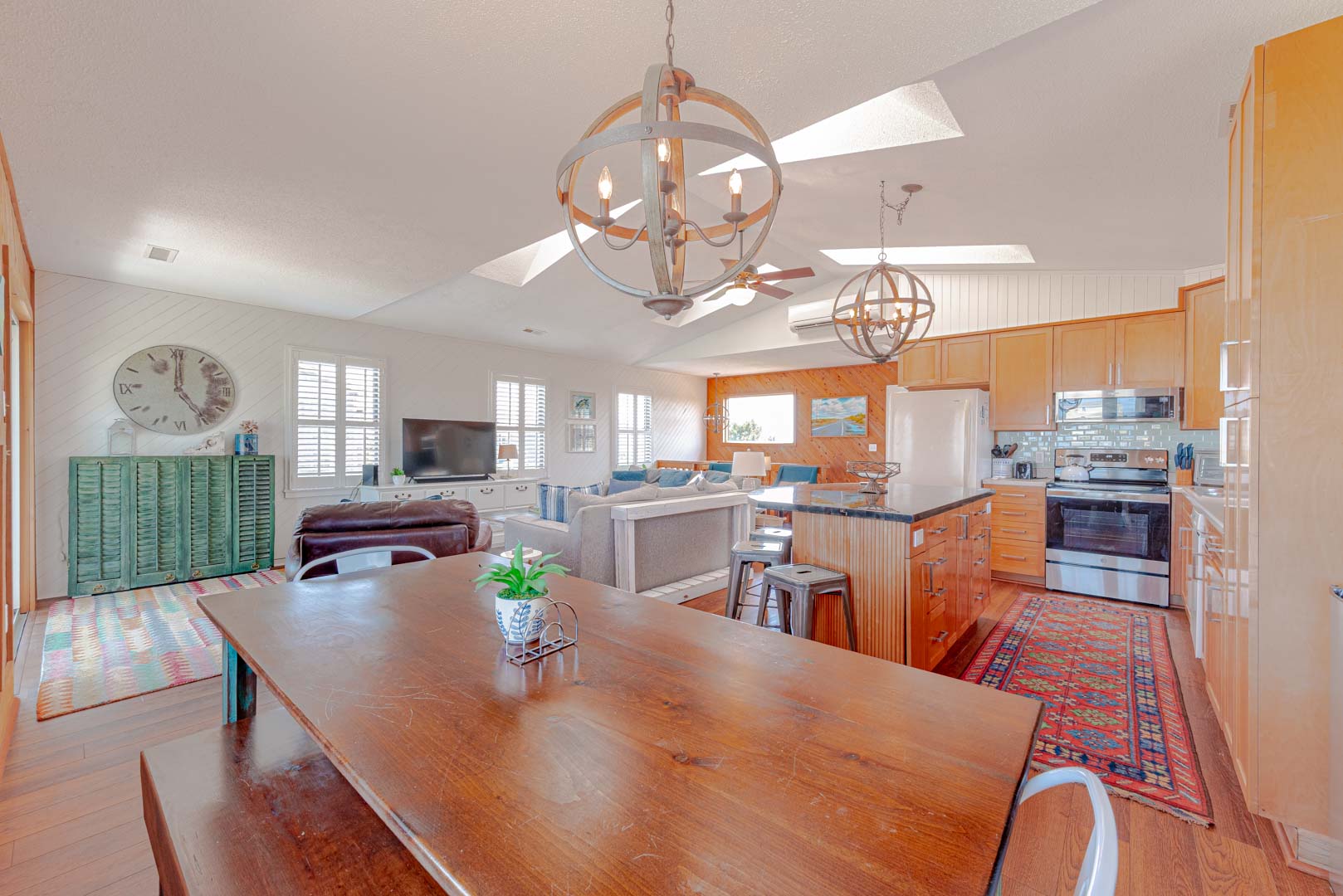Top Level: Living Area, TV; Ocean Facing Pergola Covered Deck, Deck Furniture, Picnic Table, Ocean and Sound Views; Full Hall Bath w/Shower; Kitchen Area, Bar Seating for Four (4); and Dining Area w/Seating for Eight (8).