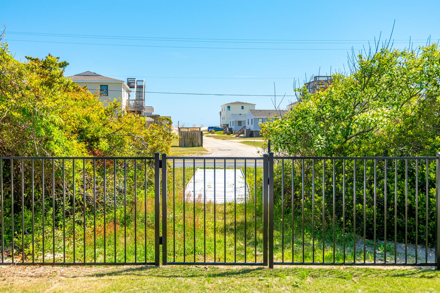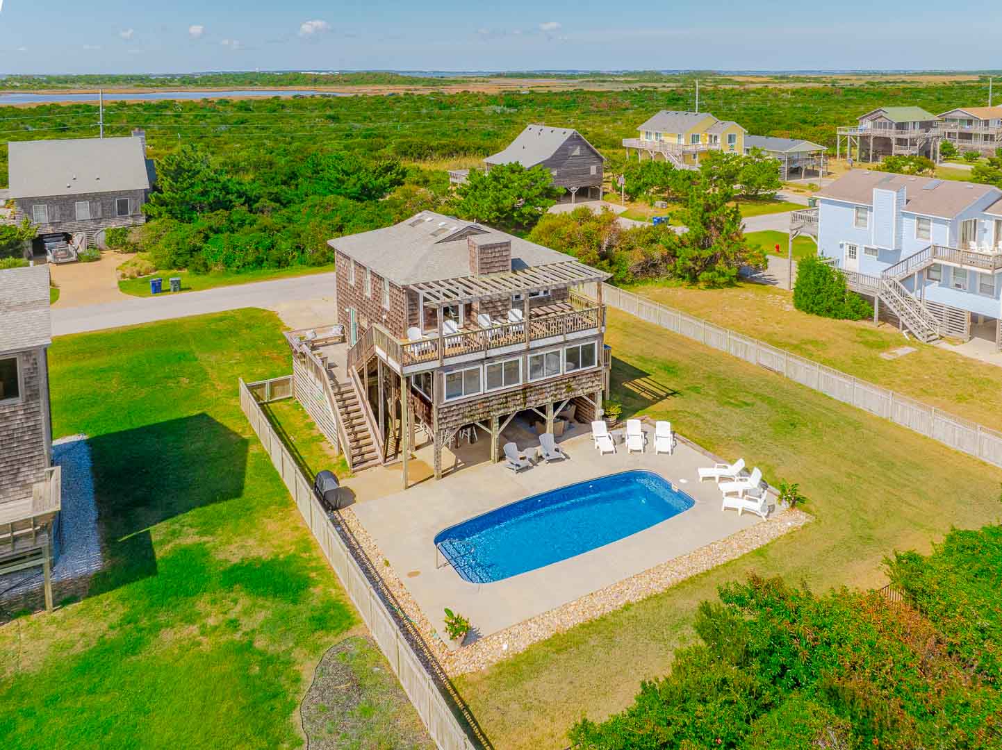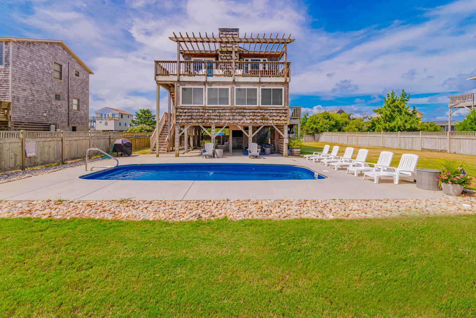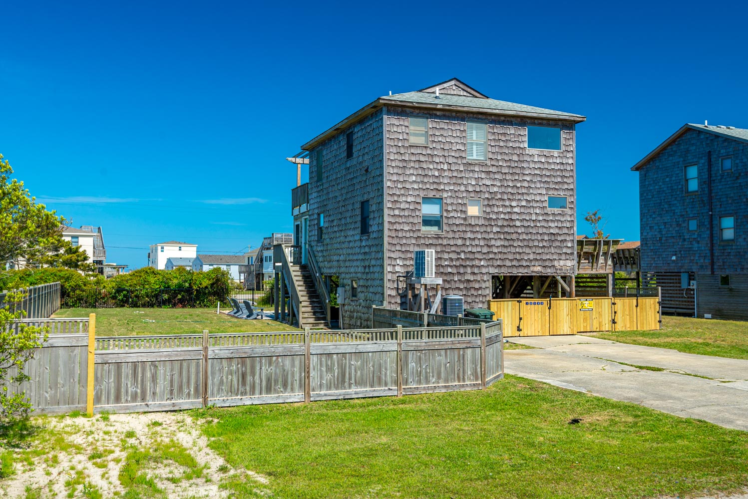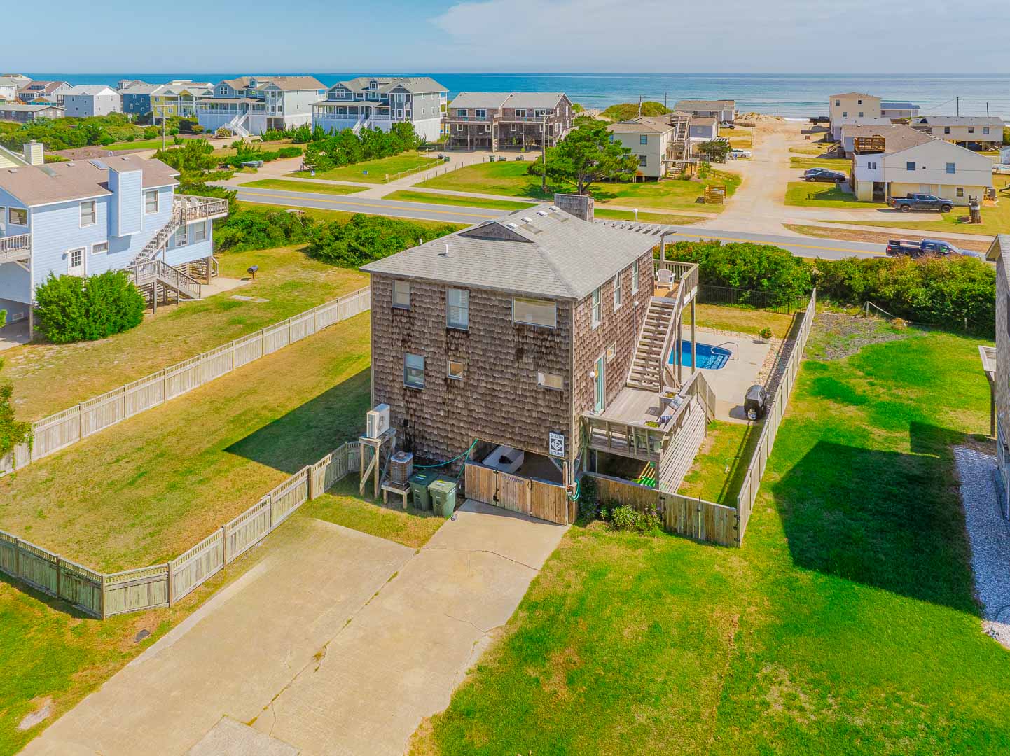 Ground Level: Parking for 4 Cars, Covered Entry, Storage Area, Washer/Dryer, Refrigerator, Commode, 2 Enclosed Outside Showers, Large Fenced-In Yard, Covered Sitting Area, TV, 10 Person Bar-Height Table, Private 14x30 Swimming Pool (Open Seasonally), Gas Grill, and Walkway Across to Beach Road.