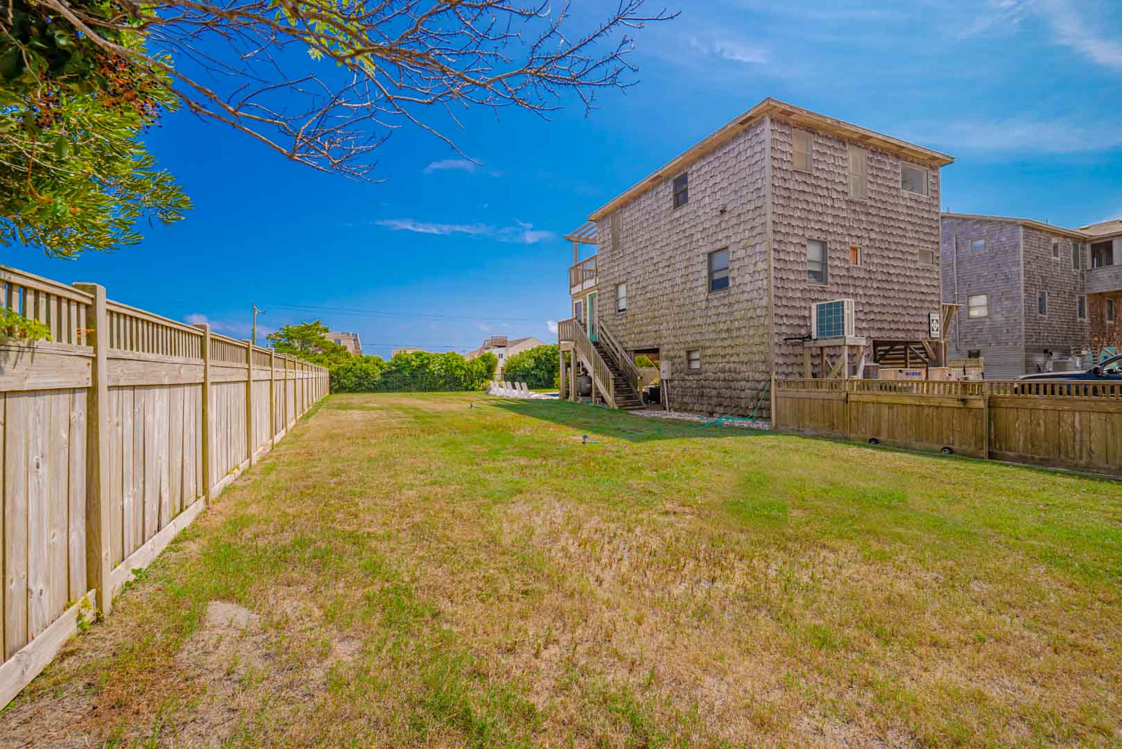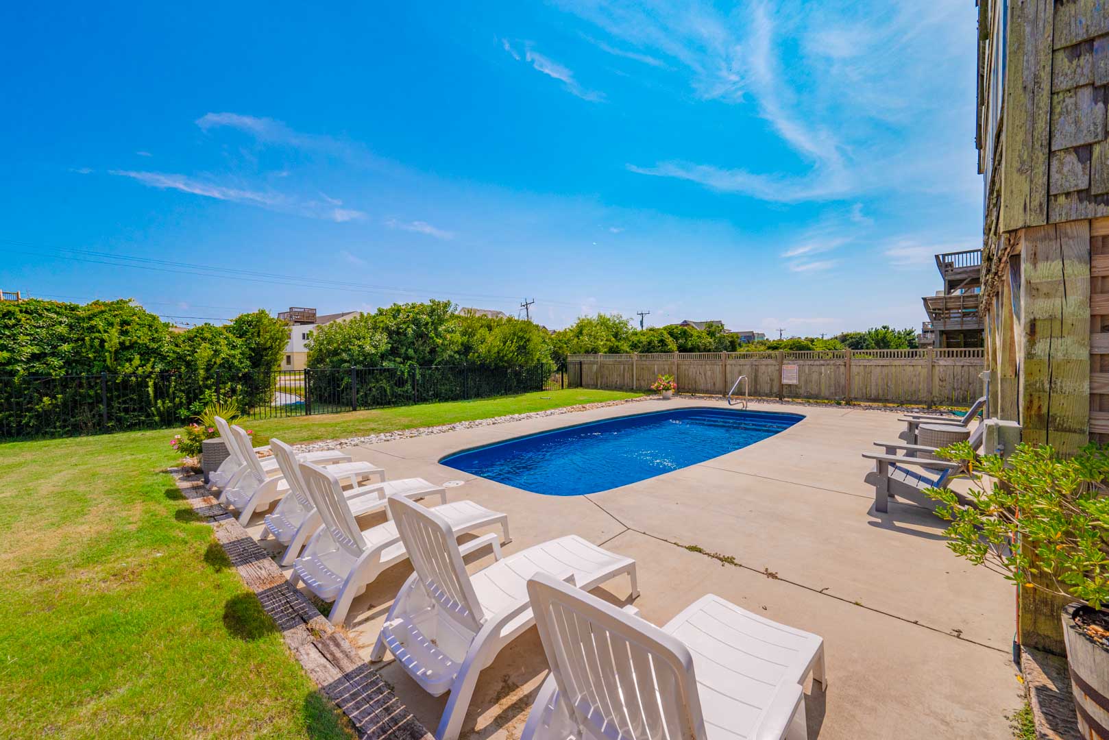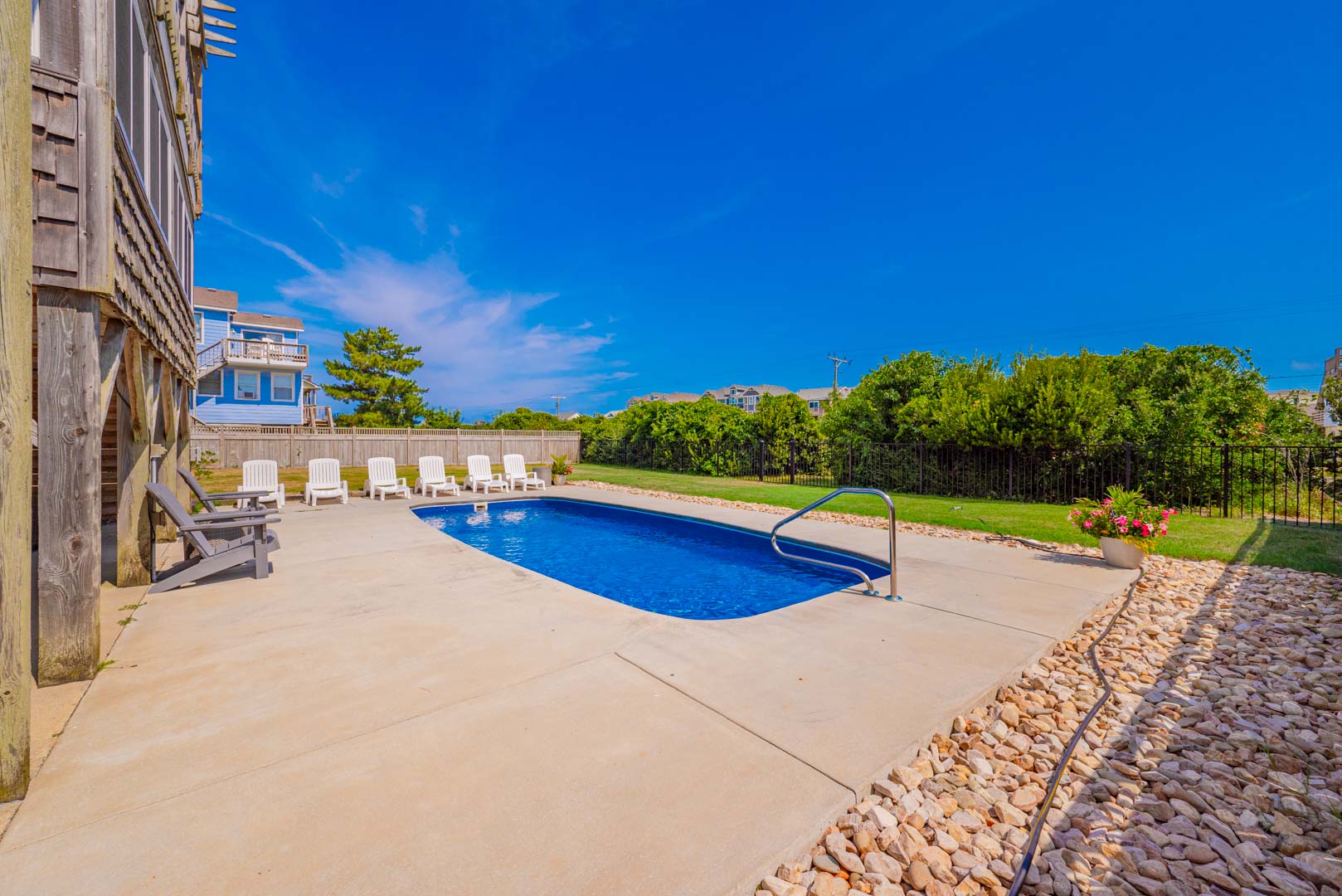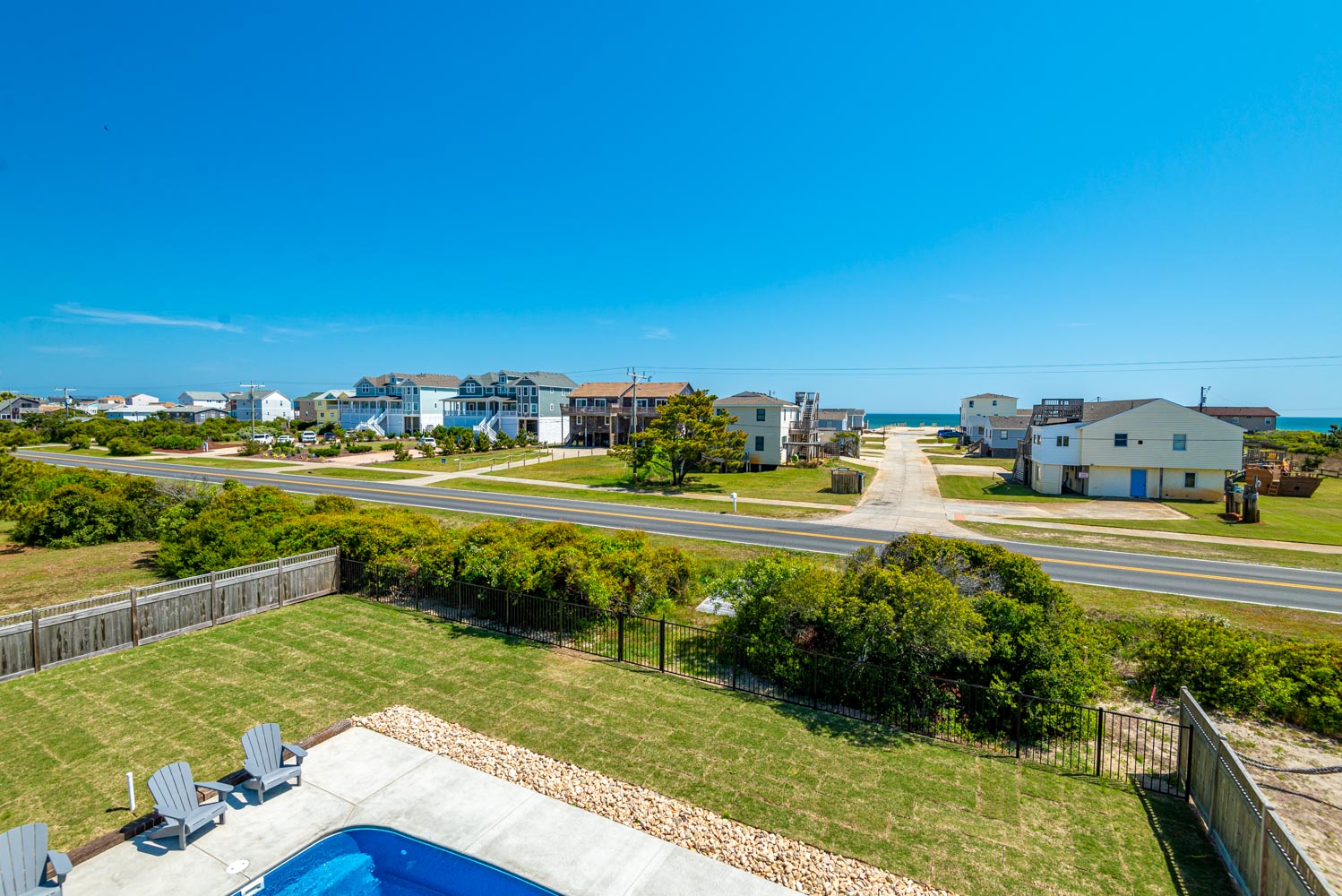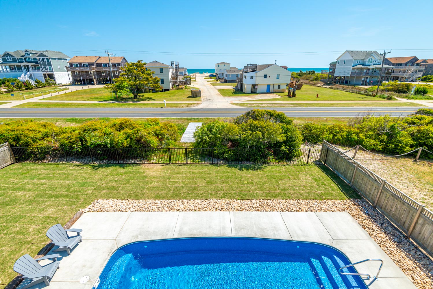 Ground Level: Parking for 4 Cars, Covered Entry, Storage Area, Washer/Dryer, Refrigerator, Commode, 2 Enclosed Outside Showers, Large Fenced-In Yard, Covered Sitting Area, TV, 10 Person Bar-Height Table, Private 14x30 Swimming Pool (Open Seasonally), Gas Grill, and Walkway Across to Beach Road.