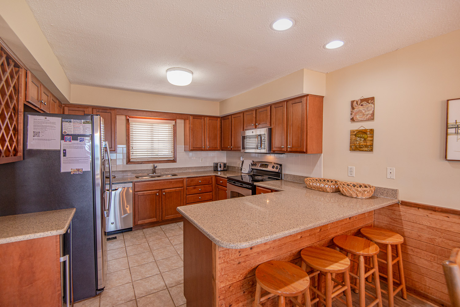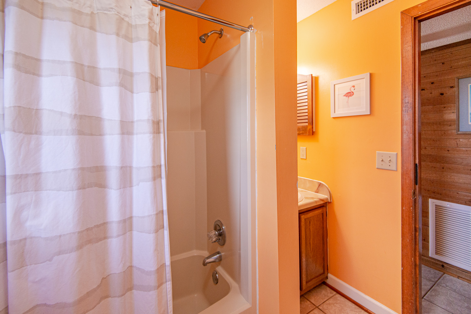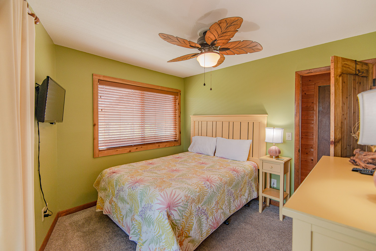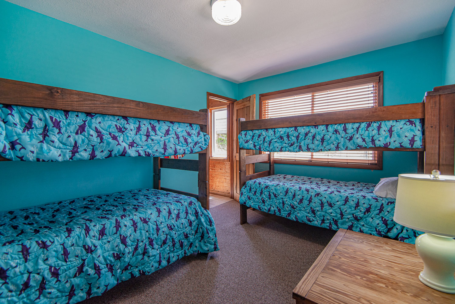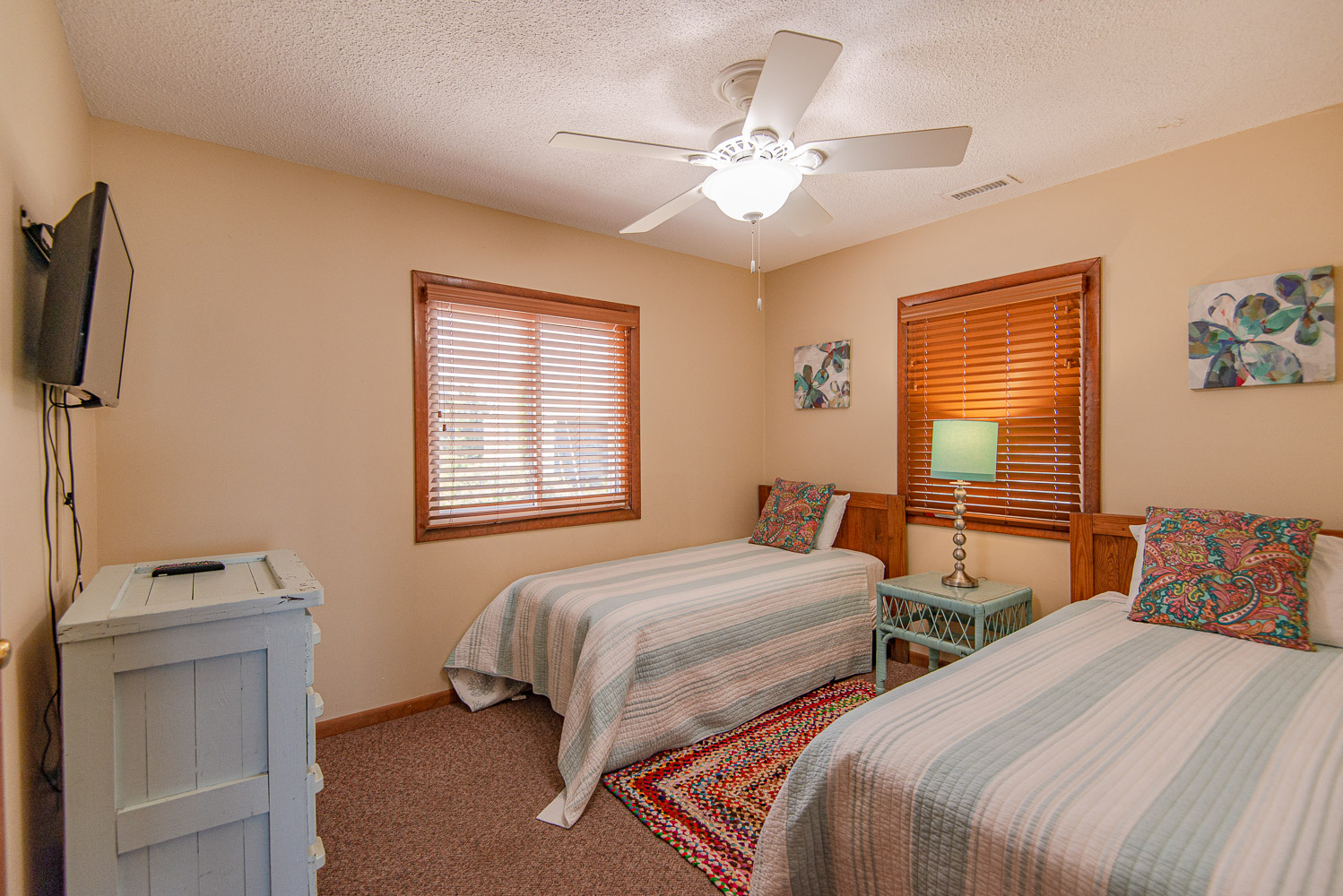 Level 1: 4 Bedrooms (Private Suite w/Queen, TV, Full Bath w/Shower; 1 w/Queen, TV; 1 w/2 Bunk Sets; 1 w/2 Singles), Full Hall Bath w/Tub/Shower, Laundry Area, and Access to Covered Porch w/Deck Furniture, Enclosed Outside Shower.
