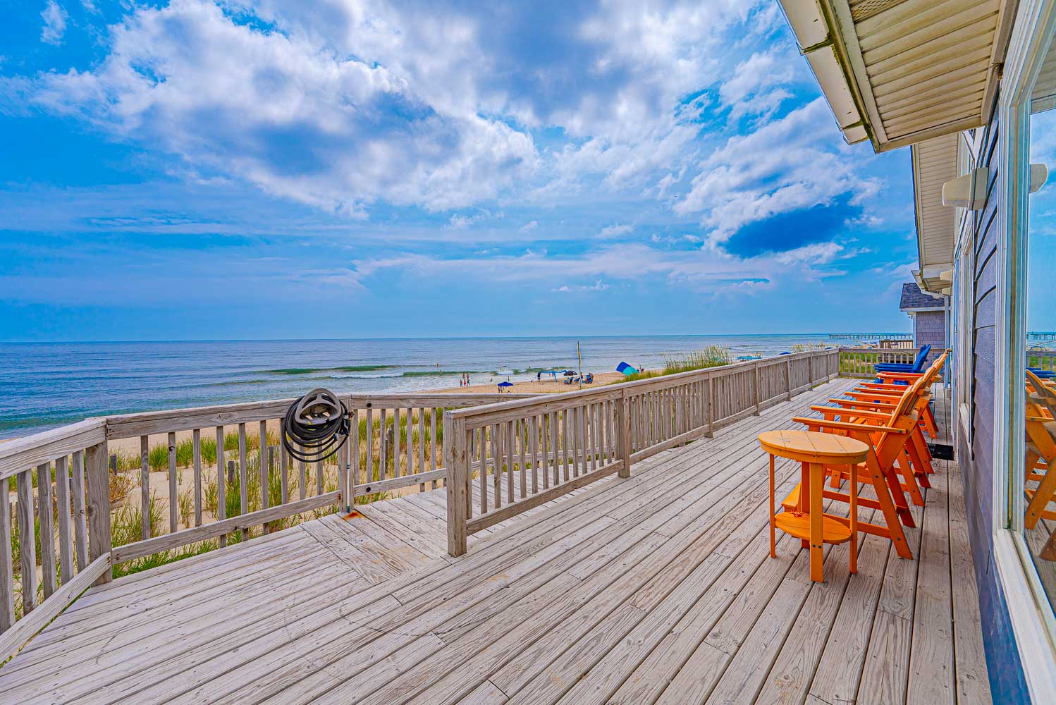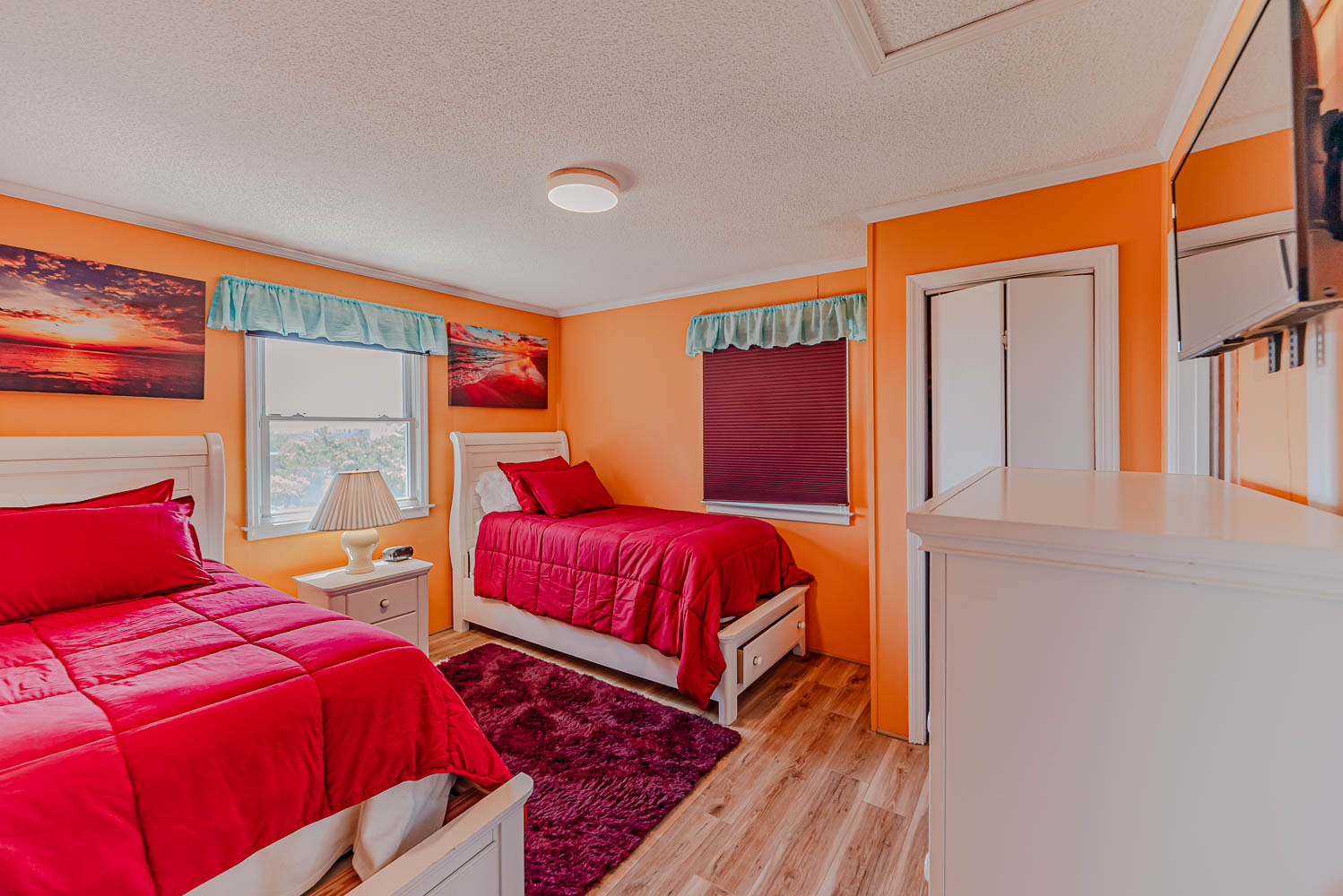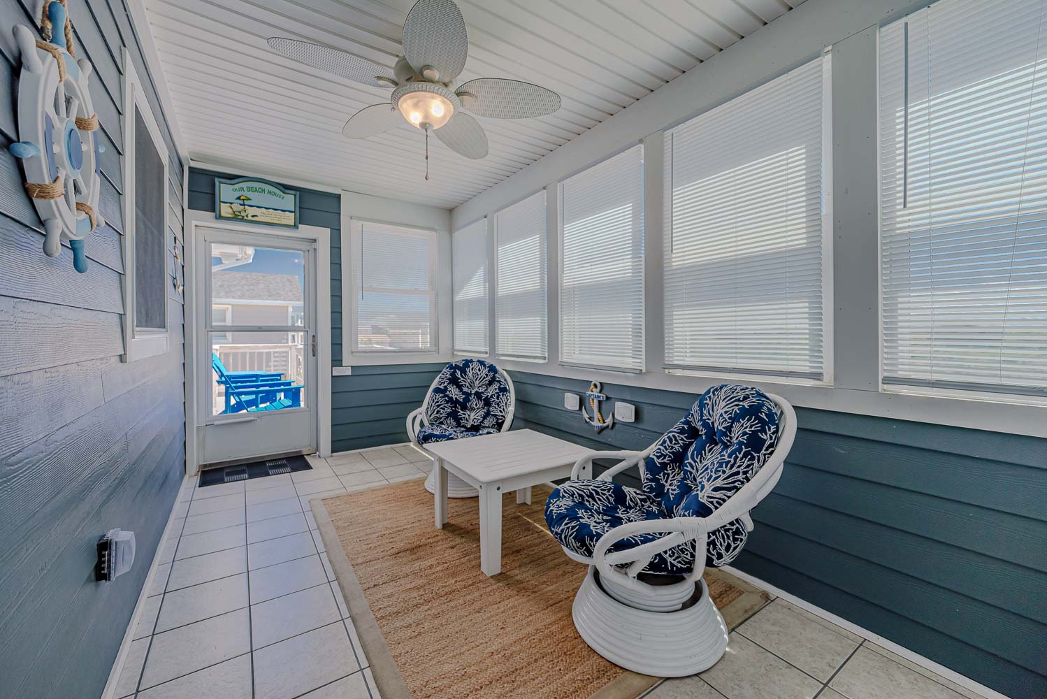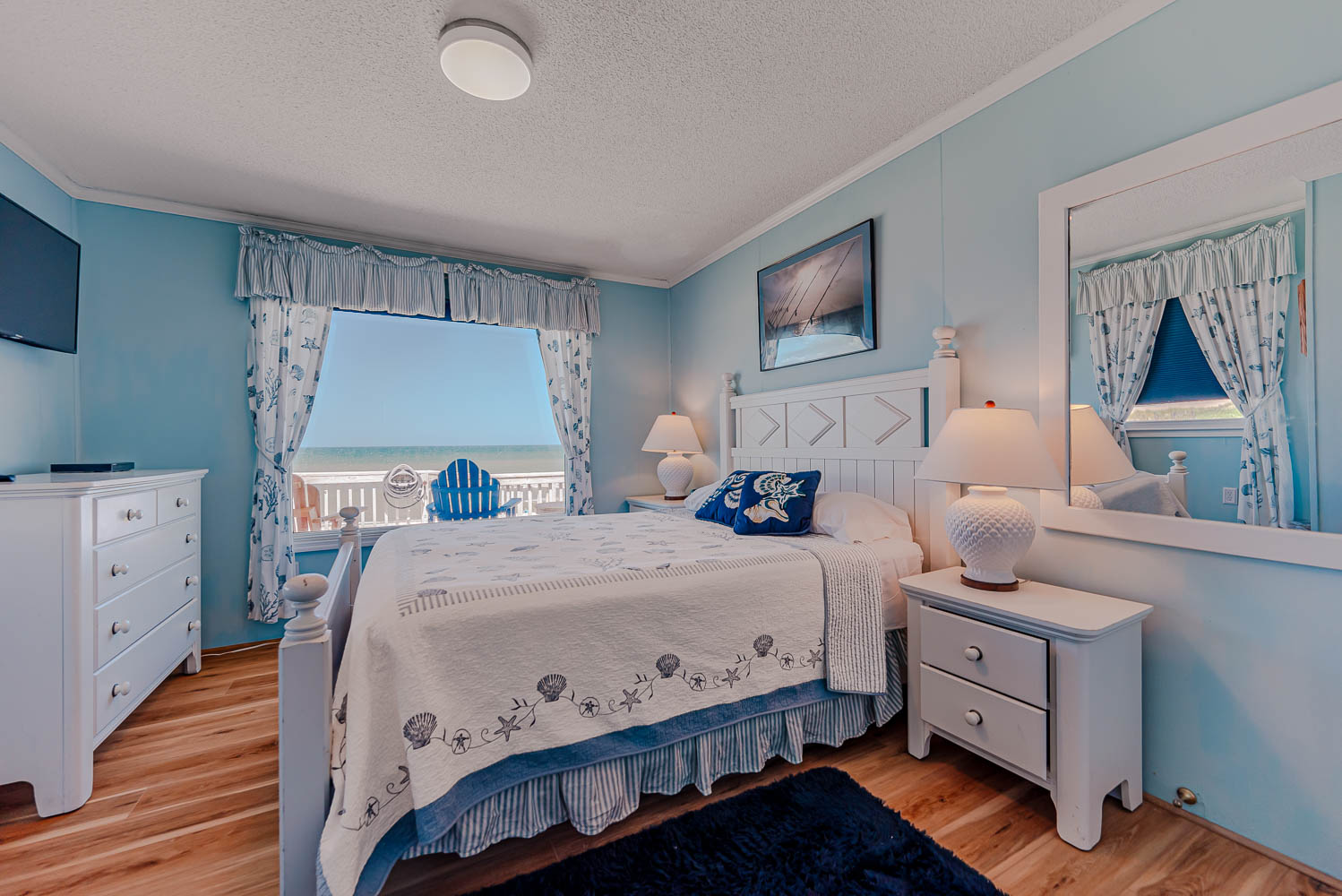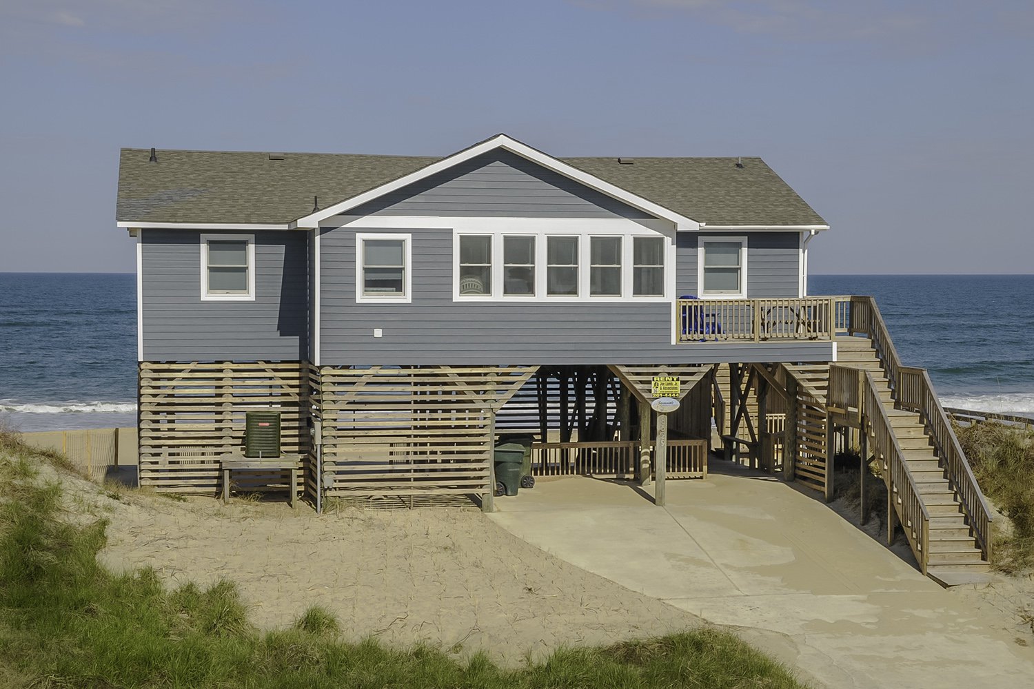 Main Level: Living Area w/Cathedral Ceilings, Flat Panel HDTV, DVD, Ocean & Beach Views, Full Equipped Kitchen w/Bar Seating for Four (4), Dining Table w/Seating for Four (4), 4 Bedrooms (2 w/Queens, Fantastic Ocean Views; 1 w/2 Singles; 1 w/2 Bunk Sets), 2 Full Hall Baths w/Tub/Shower, Florida Room w/Ceramic Floors, Furniture, Ceiling Fan, & Front Sun Deck w/Picnic Table.