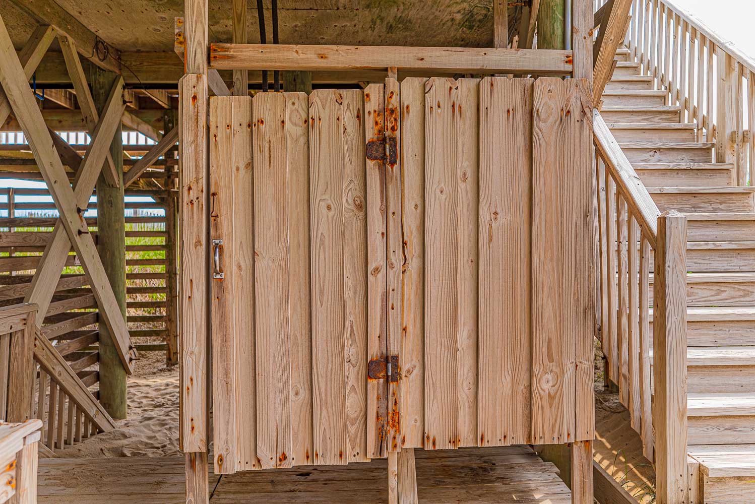 Ground Level: Parking for 3 Cars, Ramp to Main Level, Outside Shower, & Charcoal Grill.