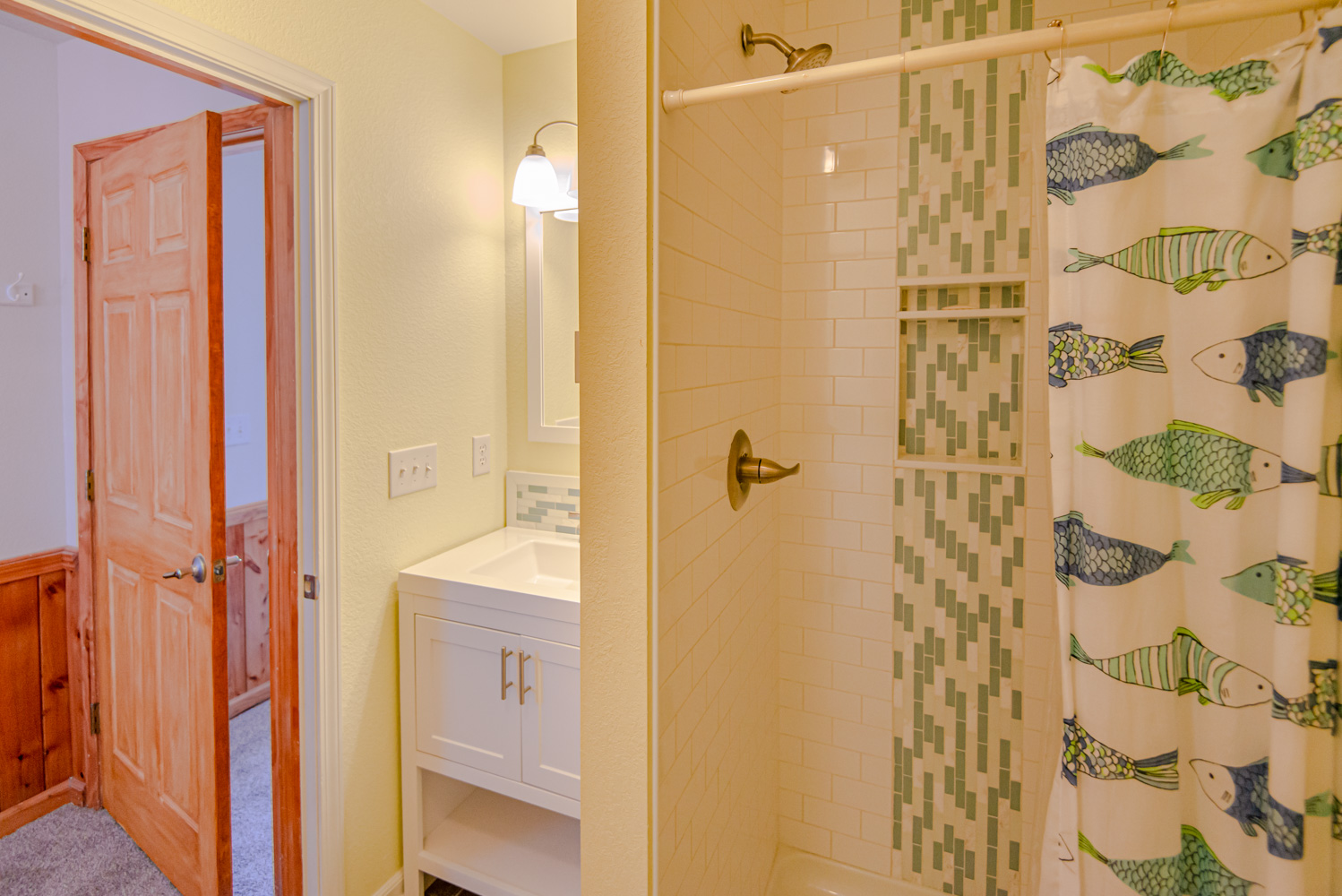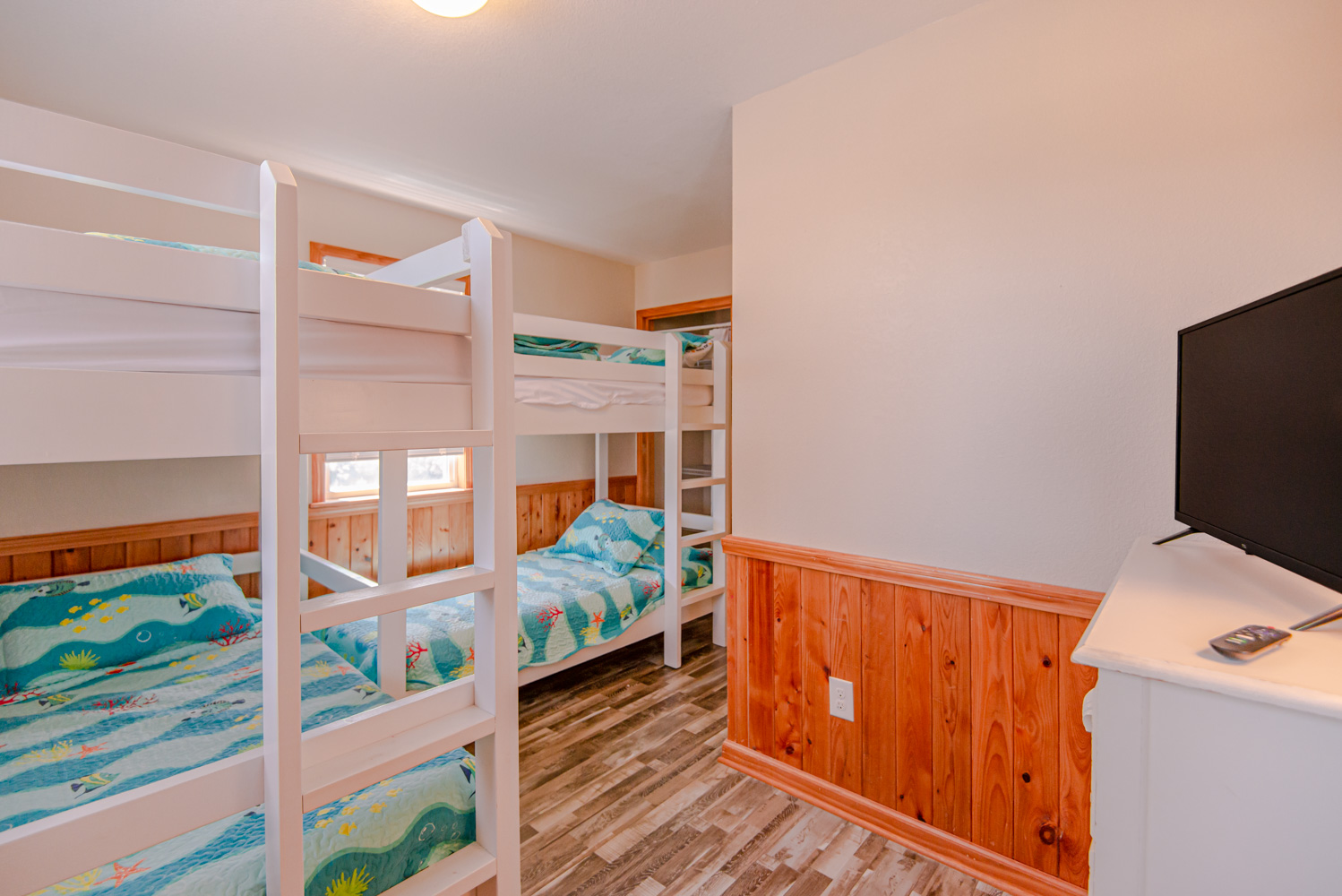 Mid Level: 4 Bedrooms (3 Private Suites w/Queens, TVs, Full Baths w/Walk-In Showers; Private Suite w/2 Bunk Sets, TV, Full Bath w/Tub/Shower), and Covered Deck.
